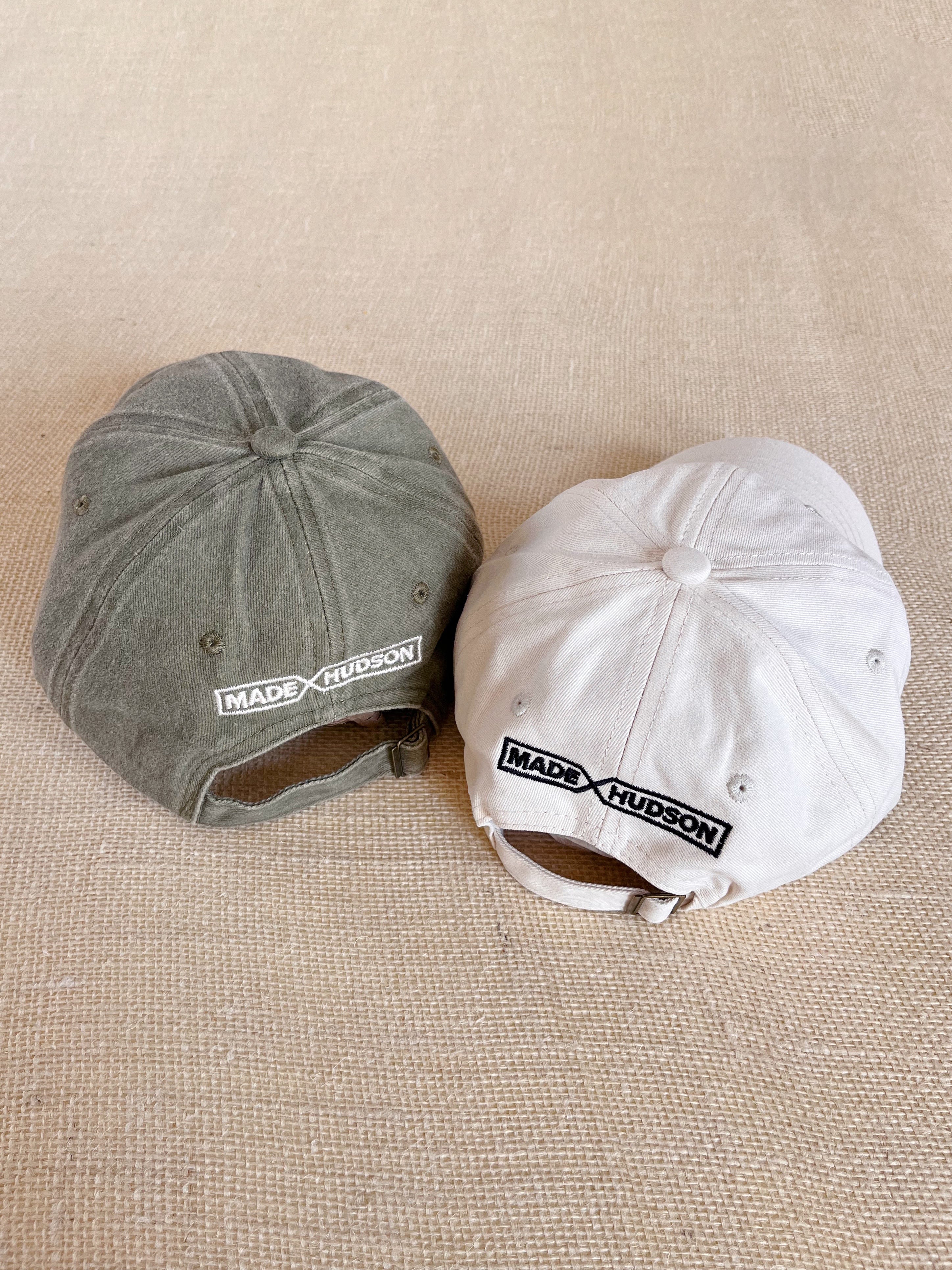 If you love Catskill like we love Catskill, show it with our classic cotton baseball cap embroidered with CATSKILL on the front and our Made X Hudson logo on the back, in your choice of ivory (with black stitching) or olive green (with off-white stitching).