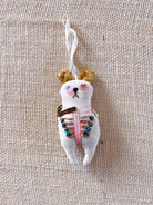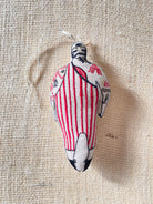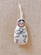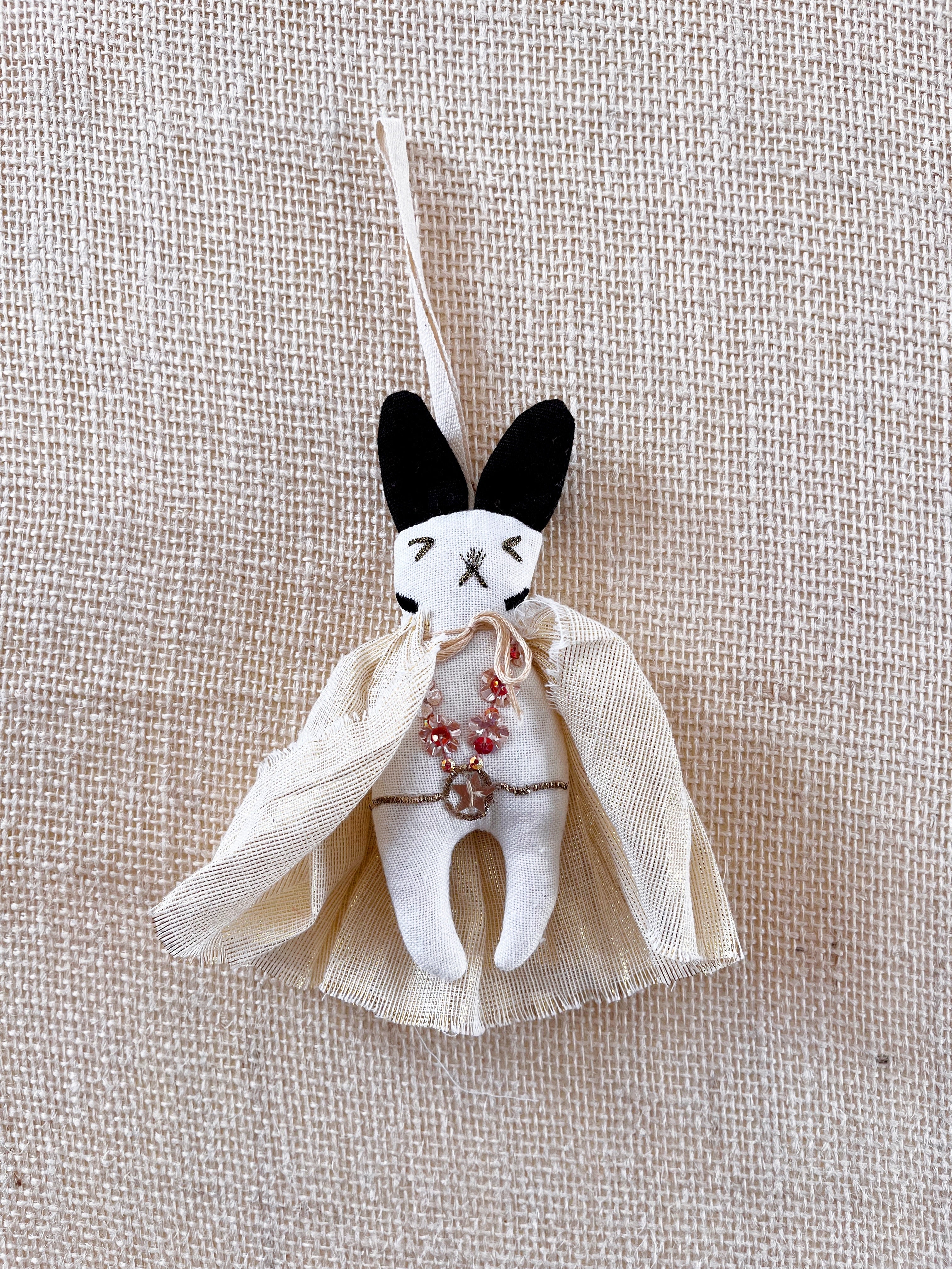 These heirloom-style ornaments are crafted of natural cottons and linens, stuffed with cotton, and feature assorted embroidery and embellishments. Each has a ribbon at the top for hanging from a hook, doorknob, handbag or wherever you like — and they also make beautiful ornaments on a Christmas tree.