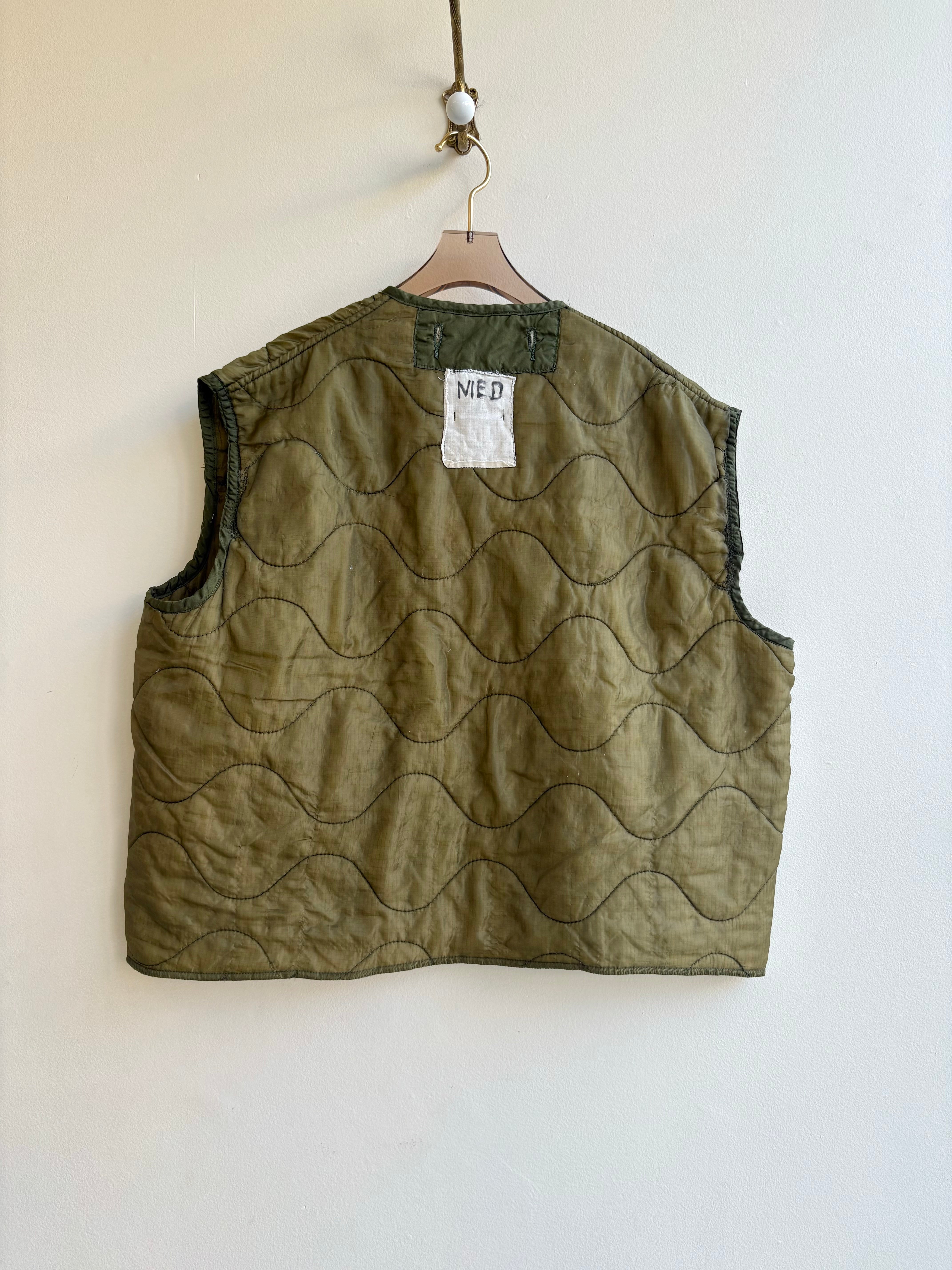 Olive Green Army Liner Quilted Vest w/ Orange Zipper & Pockets (Reworked)