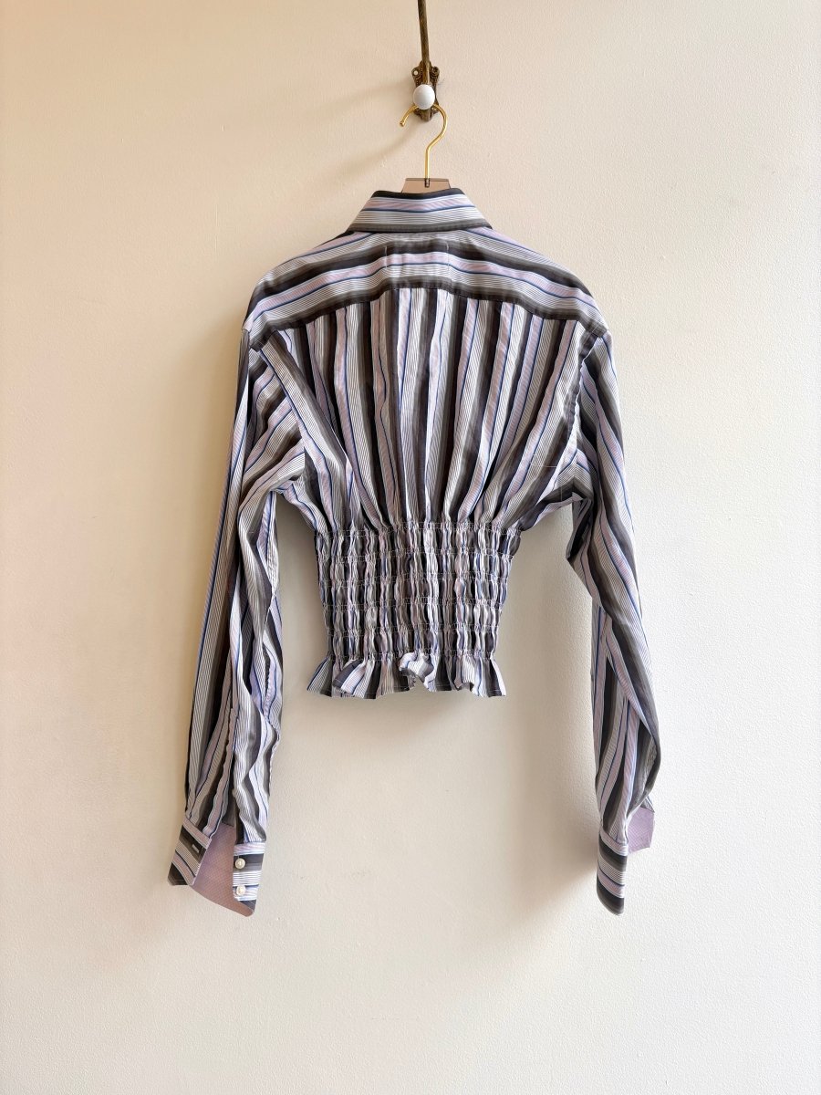 The George Top | Grey, Brown, Red, & Blue Striped Button Down Top w/ Smocked Waist (Reworked)