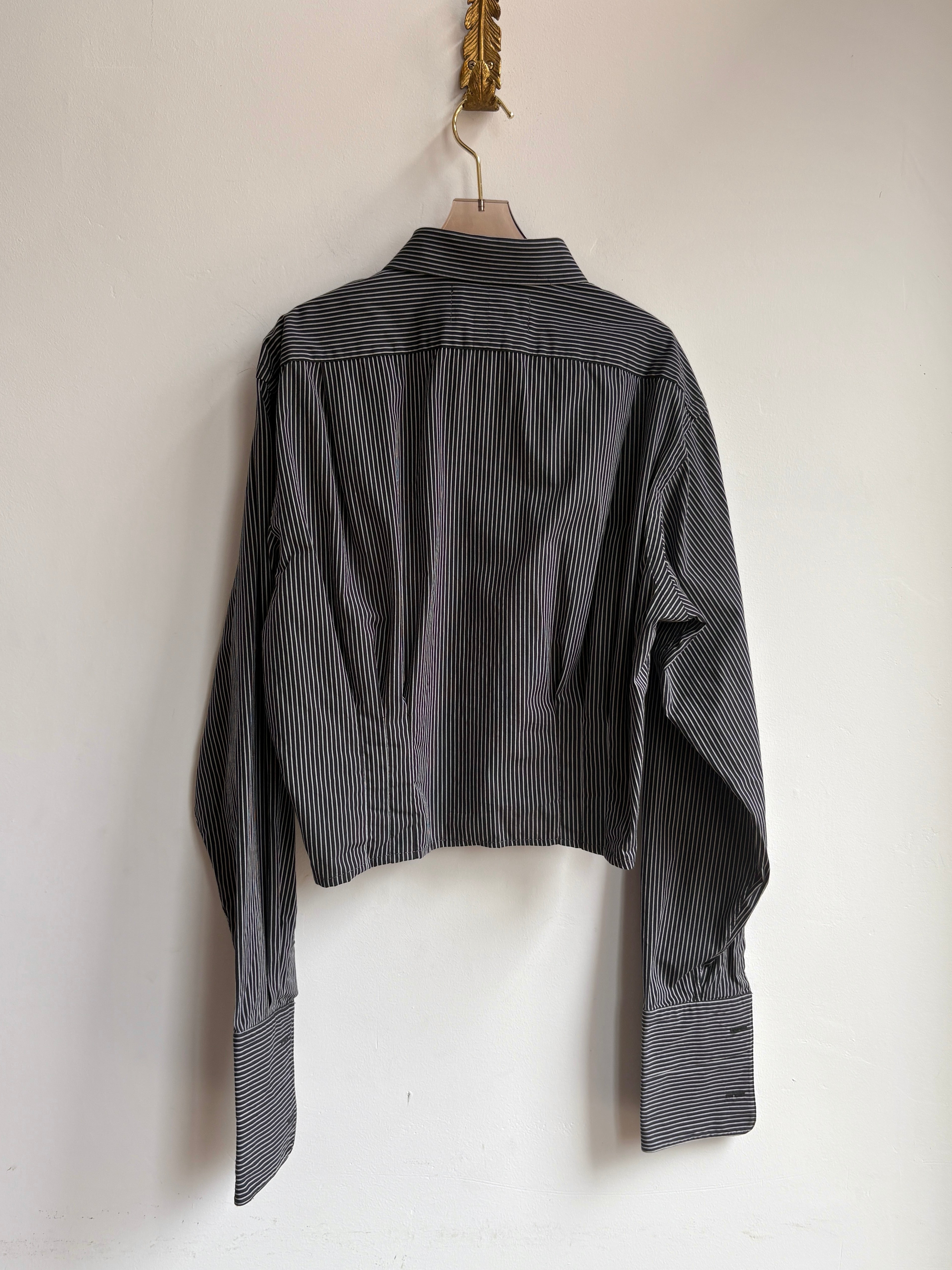The Kevin Top | Black w/ Grey Micro Stripe Button Down w/ Gathered Waist & Pocket (Reworked)