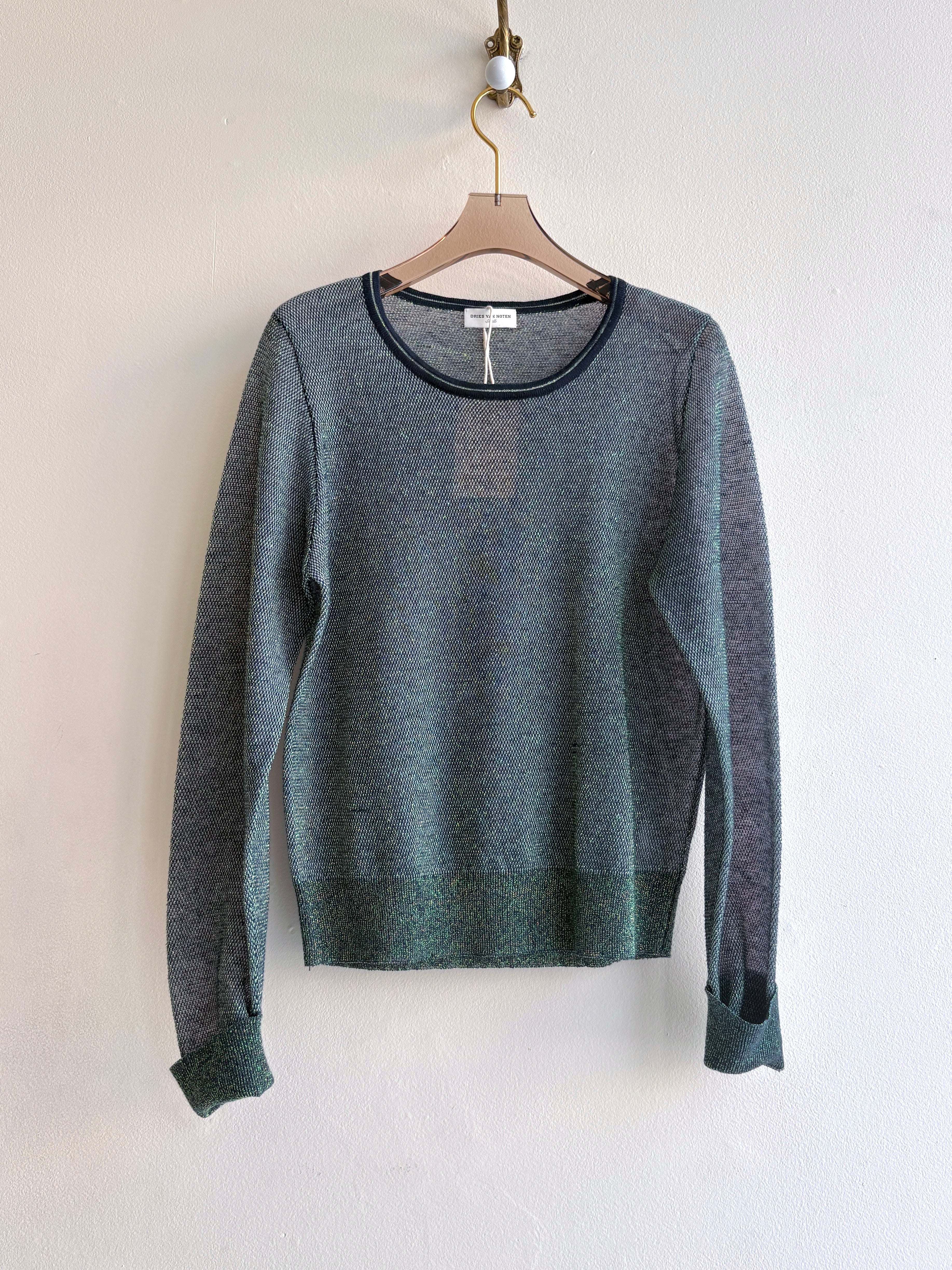 This metallic green and navy crewneck sweater is by Dries Van Noten, sourced by Leslee Vintage. Dressed up or down this shimmering, semi-sheer sweater will travel with you in any season and for any occasion.