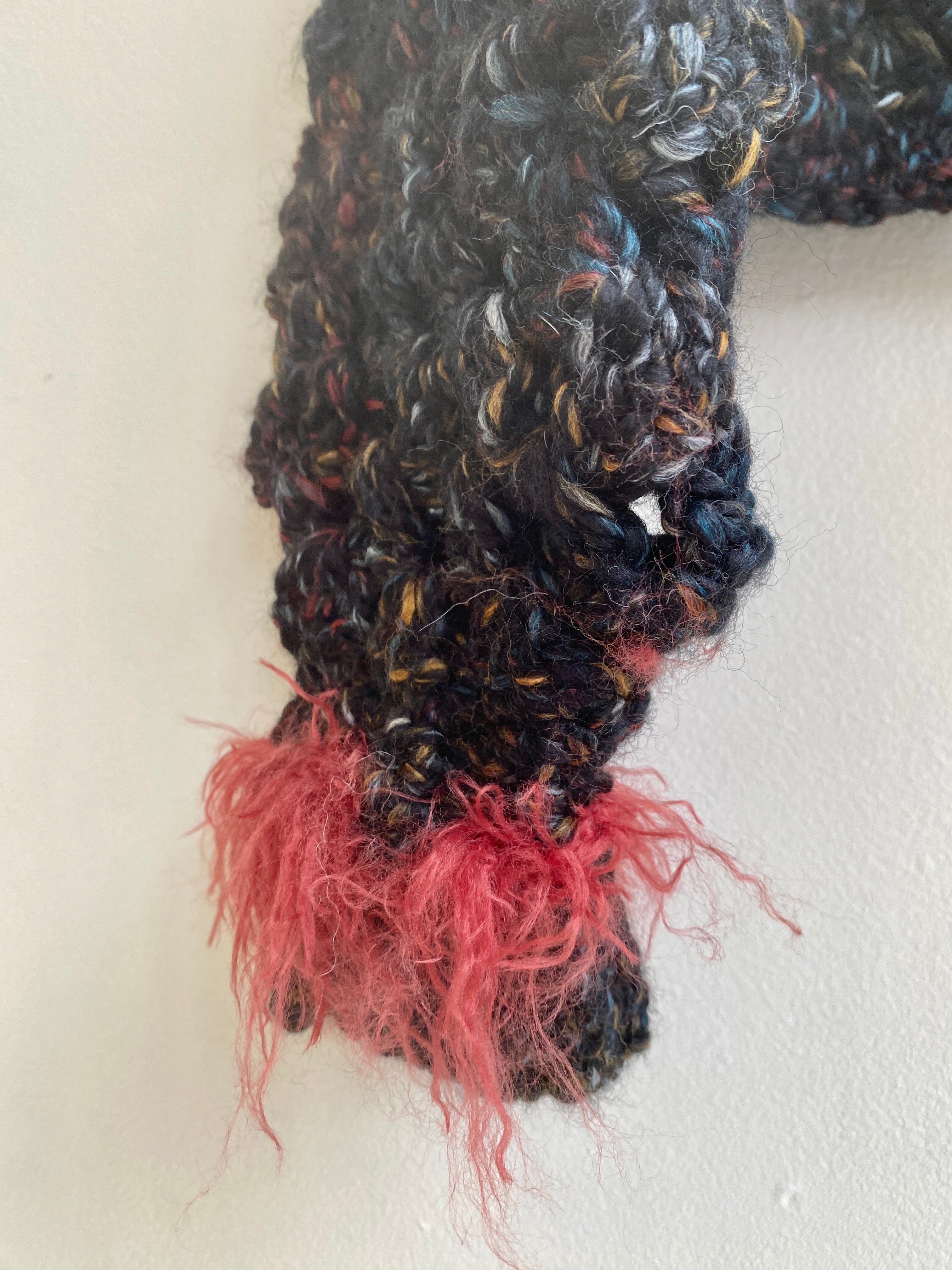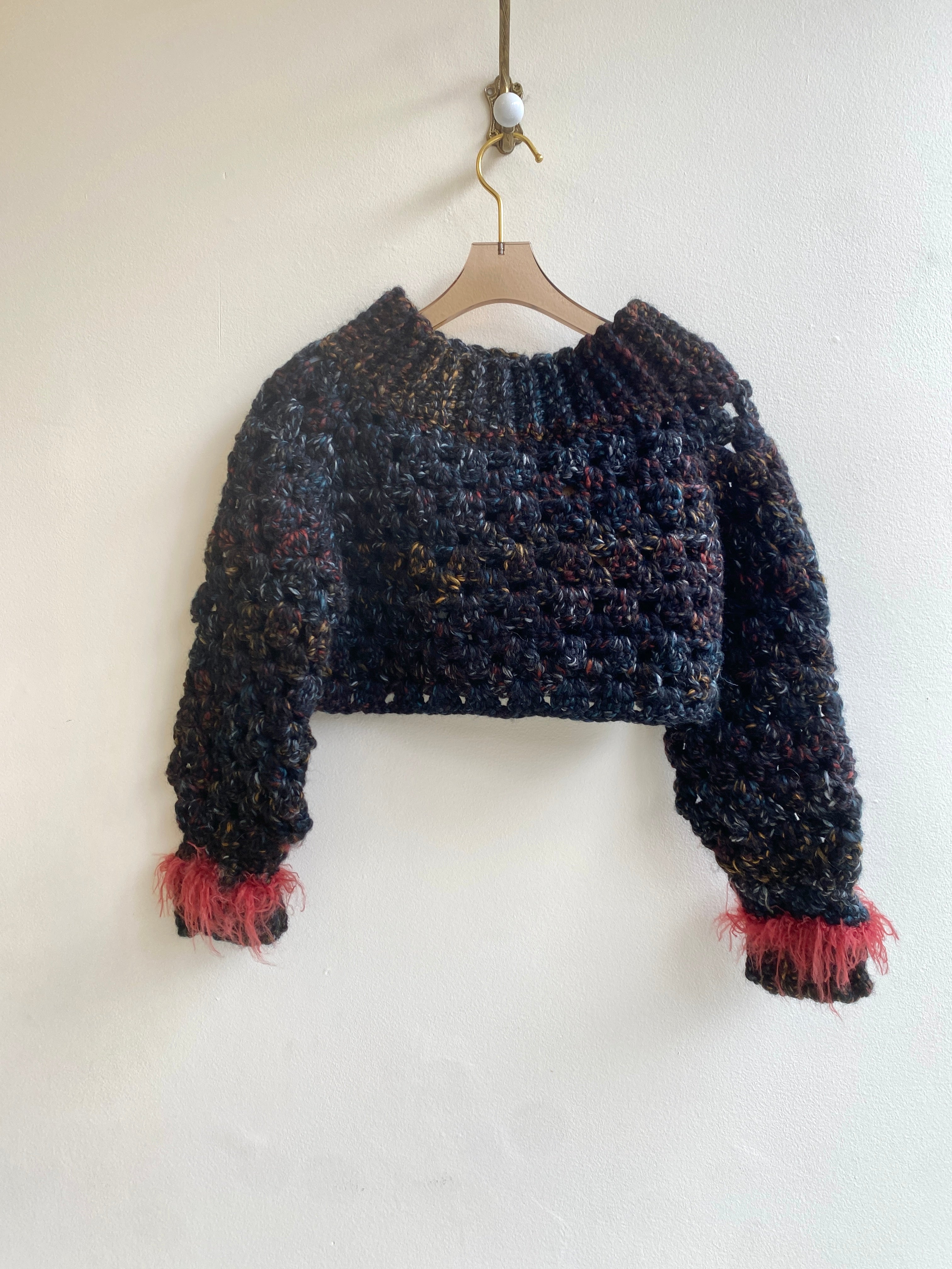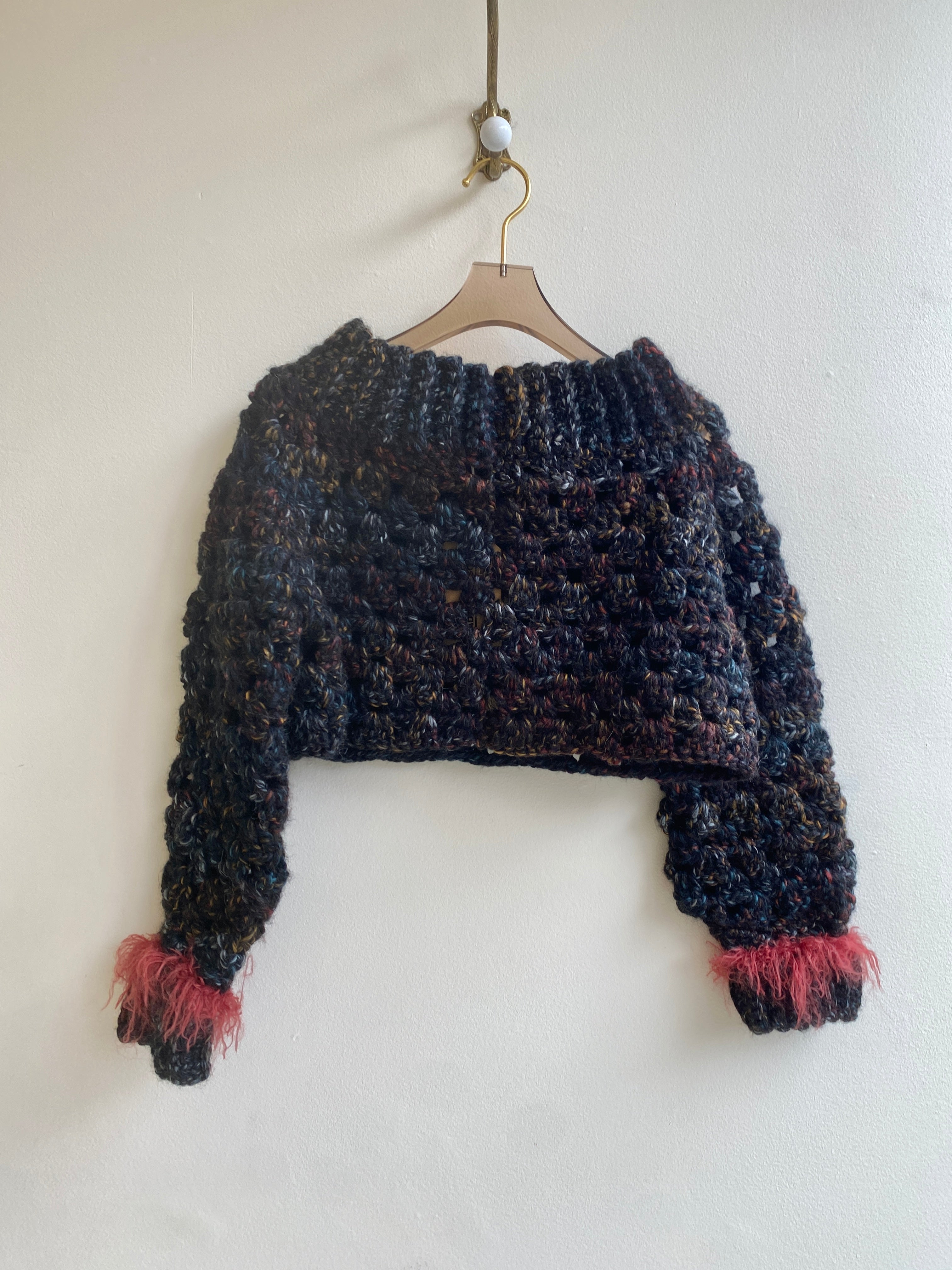 Wool Hand Crochet Cropped Sweater Black Spice w/ Red Faux Fur