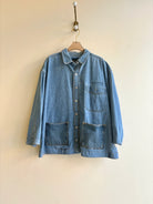 This Olga Ella three pocket denim shirtjacket was once a mere work shirt. It’s been given new life with added denim pockets, relaxed tailored arm, and a back patch made of squares of toned denim.