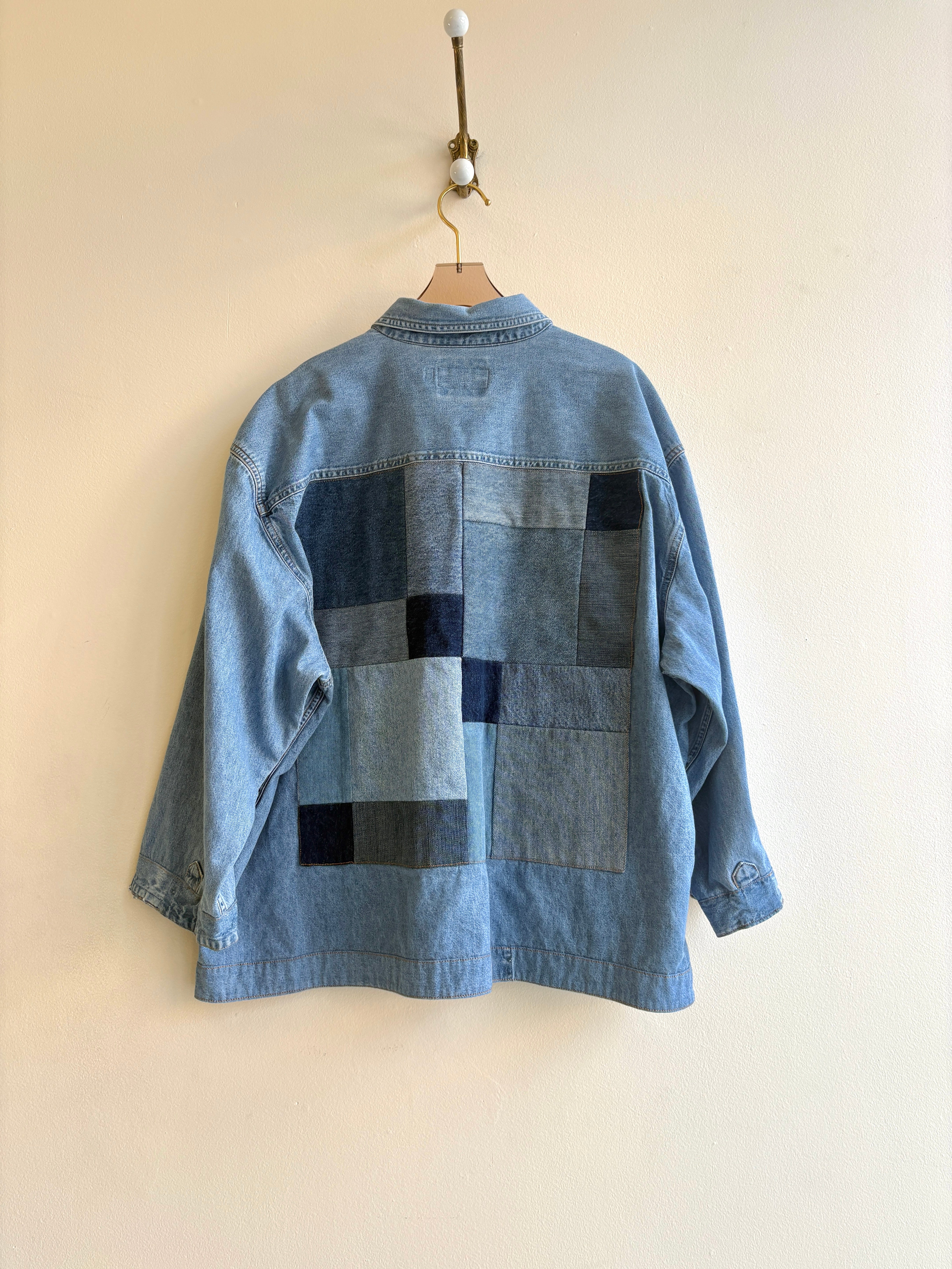 The denim pieces involved are different shades, and most or all are from other vintage garments. All of the wear and patina in the fabrics contributes to the unique character of the piece.