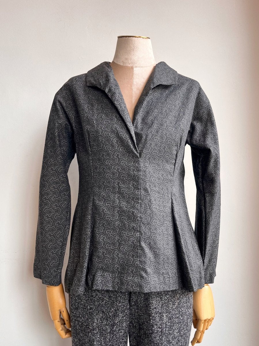 The Ulrike blouse by Nahas is crafted from premium cotton in a distinctive grey and black swirling dash pattern. This finely tailored blouse features a refined lapel collar with a V-neckline, underarm gussets, and precision shaping darts for a clean silhouette. Each Nahas piece is meticulously sewn one at a time, here at our Made X Factory, featuring tailored lines and high-quality fabrics that can be mixed and matched across styles.