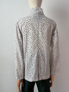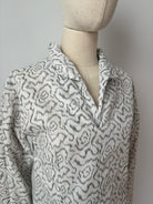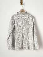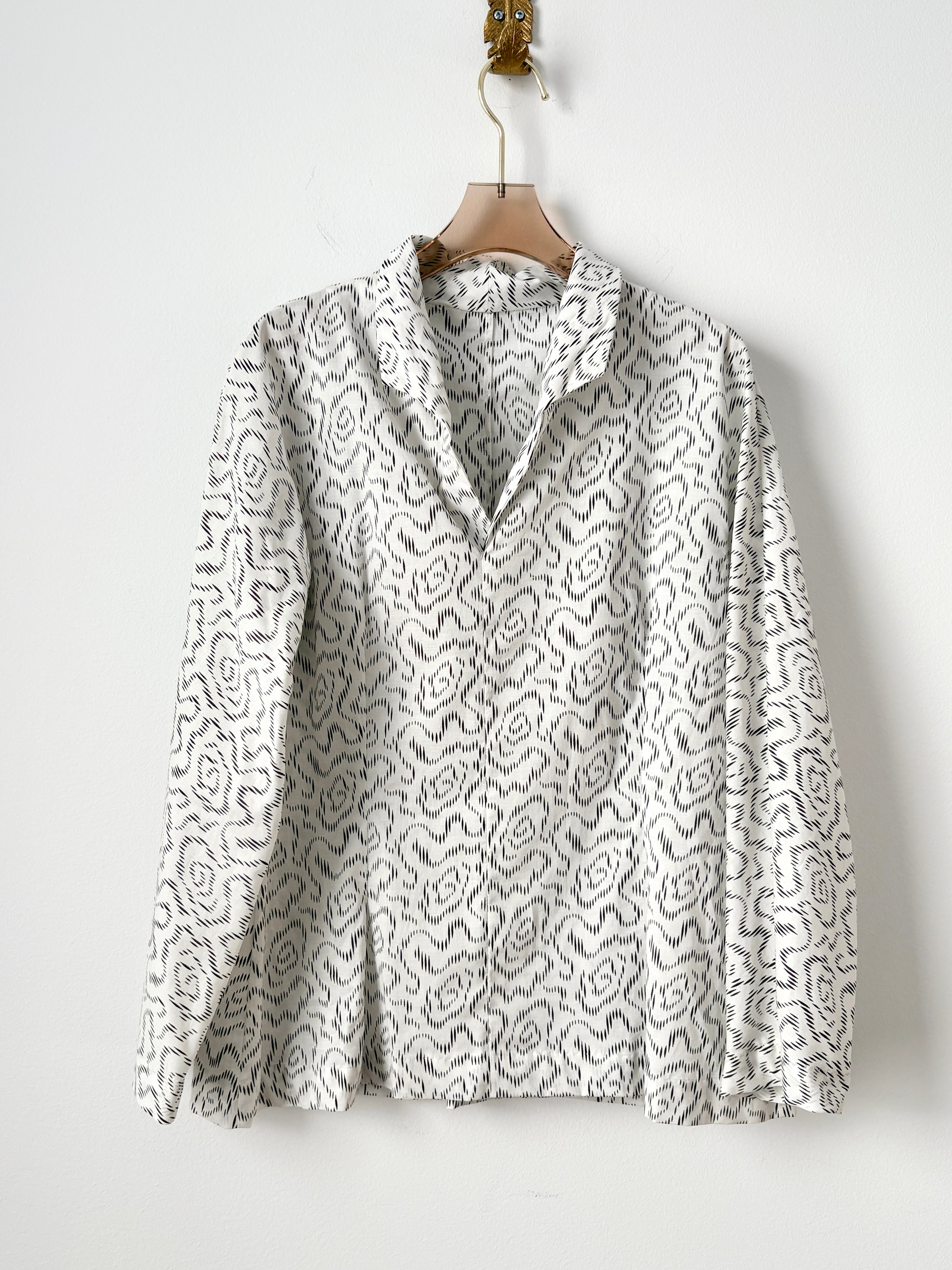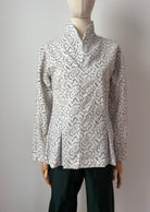 Experience the artistry of the Ulrike blouse by Nahas, exquisitely crafted from pure, premium cotton. Its distinctive white-and-black dash motif forms a sophisticated, swirling pattern, evoking an air of effortless elegance. Impeccably tailored, the blouse boasts a refined lapel collar with a graceful V-neckline, thoughtfully designed underarm gussets, and precision shaping darts for a flawless silhouette. Each piece is meticulously sewn in small batches by the esteemed MXH Atelier, showcasing crisp, architectural lines and bespoke fabrics reserved for the discerning connoisseur.