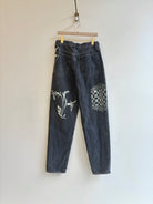 These hand painted black jeans by Touch Threads feature mixed quilt and folk art motifs. An off white hex circle over the top hip and patterned checkered motifs over the knees give these pants serious style. Perfect for anyone who wants a simple but powerful statement, to any outfit, for any outing.
