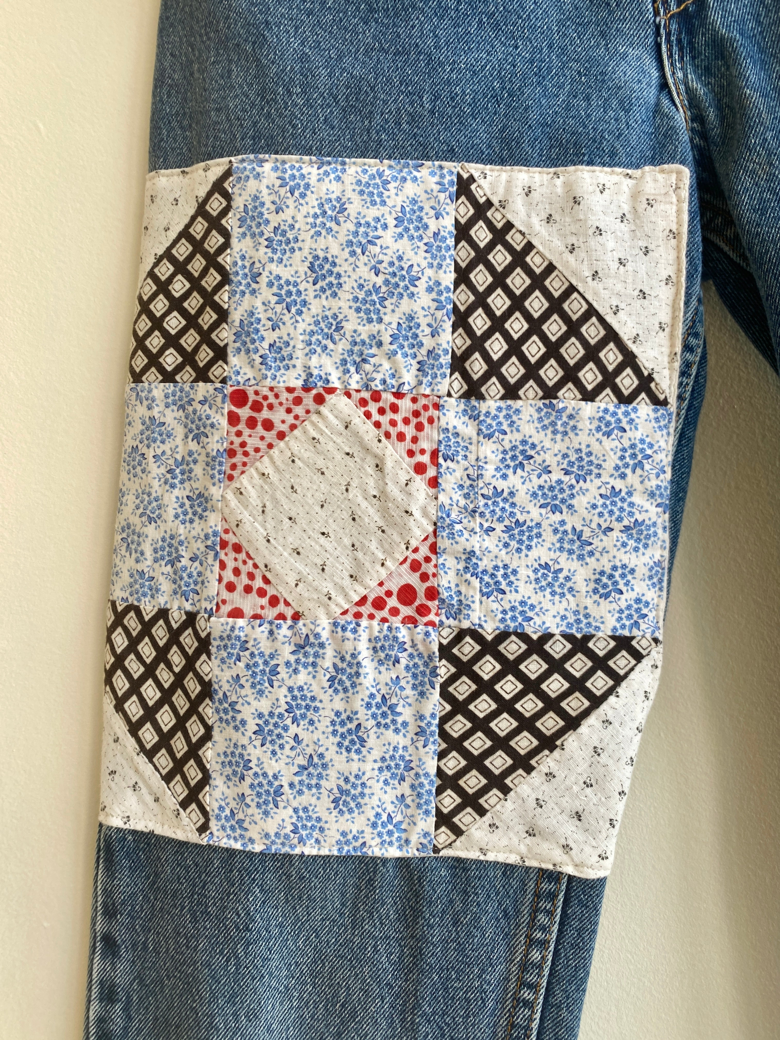 Vintage Orange Tab Levi’s w/ Red, Black, and Blue Quilted Patch Pants (Reworked)