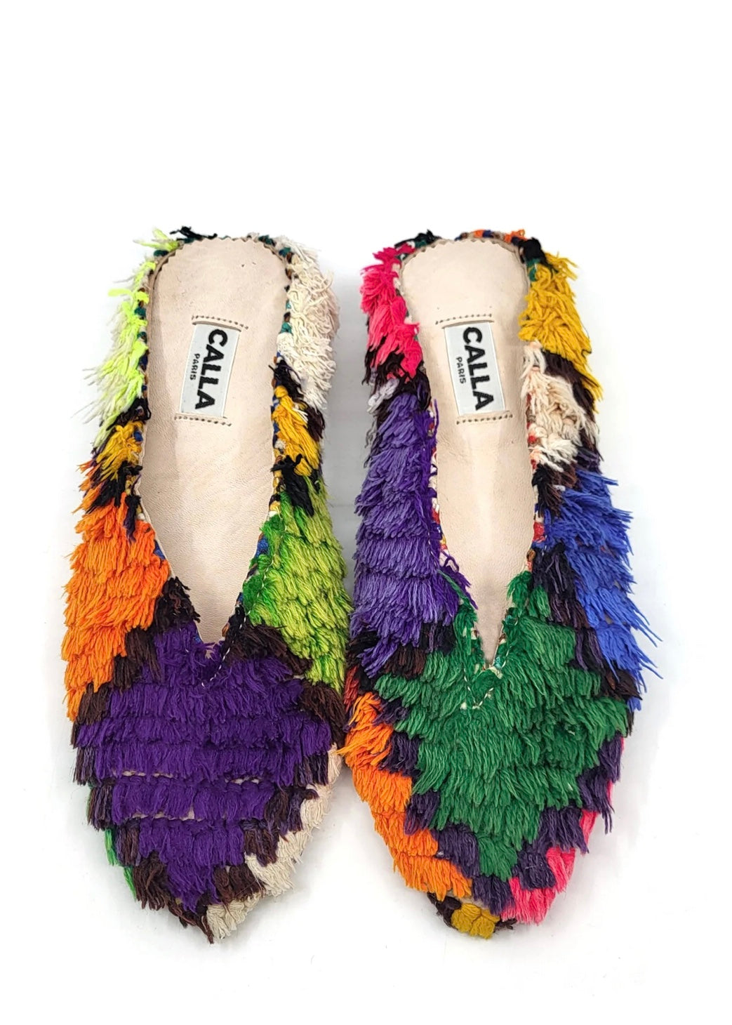 Handmade from upcycled vintage Berber rugs, CALLA’s Babouche mules exist in limited edition - just a handful for each rug. They boast textural details that are one-of-a-kind. Like all Babouche slippers, they are comforable to wear and effortlessly versatile. Every pair supports local Moroccan craftspeople and their traditions.