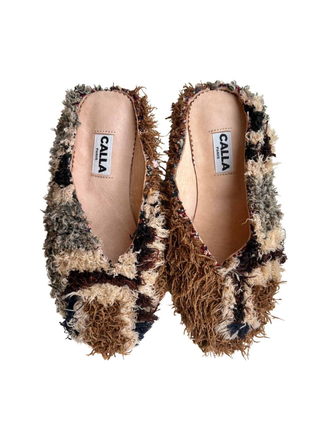 Handmade from upcycled vintage Berber rugs, CALLA’s Babouche mules exist in limited edition - just a handful for each rug. They boast textural details that are one-of-a-kind. Like all Babouche slippers, they are comforable to wear and effortlessly versatile. Every pair supports local Moroccan craftspeople and their traditions.