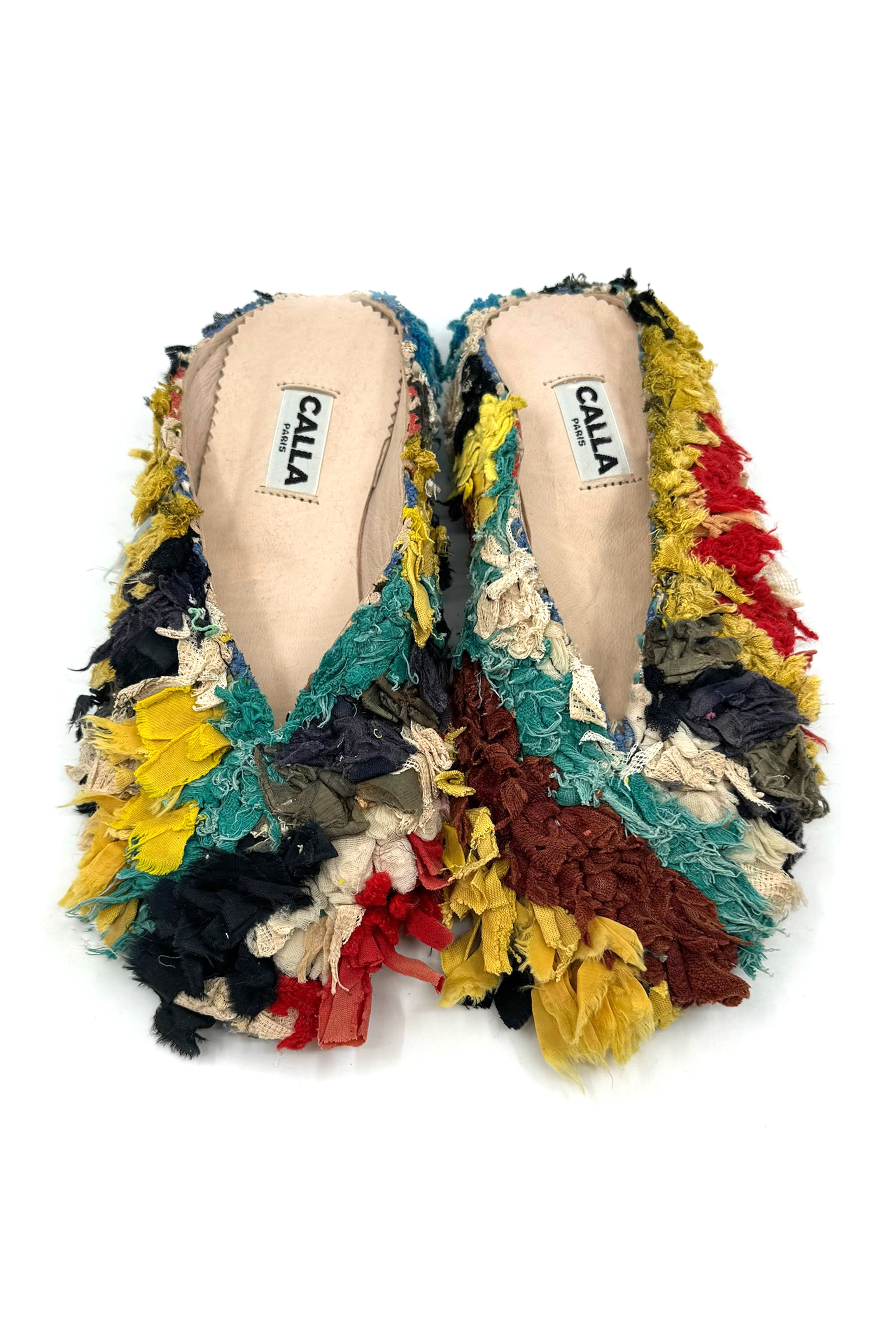 Handmade from upcycled vintage Berber rugs, CALLA’s Babouche mules exist in limited edition - just a handful for each rug. They boast textural details that are one-of-a-kind. Like all Babouche slippers, they are comforable to wear and effortlessly versatile. Every pair supports local Moroccan craftspeople and their traditions.