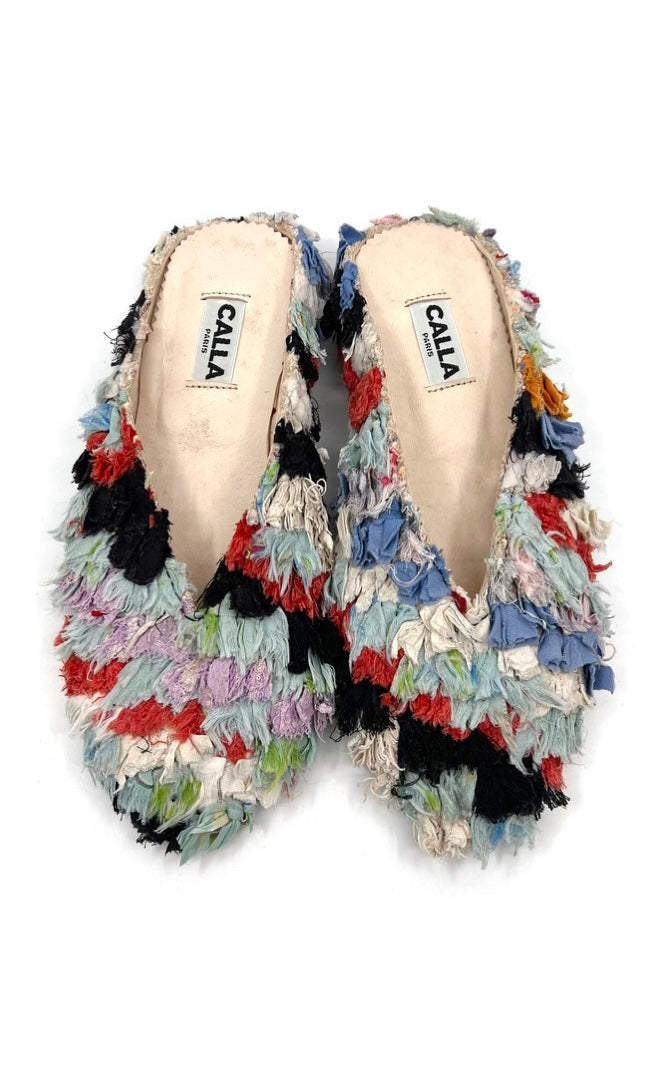 Handmade from upcycled vintage Berber rugs, CALLA’s Babouche mules exist in limited edition - just a handful for each rug. They boast textural details that are one-of-a-kind. Like all Babouche slippers, they are comforable to wear and effortlessly versatile. Every pair supports local Moroccan craftspeople and their traditions.
