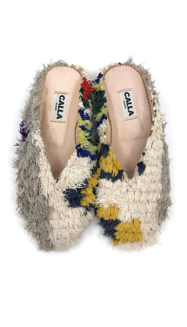 Handmade from upcycled vintage Berber rugs, CALLA’s Babouche mules exist in limited edition - just a handful for each rug. They boast textural details that are one-of-a-kind. Like all Babouche slippers, they are comforable to wear and effortlessly versatile. Every pair supports local Moroccan craftspeople and their traditions.