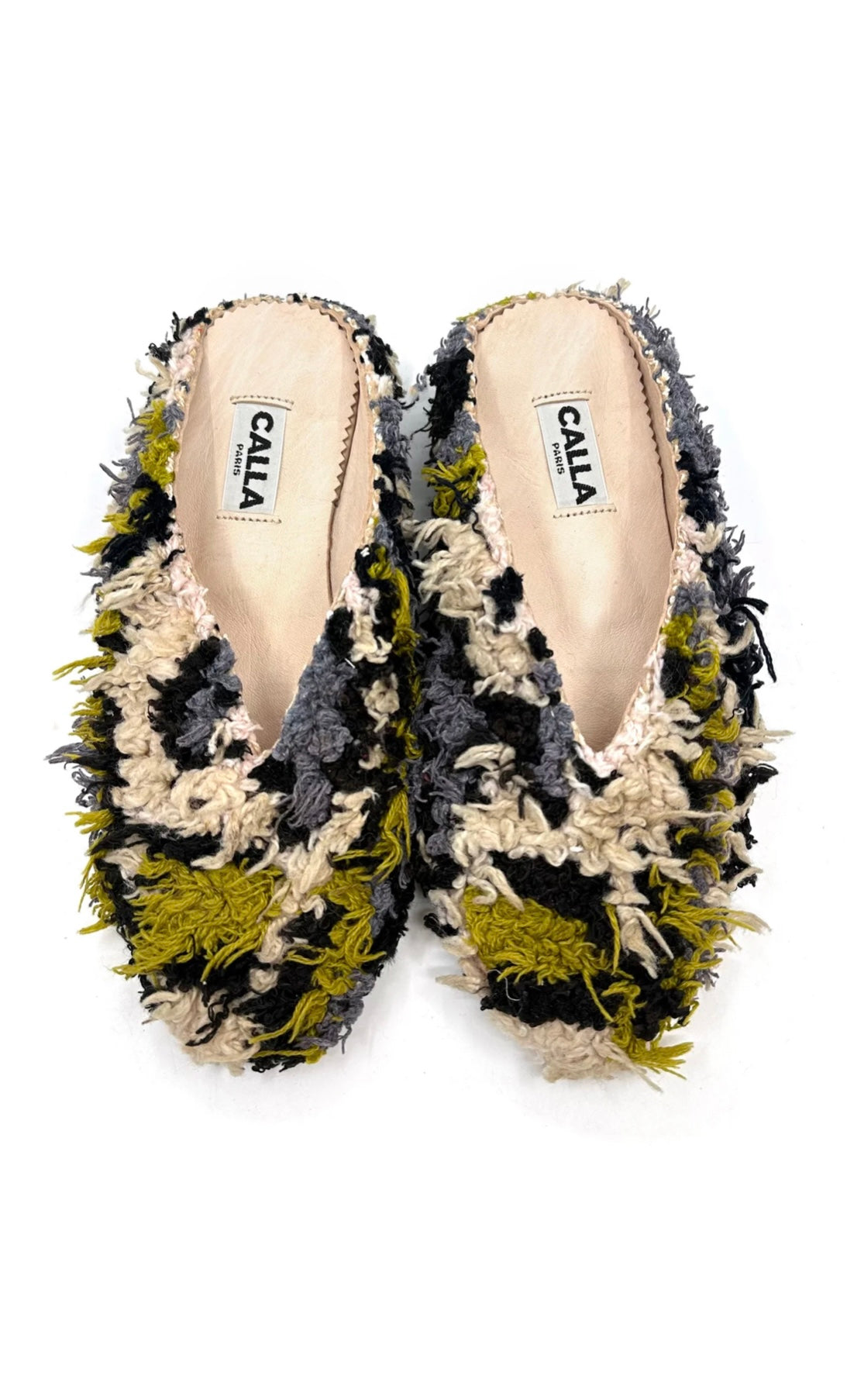 Handmade from upcycled vintage Berber rugs, CALLA’s Babouche mules exist in limited edition - just a handful for each rug. They boast textural details that are one-of-a-kind. Like all Babouche slippers, they are comforable to wear and effortlessly versatile. Every pair supports local Moroccan craftspeople and their traditions.