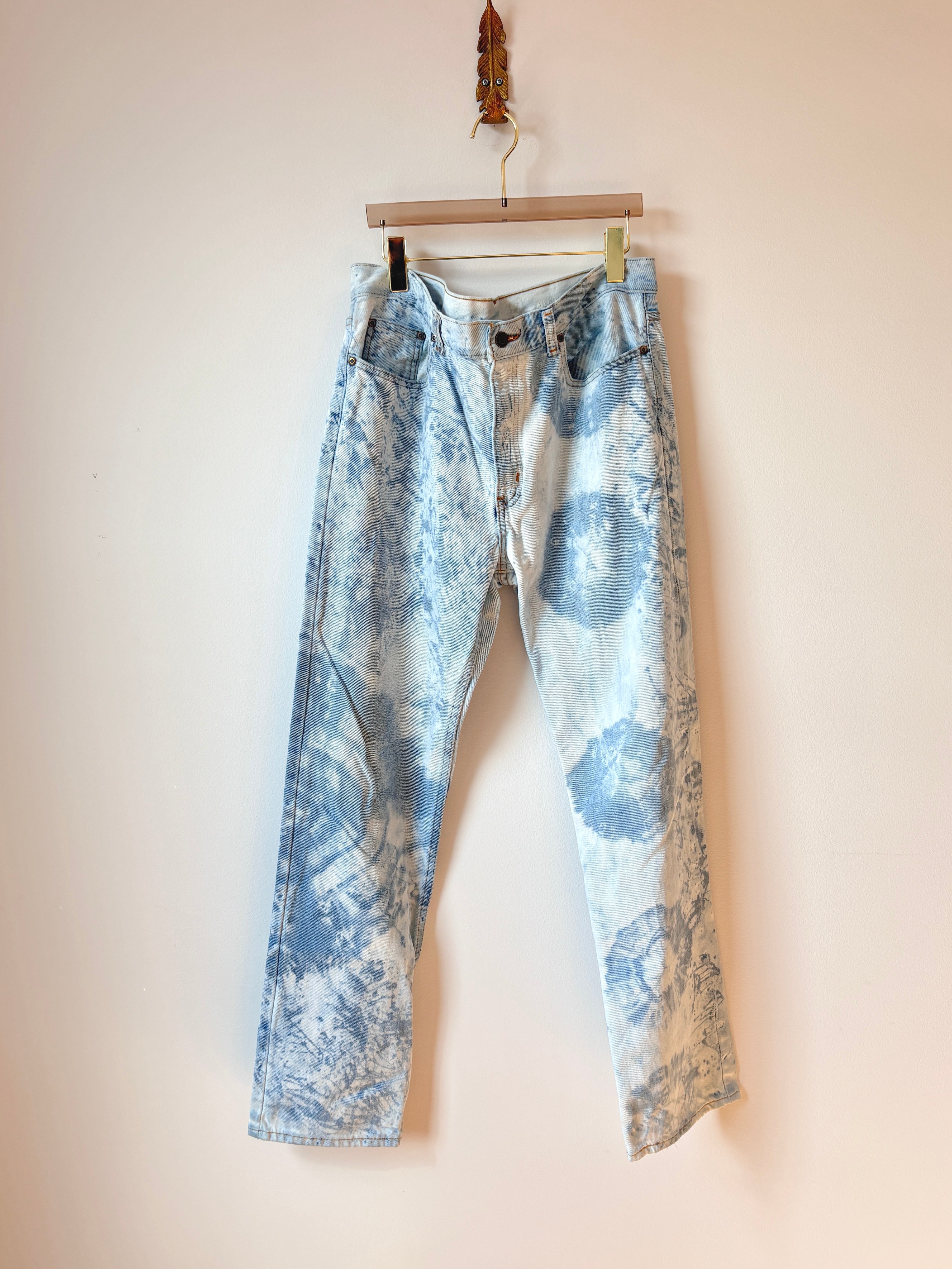 These light wash jeans have a true vintage feel with hand dyed texture and a well-worn cotton denim. Made for comfort and timeless style, they’re a go-to for everyday wear with a retro edge. This pair features hand dyed circles over right leg and light tone distressed texture throughout.