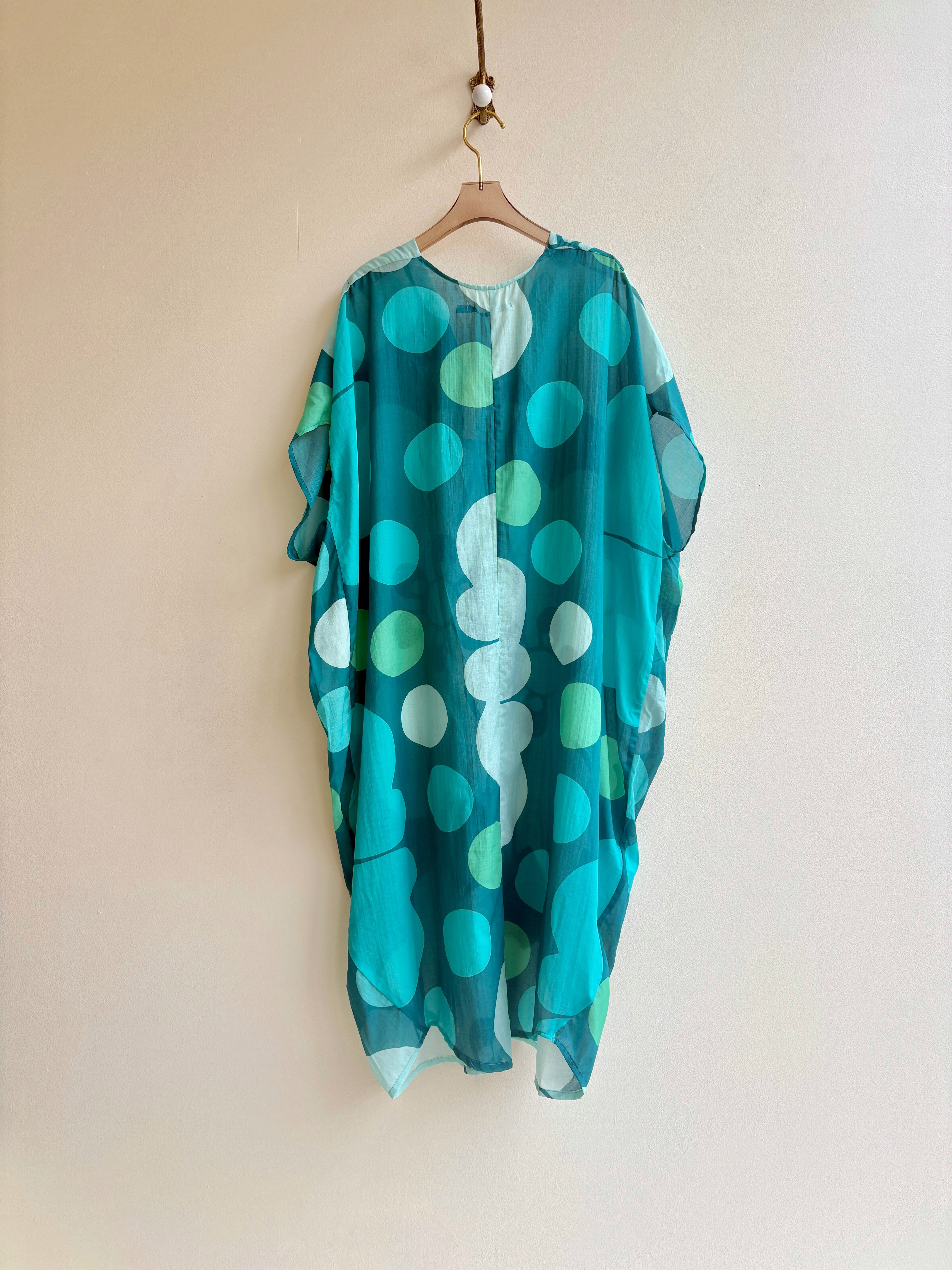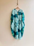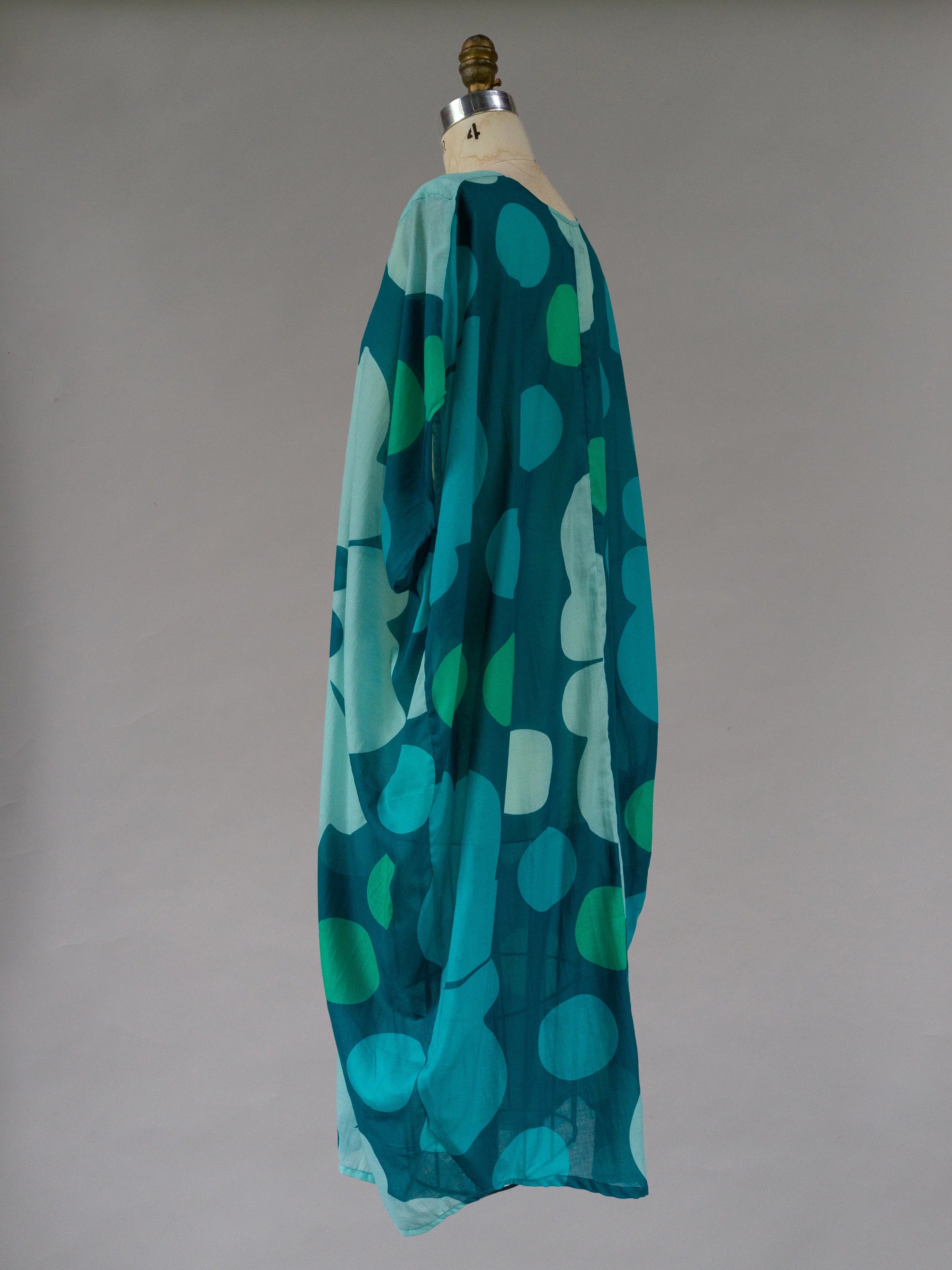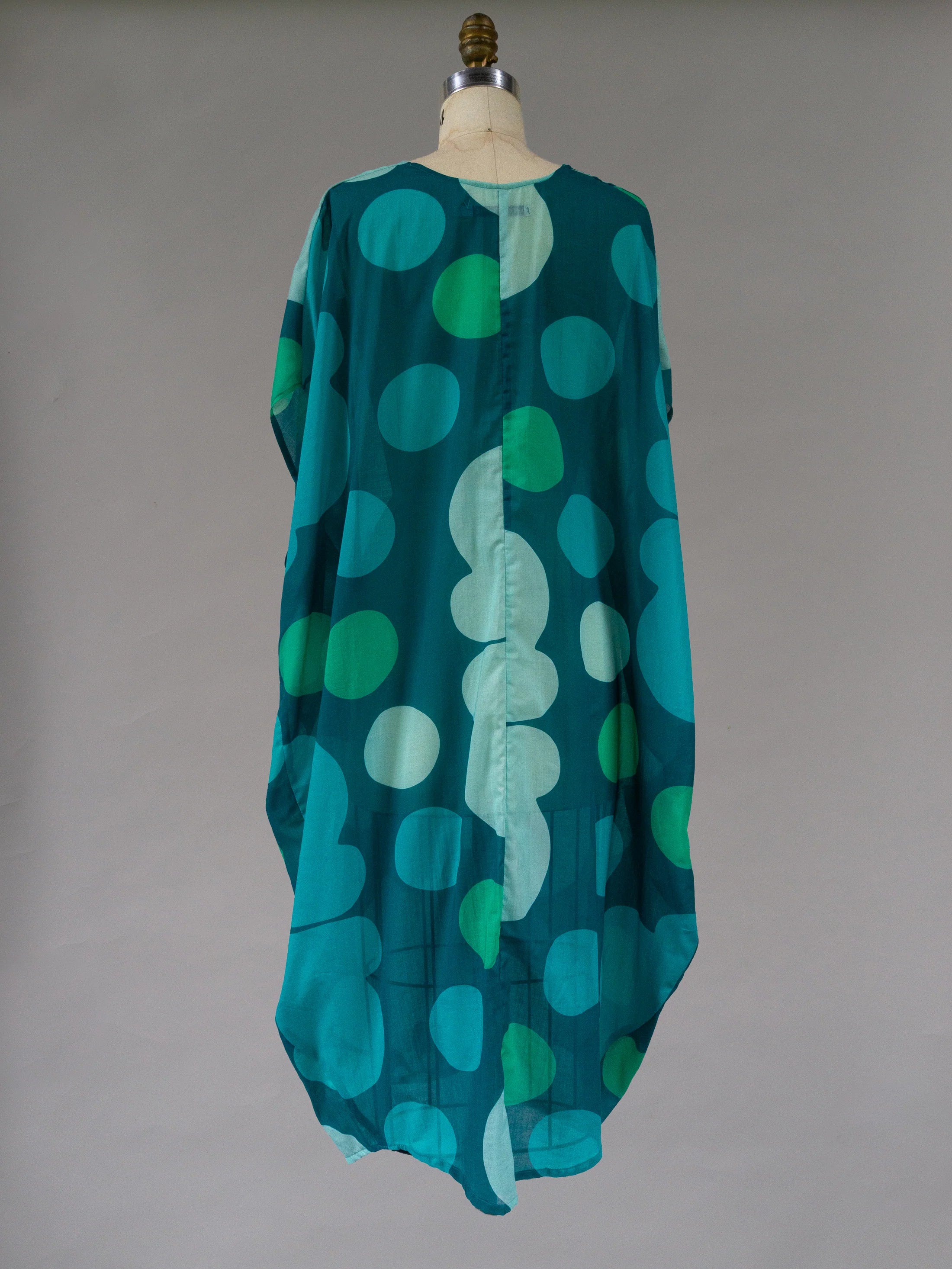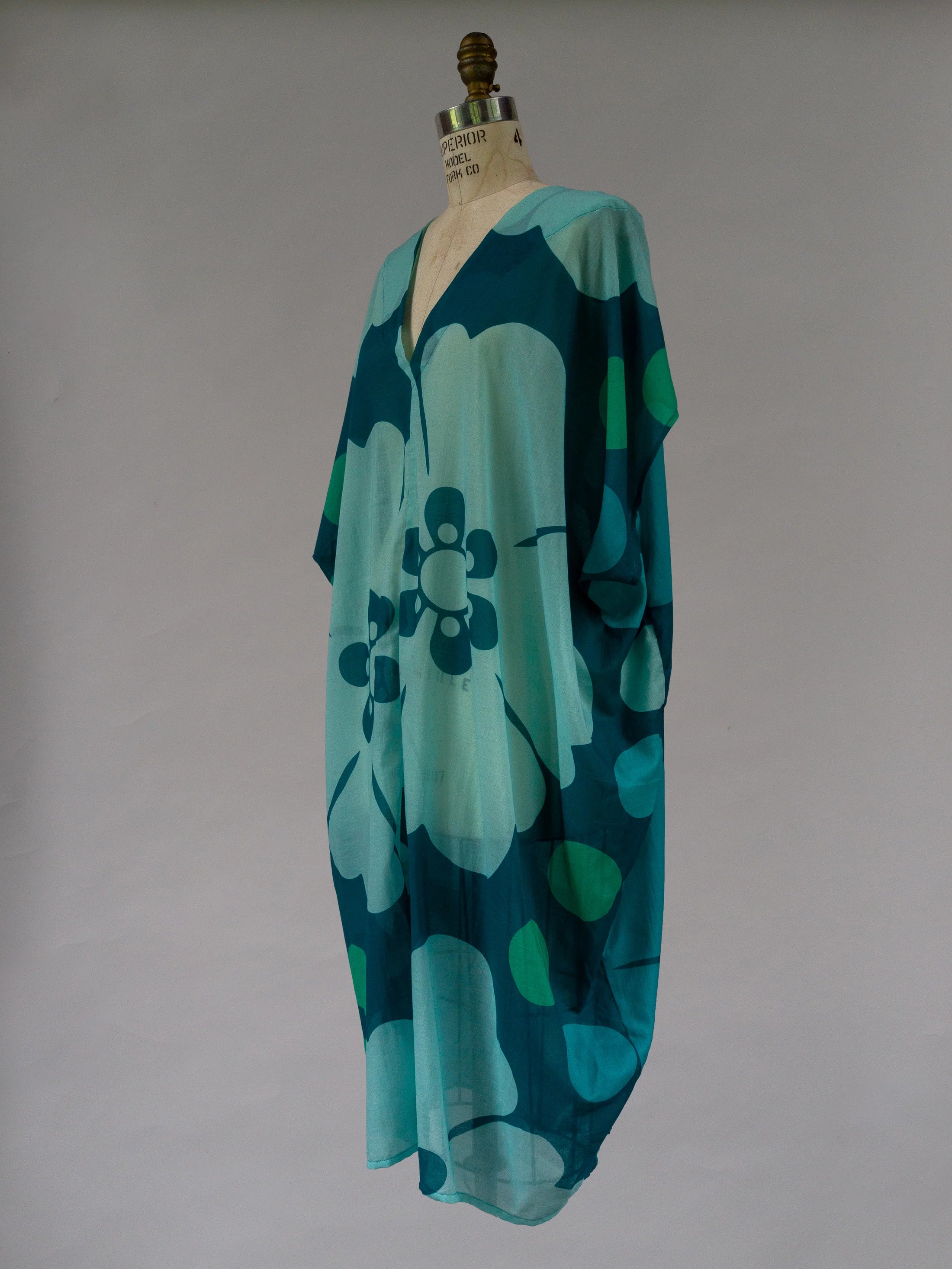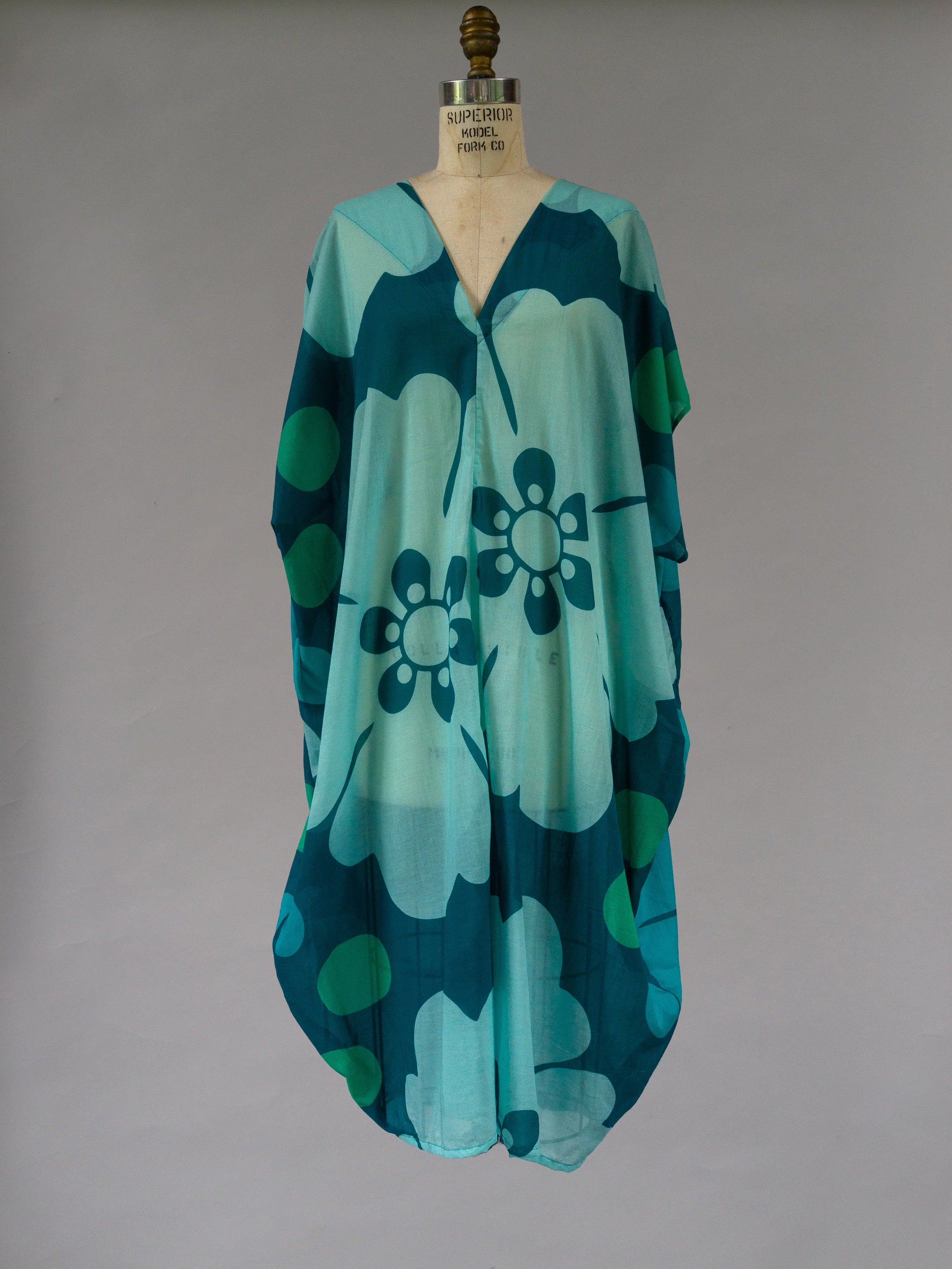 This cleverly shaped kaftan with V neck and draped body is made by Language of the Birds. Interior finishing includes flat felled back seam and sewn down facings.