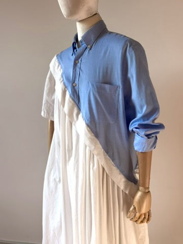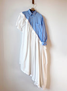 For the newest dress style for our Made X Reworked line, we’re sourcing men’s shirts from a local social-justice thrift store, Thrift2Fight, and breathing new life into them. Each design is slightly different and of course starts with a different shirt. This one combines a men’s button-down solid blue shirt with white cotton shirting for a full-skirted shirtwaist shirtdress with an asymmetrical slant waistline and hemline. One sleeve is a white flutter sleeve continuation of the skirt; the other sleeve is the original long shirt sleeve.
