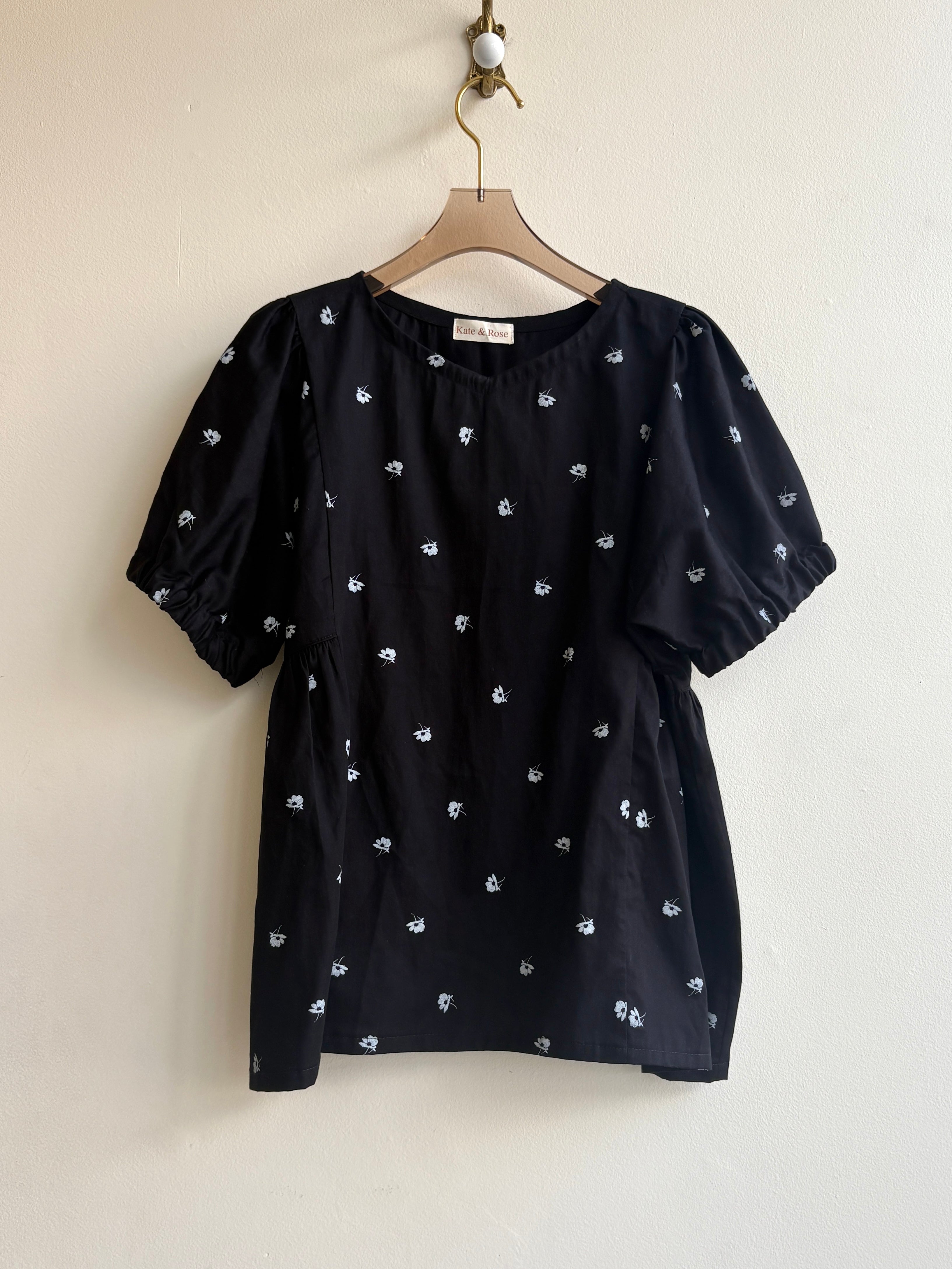 - Zero-waste blouse in unknown fiber black with white daisy print fabric