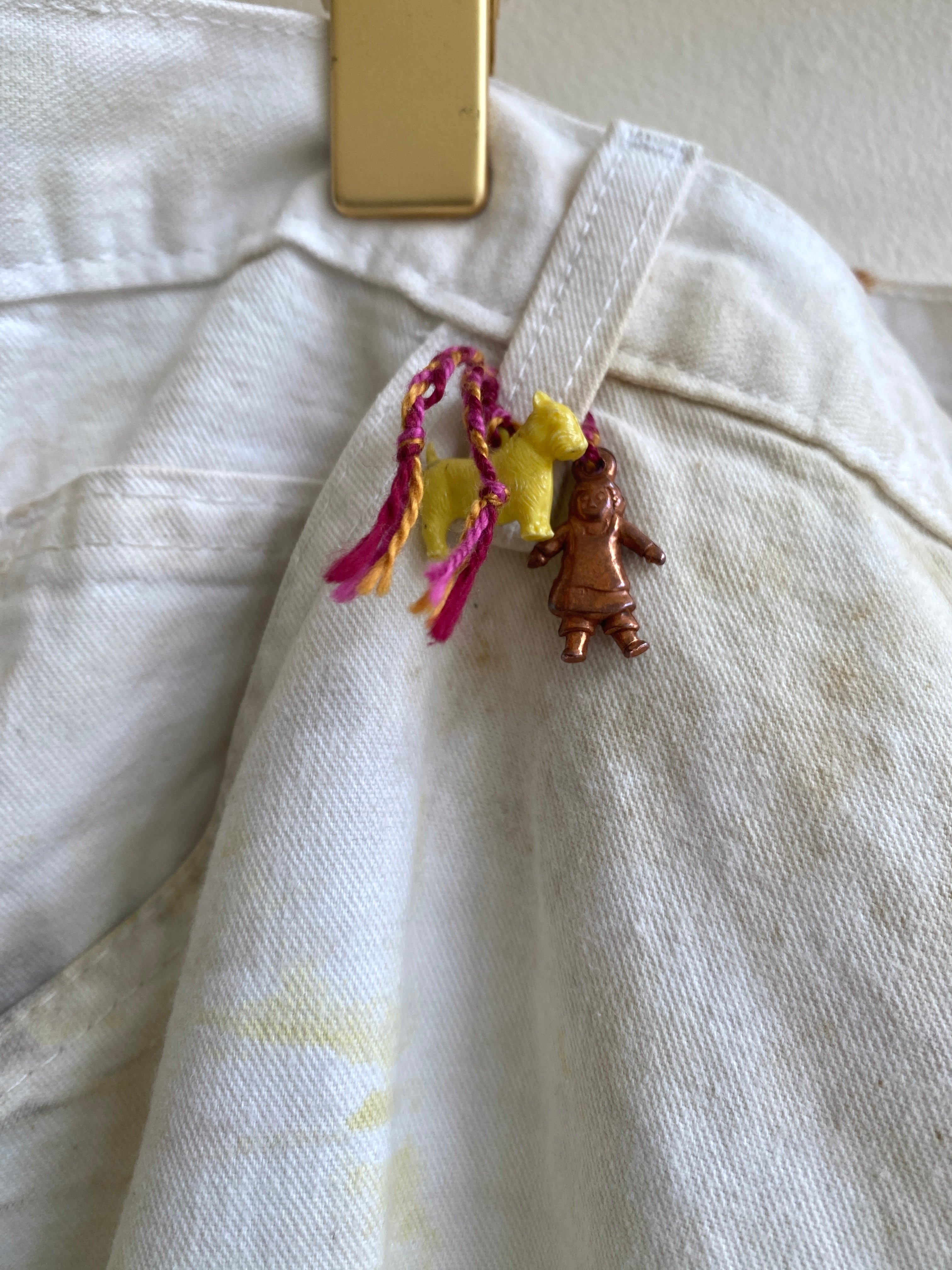 Blue, Green, Mustard Star Embroidered Yellow Dyed Pants w/ Cracker Jack Charm (Reworked)