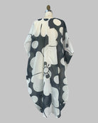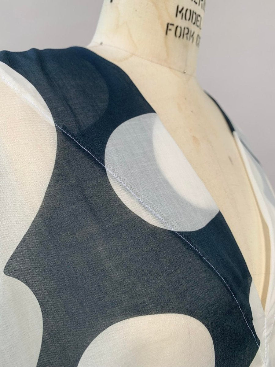 Cleverly shaped kaftan with V neck and draped body. Interior finishing includes flat felled back seam and sewn down facings. Midi length. One size. Due to the scale of the print, print placement varies on finished garments.