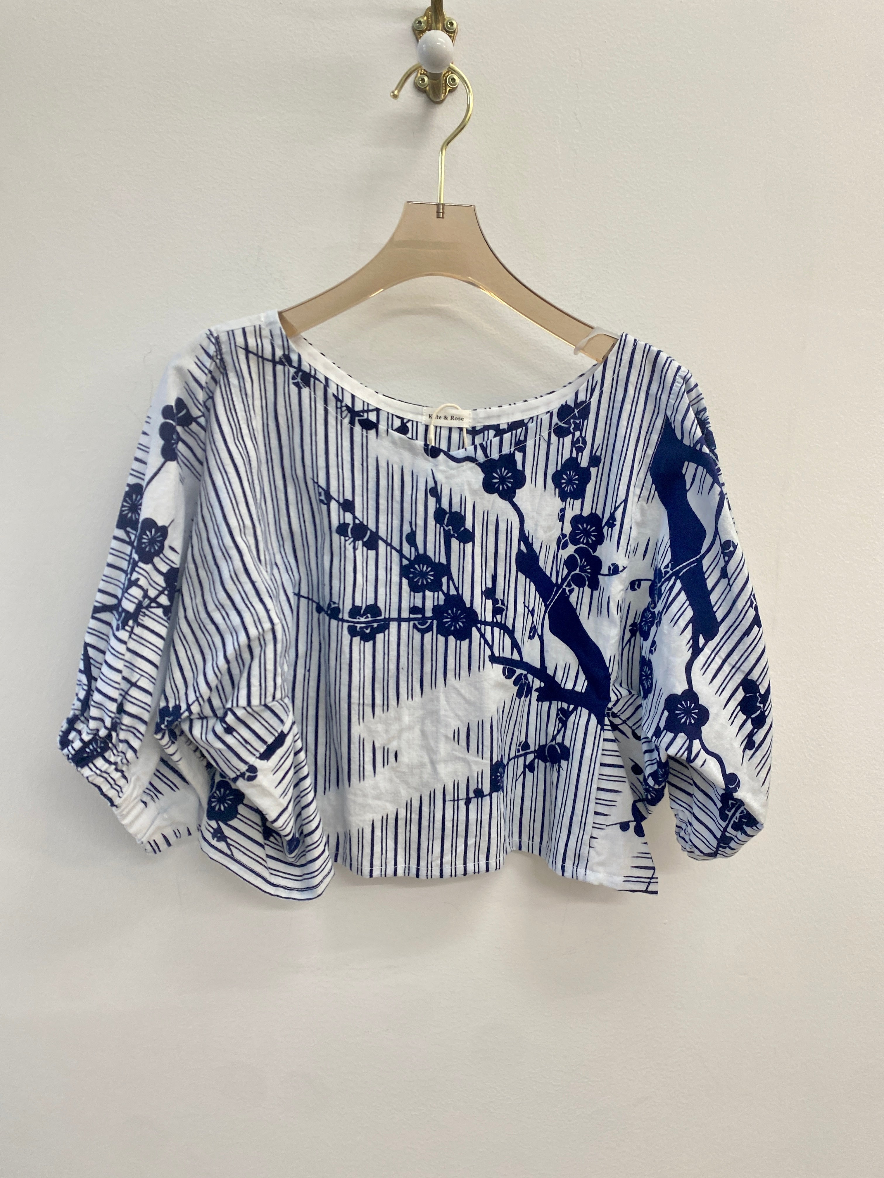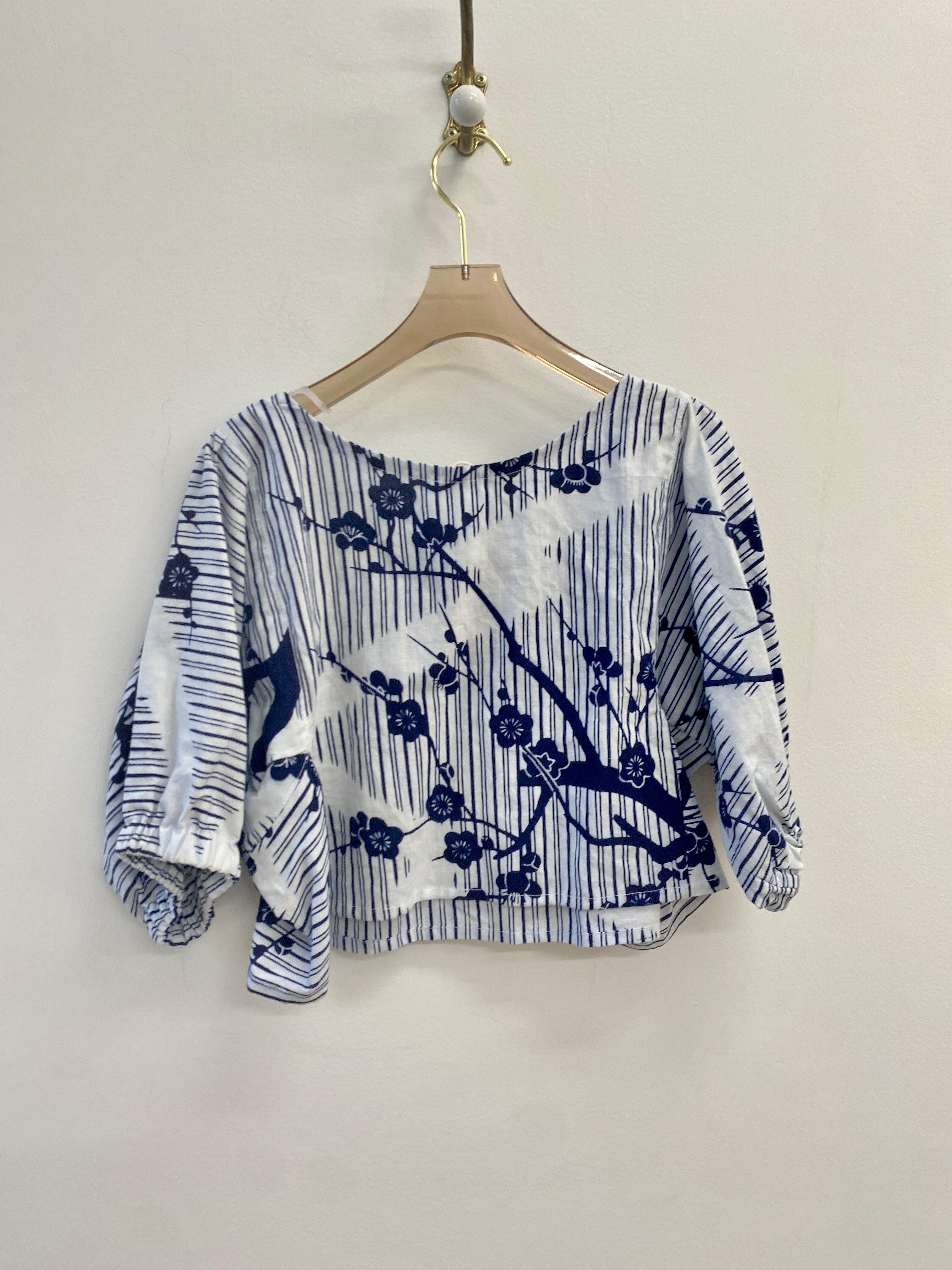 Blue & White Cherry Blossom Yukata Zero Waste Crop Top