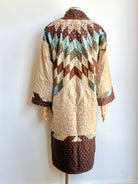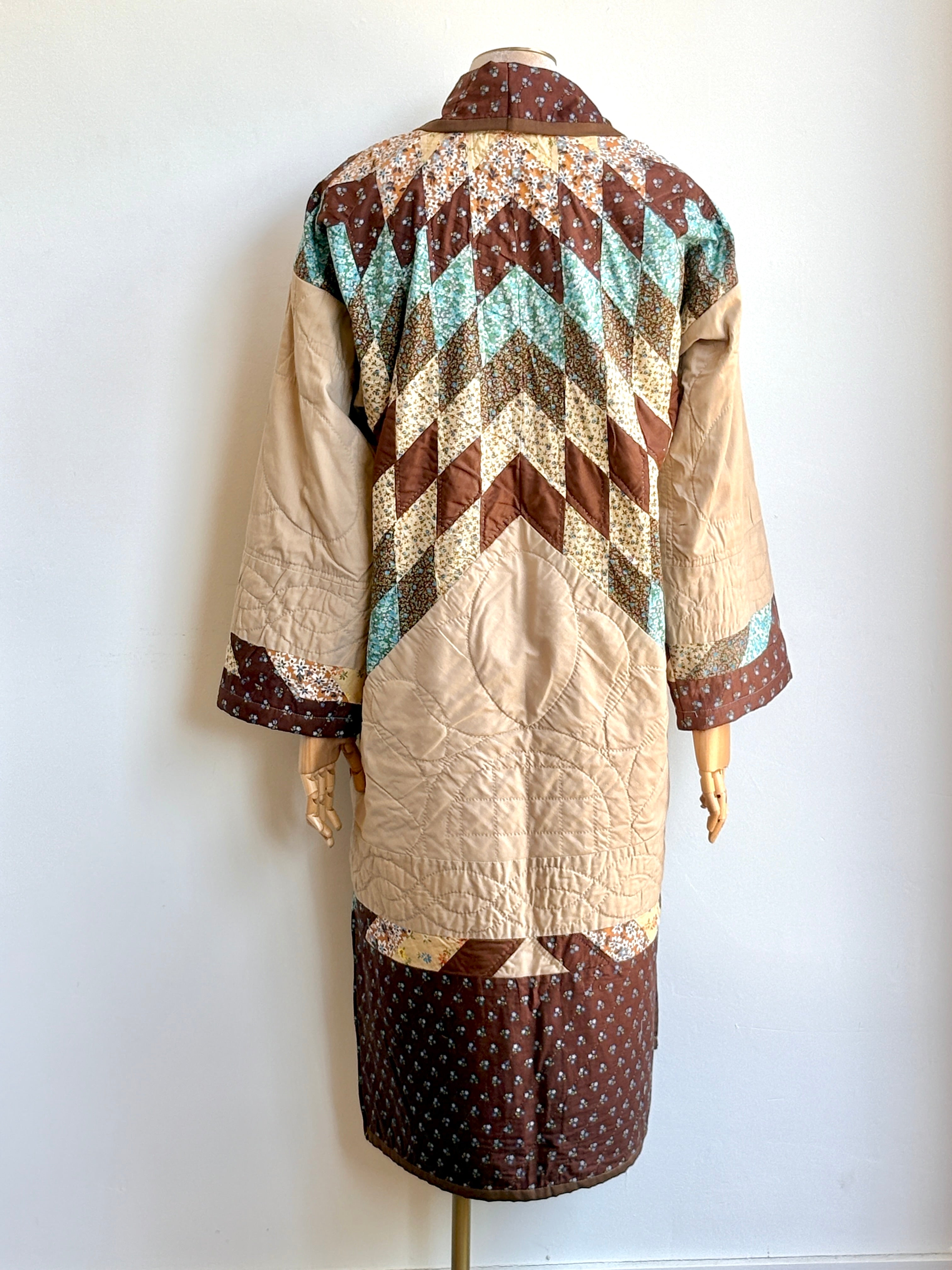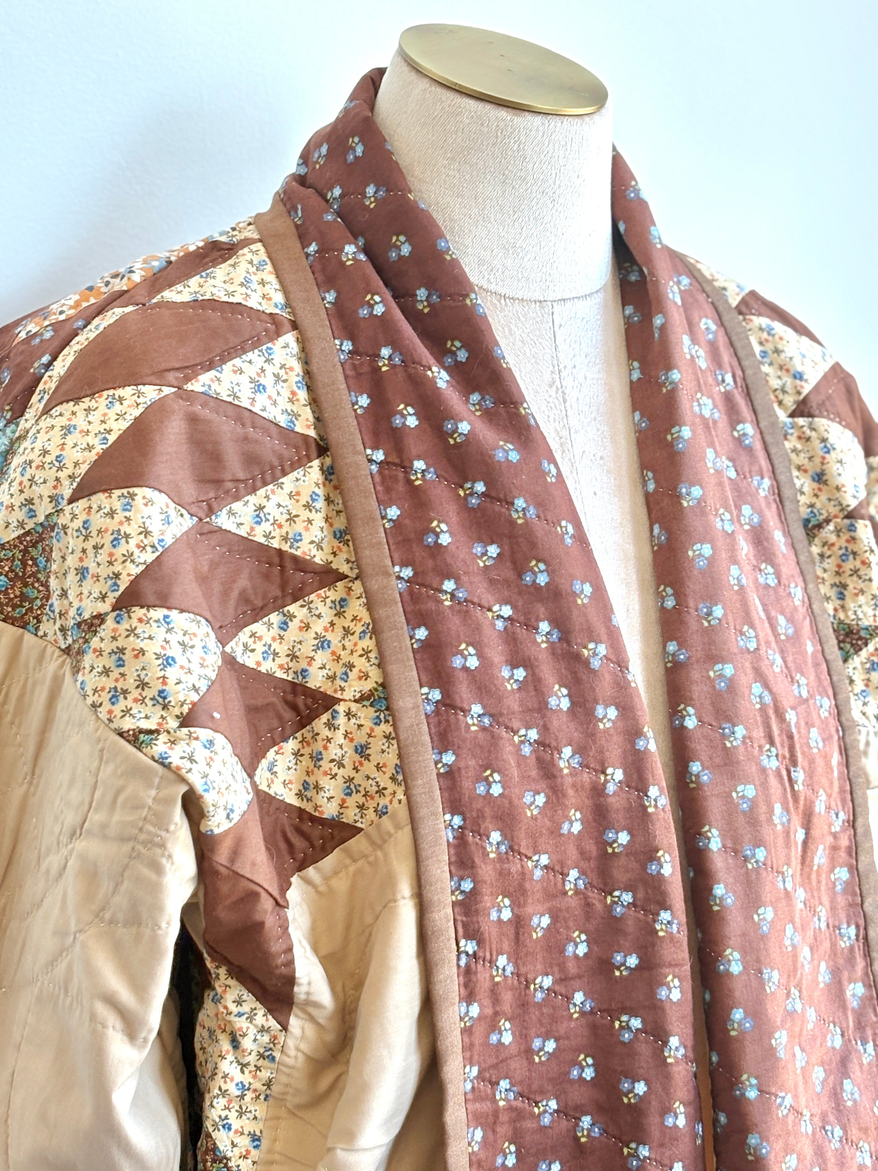 This one-of-a-kind duster-length jacket was sewn from a vintage quilt and will be cozy to wrap up in, indoors or out.