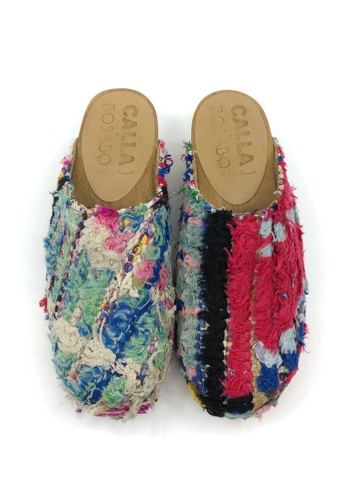Using traditional methods, the Calla Clogs are handmade in France at the Audouin family’s atelier who have been making “sabots” for five generations. Like the signature Babouches from CALLA, these shoes feature an upper made of upcycled vintage Boucharouite rug. Each pair is one-of-a-kind. The Clog features a wood sole and thin rubber tread suitable for all seasons. The snug slip-on fit and arch support insure total comfort.
