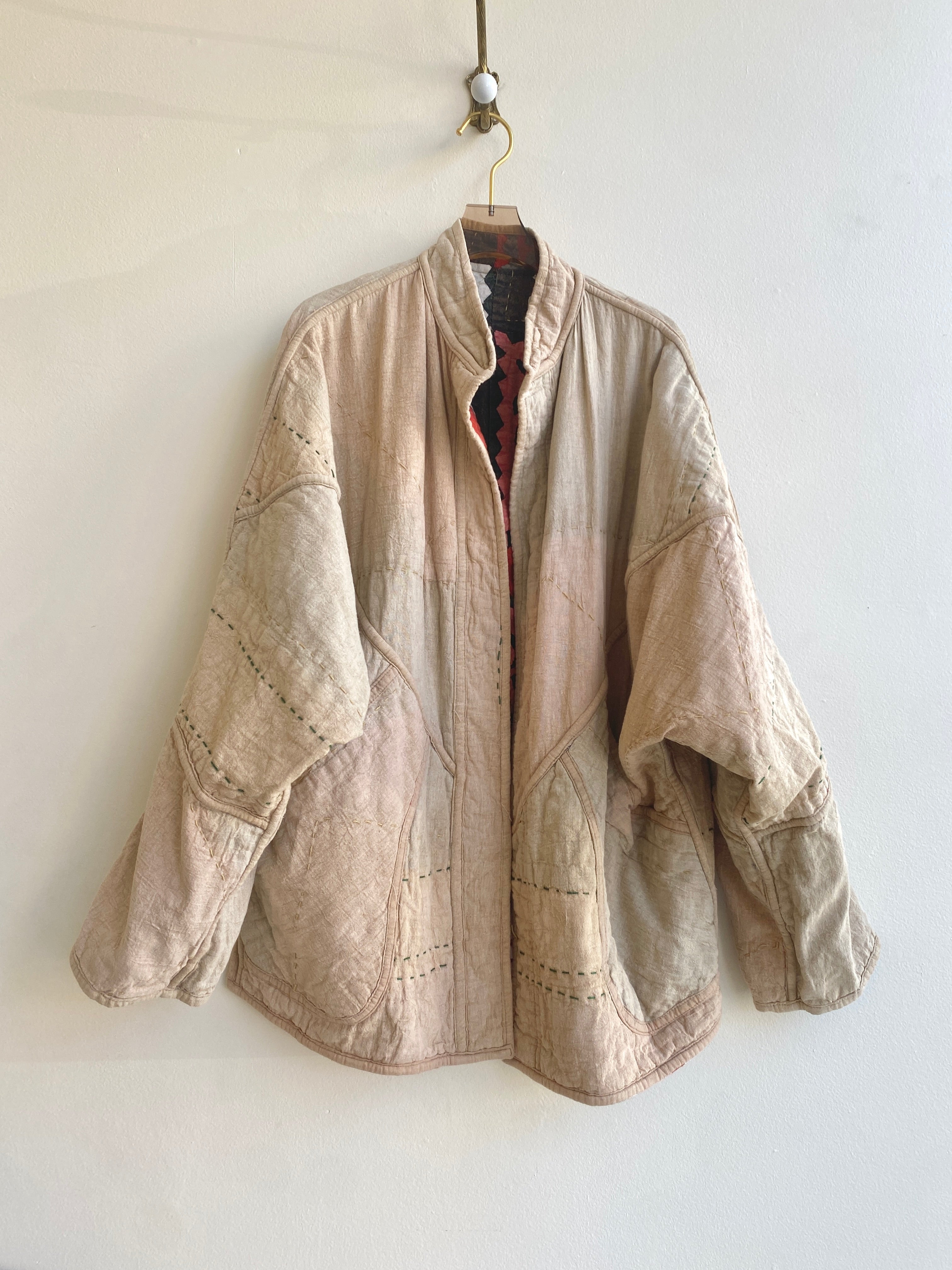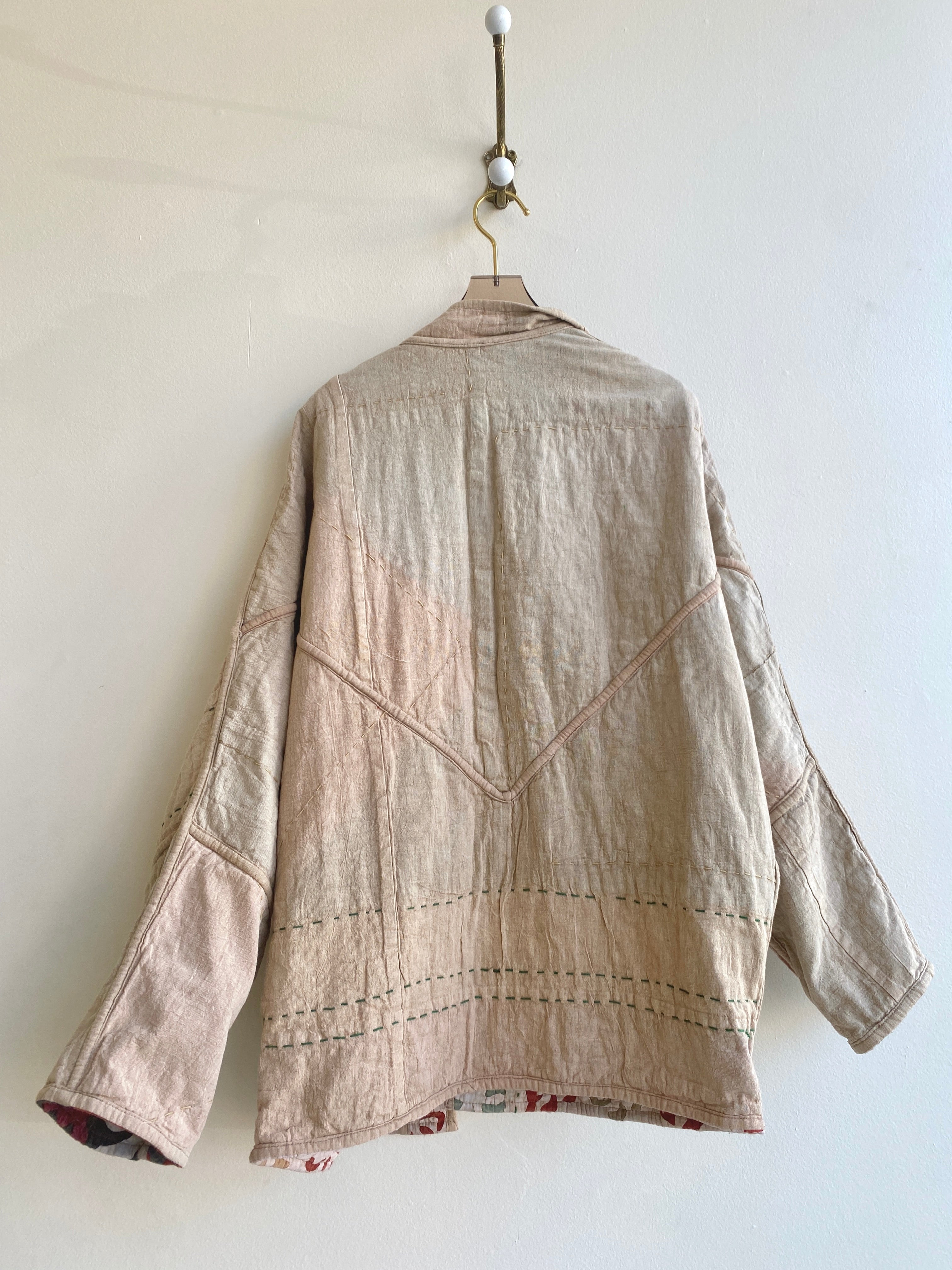 About the textiles used: This one-of-a-kind piece is made from vintage Nakshi Kantha quilts. Nakshi Kantha are made from recycled textiles held together with a dense and colorful decorative and utilitarian running stitch. So the jacket is the fabric’s third life.