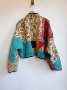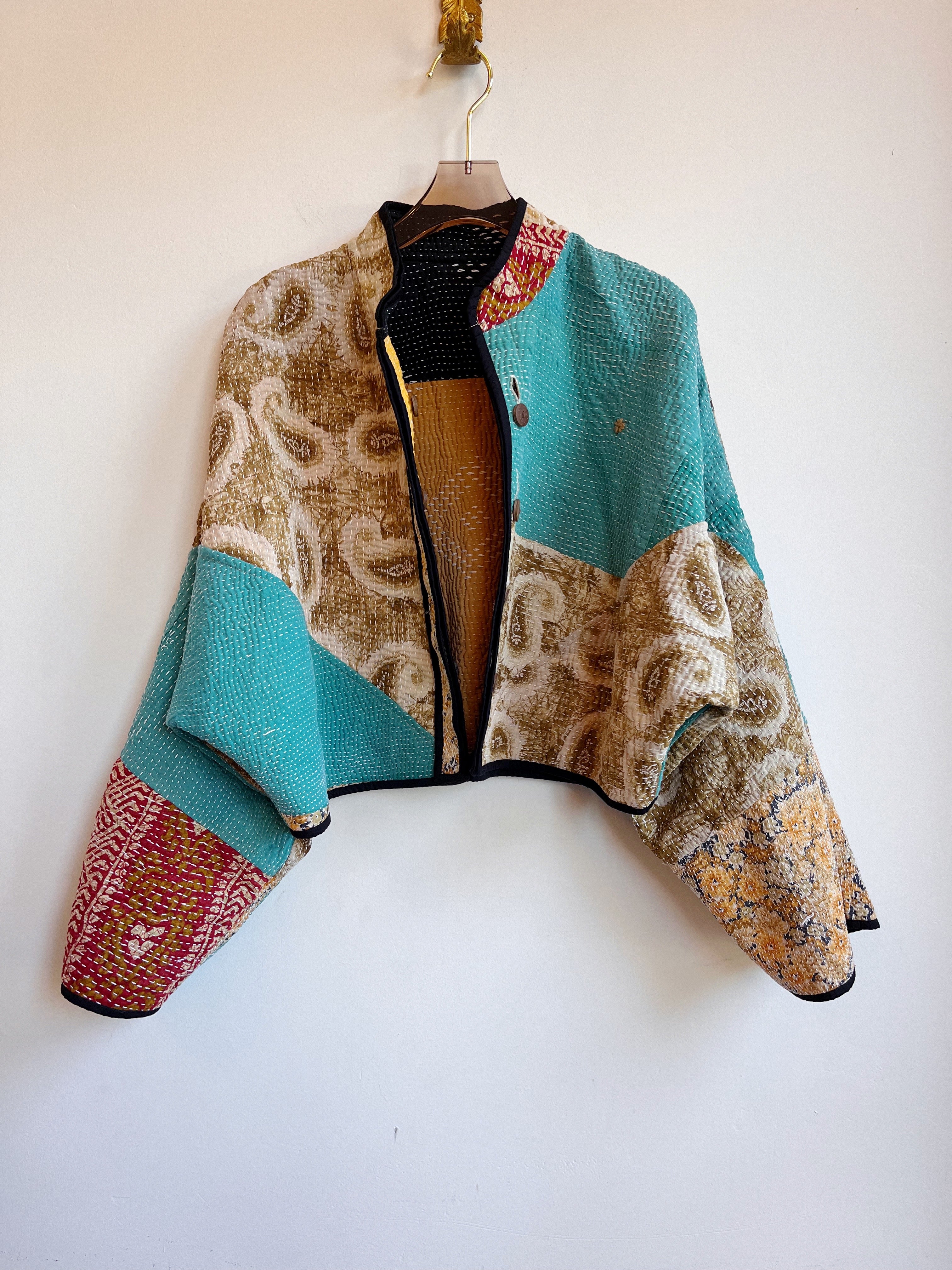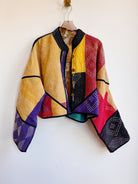 The Kaira Cropped Jacket is made from repurposed Vintage Kantha quilts, and the original patina includes areas of fraying, patches and an age-softened feel.