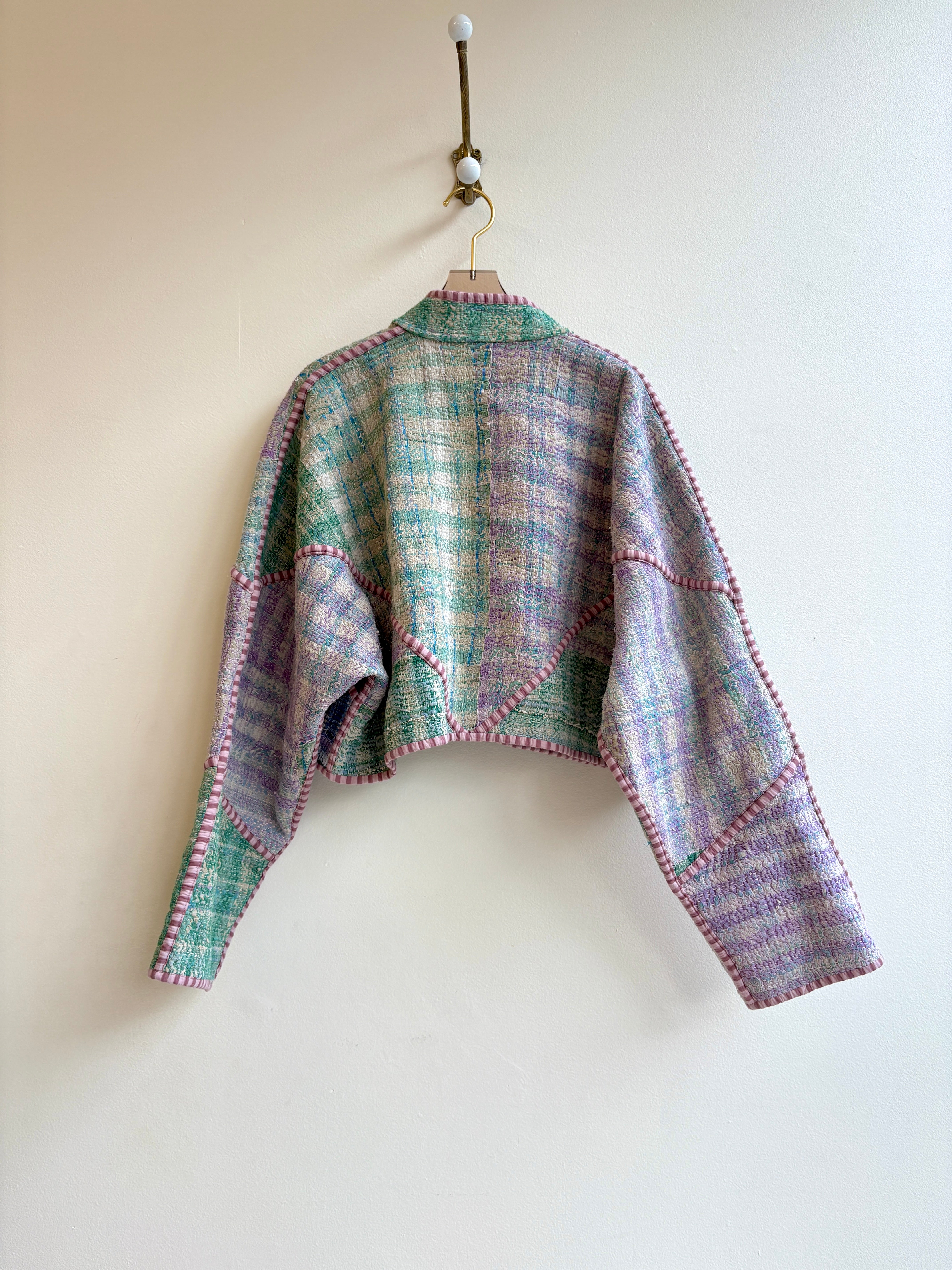 The Kaira Cropped Jacket is made from repurposed Vintage Kantha quilts, and the original patina includes areas of fraying, patches and an age-softened feel.