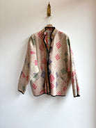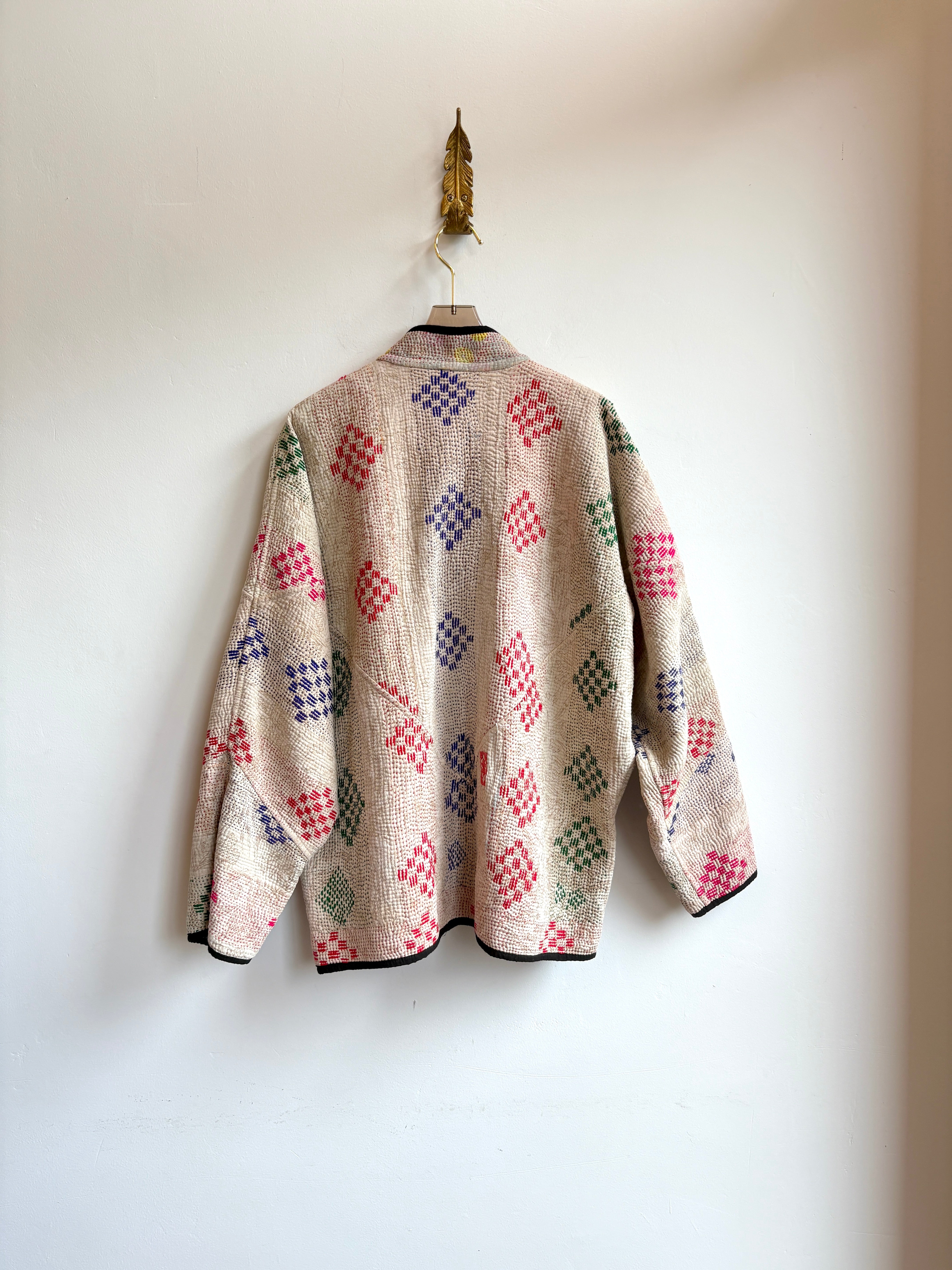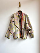 This Ladhiya Jacket is made from repurposed Vintage Kantha quilts, and the original patina includes areas of fraying, patches and an age-softened feel.