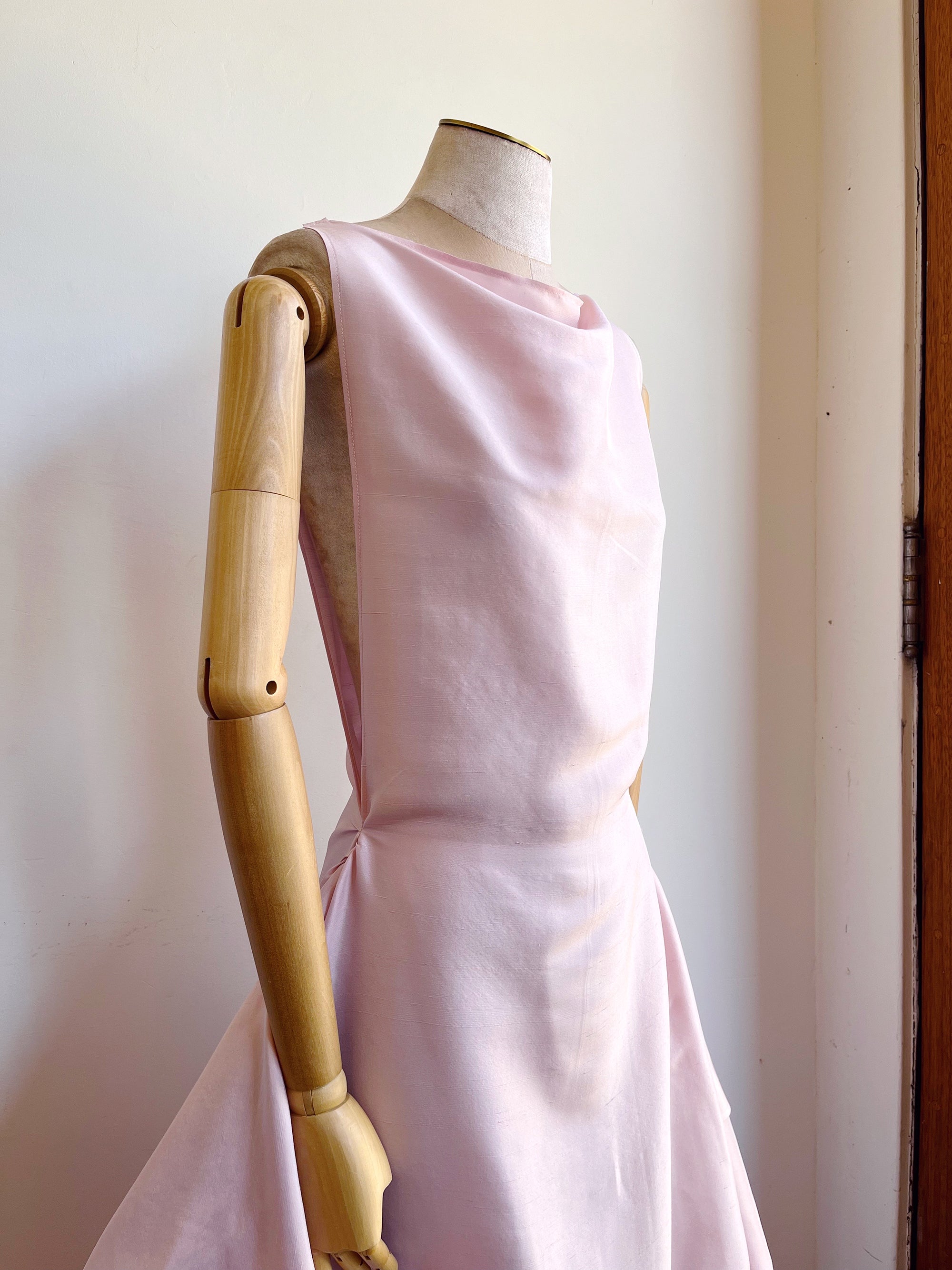 Our Zero-Waste Dress is so unabashedly pretty they tend to sell just as quickly as we can get one onto the floor. This one was sewn from a pale pink silk shantung with the feel of raw silk, with a dramatic hem ruffle, and is ready for a big event. Dress it up for a party or wedding, take it for a walk barefoot on a beach, or throw on a jean jacket and sneakers for a day out and about.