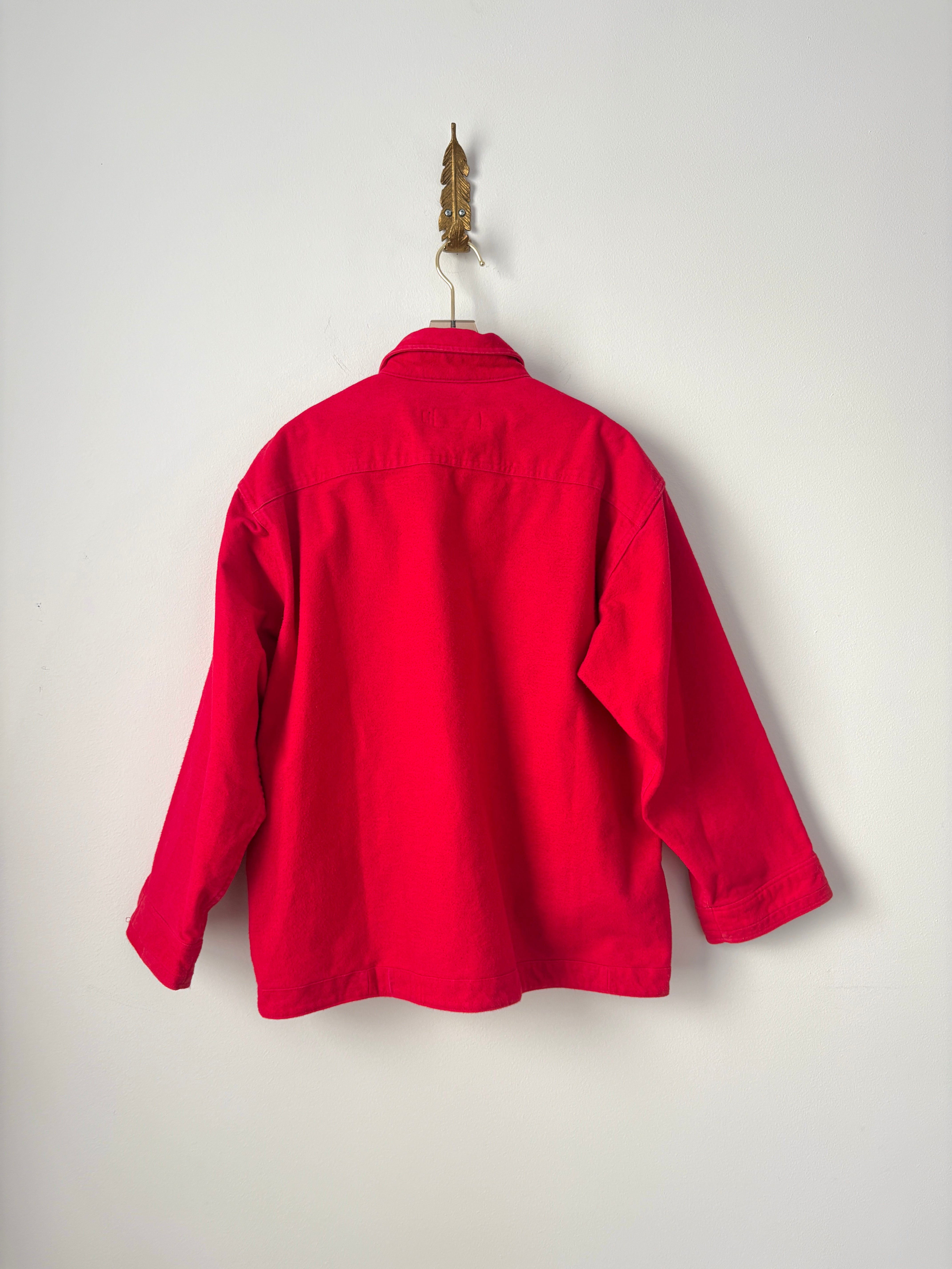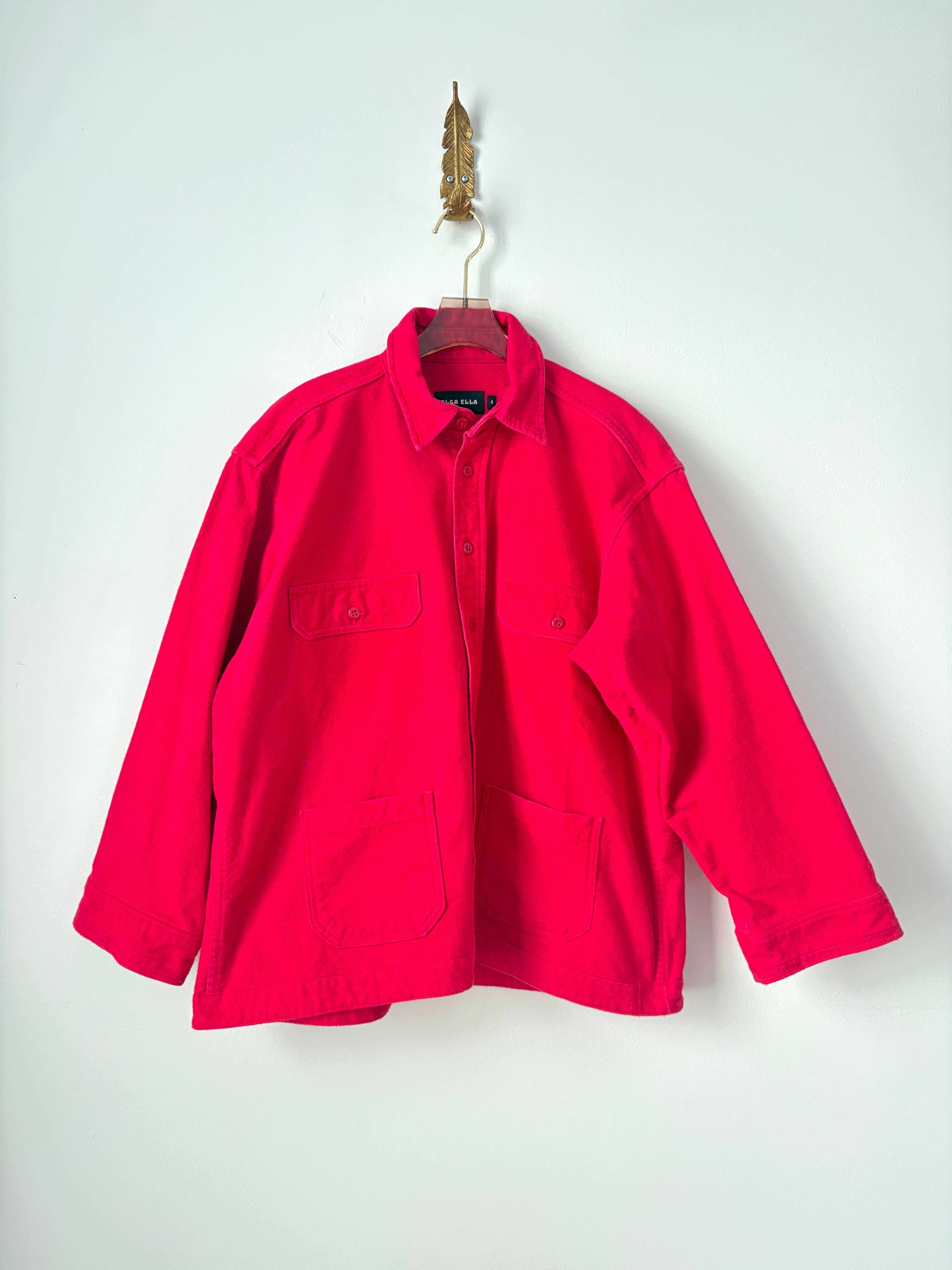 This Olga Ella crimson red flannel shirt-jacket was once a mere a work shirt. It’s been given new life with decorative and functional pockets, relaxed tailored arm, and button down fromt