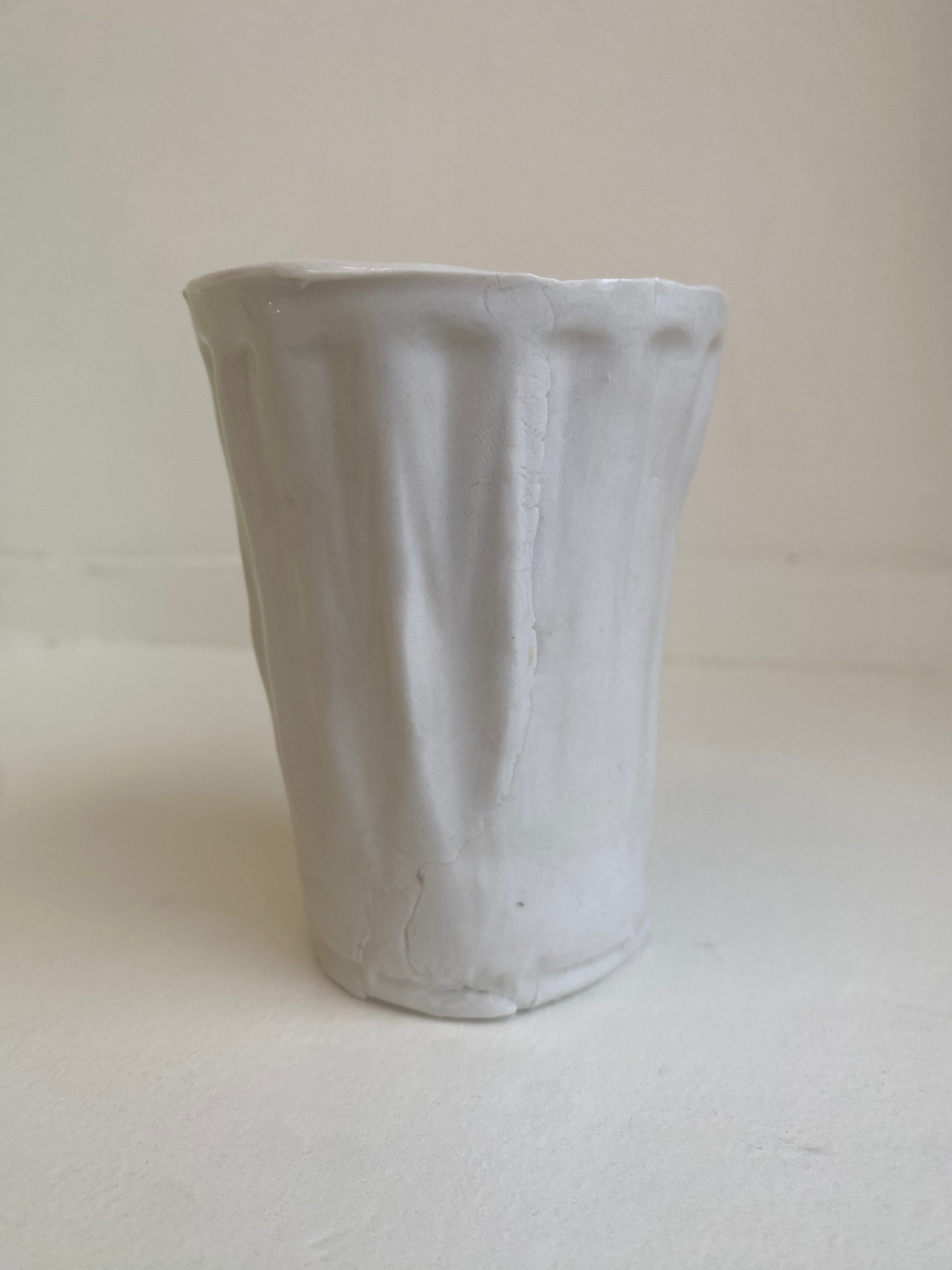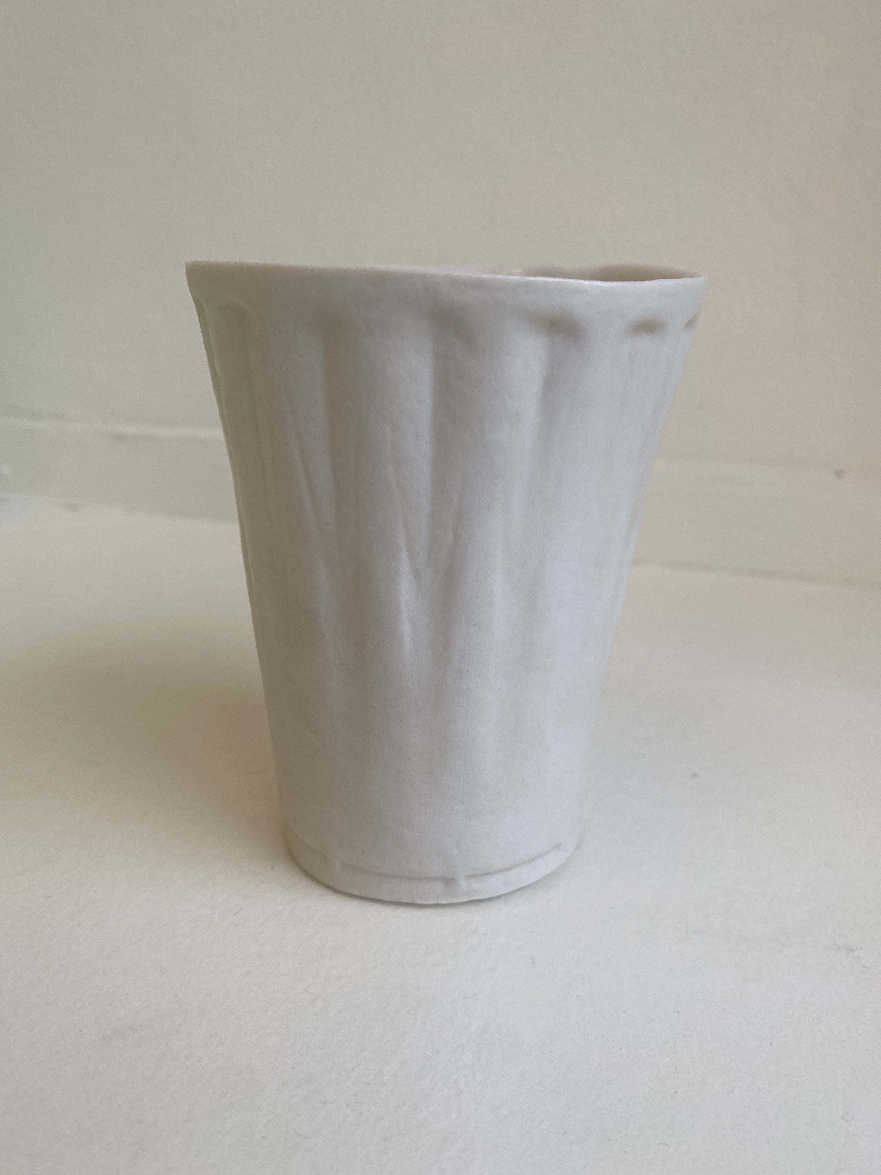 This handcrafted ceramic cup, designed by Laura Ann Jacob, is made from 100% recycled plastic cups in ceramic. Each cup is unique and sustainable, making it an environmentally-friendly choice. Get your hands on this one-of-a-kind, recycled cup and be a part of the eco-friendly movement!