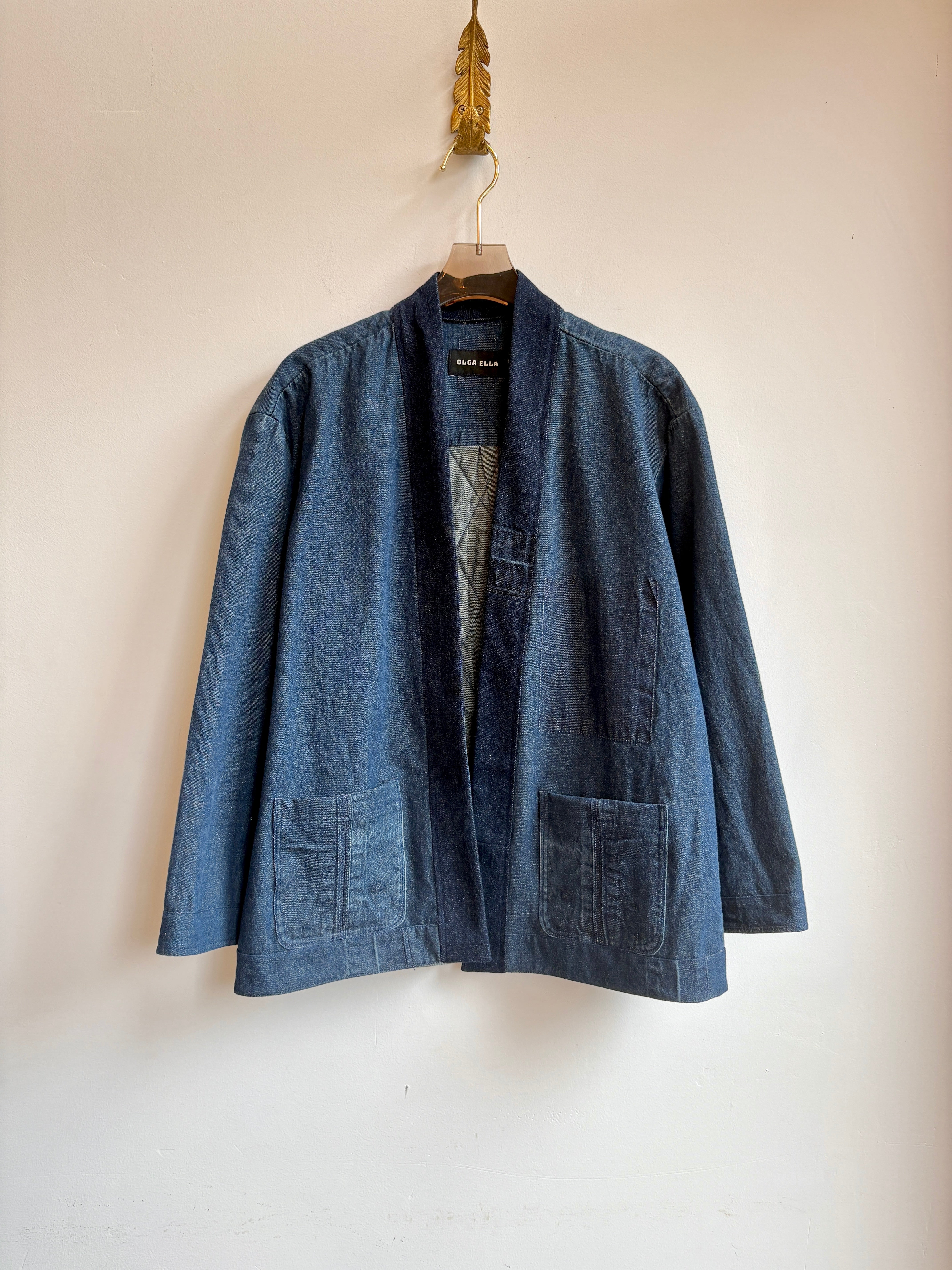 Olga Ella’s patchworked denim garments are works of textile art, and this one-of-its-kind jacket is no exception. It began life as a denim workshirt and has been reworked into a lightweight, open-front jacket with a shawl collar. Two pockets appear below the ghost of a former chest pocket, and additional blocks of denim are appliquéd and patched in to create a patchwork diamond on the back.