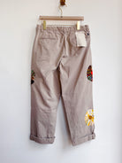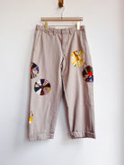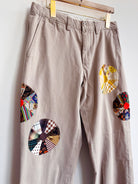 Vintage chinos take on a whole new life thanks to Chris Easter’s artful appliqué of vintage Dresden plate quilt blocks. Each pair is one of a kind.