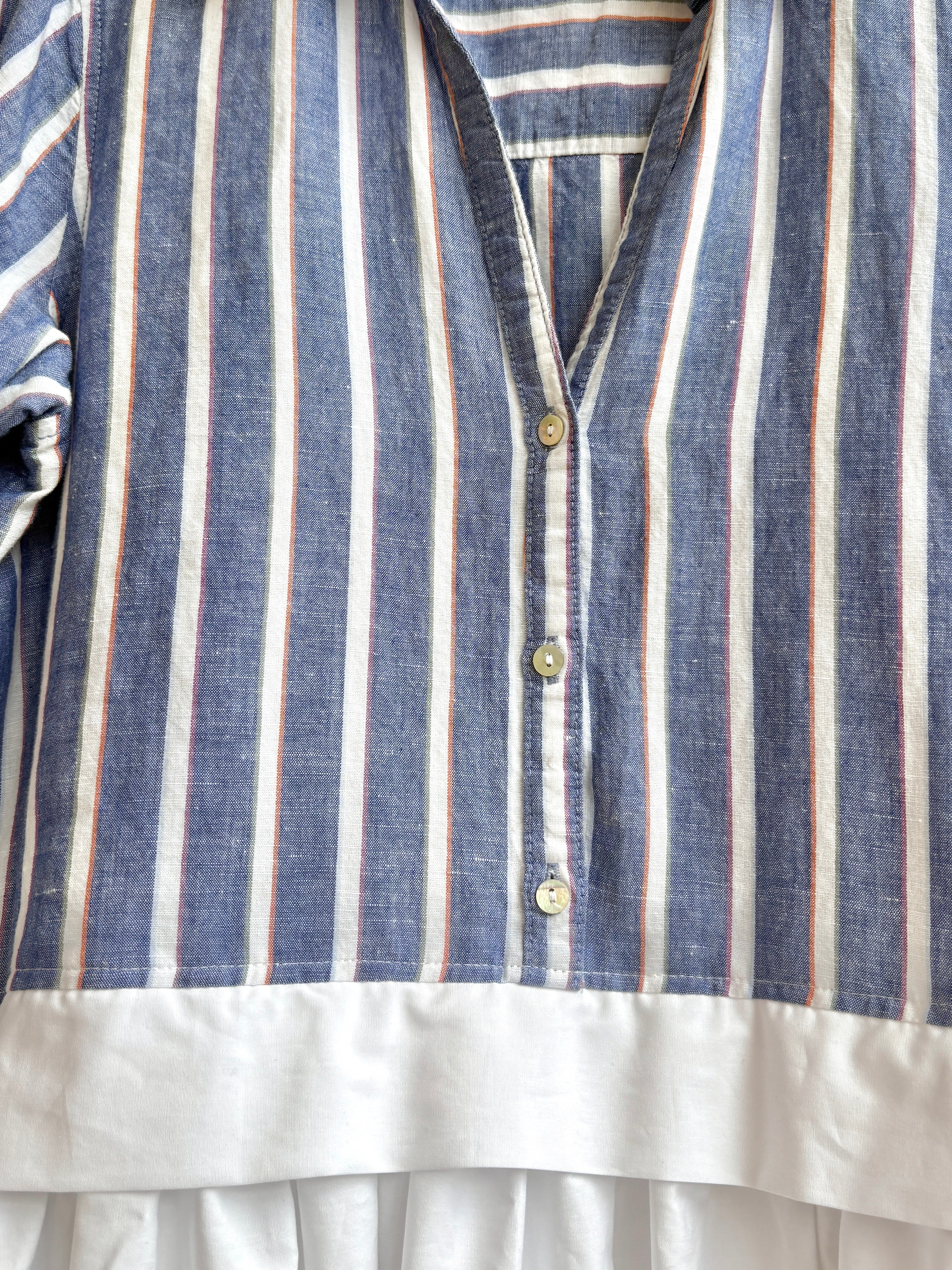 For the newest dress style for our Made X Reworked line, we’re sourcing men’s shirts from a local social-justice thrift store, Thrift2Fight, and breathing new life into them. Each design is slightly different and of course starts with a different shirt. This one combines a blue men’s button-down in a blue and faded rainbow stripe with white cotton shirting for a full-skirted shirtwaist shirtdress with an empire waistline.