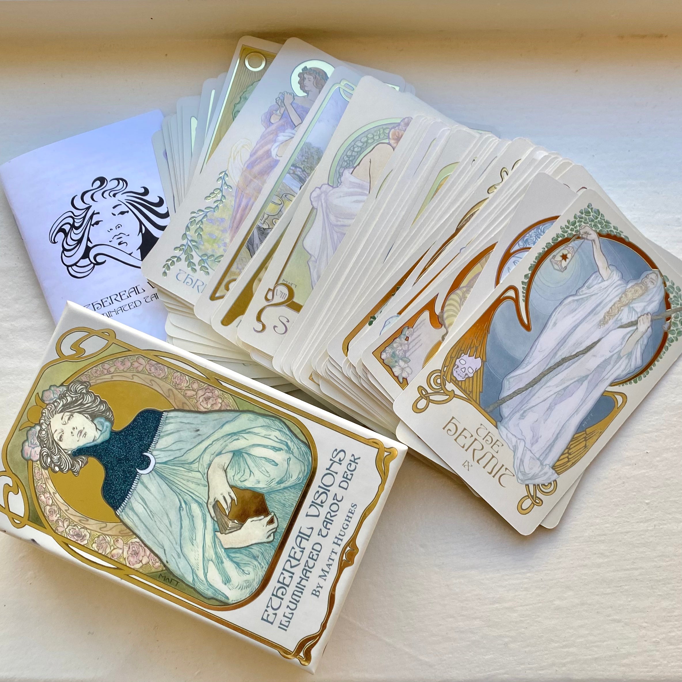 Sit down and divine in style with this Art Nouveau tarot deck, illustrated by Matt Hughes. The artist has also created two additional cards to supplement the traditional Major Arcana. His style combines inspiration from the art nouveau, pre-raphaelite, and symbolist movements, to produce an artistic expression uniquely his own. Every detailed image in the 80-card deck is hand drawn, colored, and embellished with gold foil.