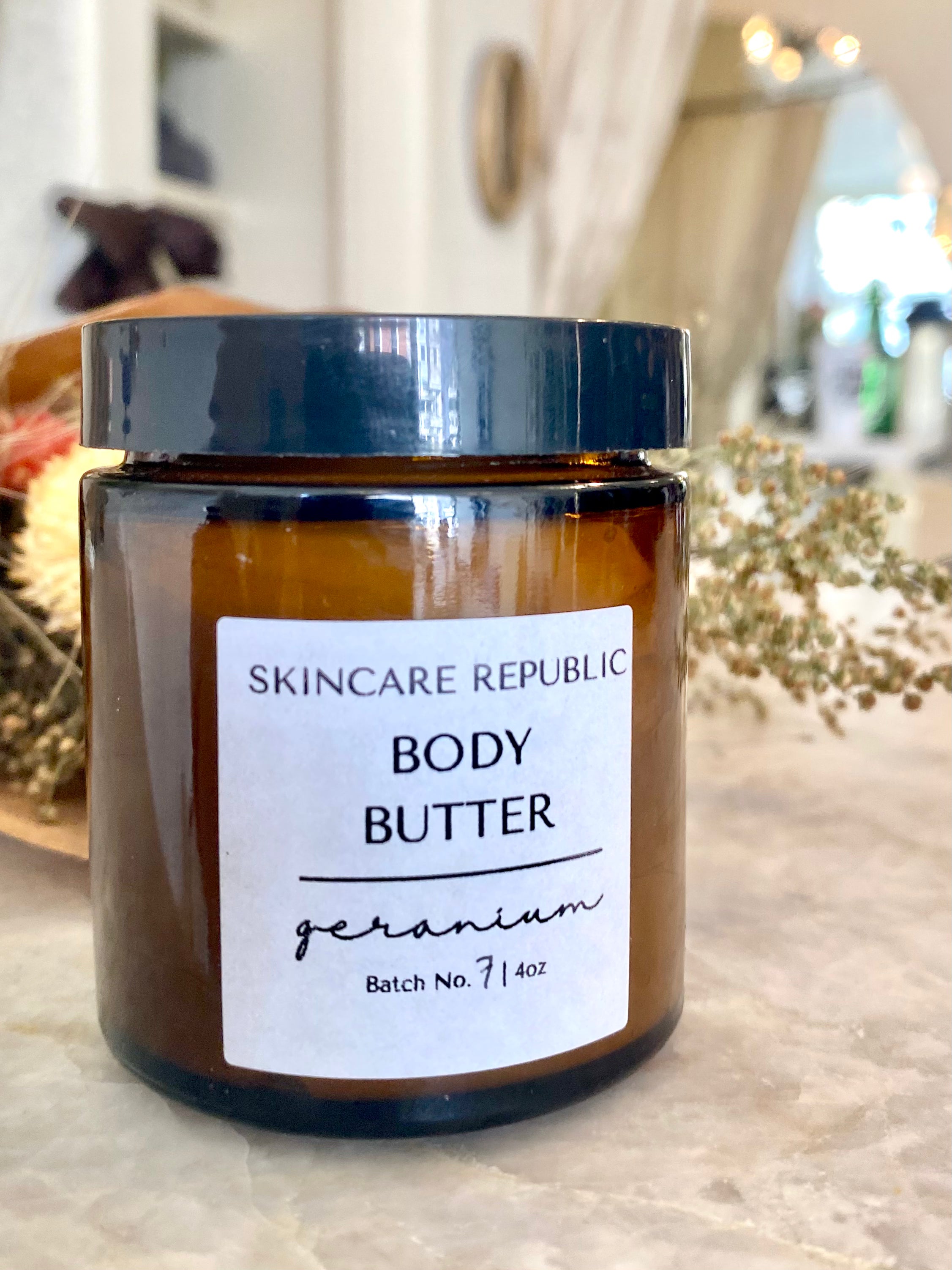 Your skin will love you for the rich and therapeutically beneficial blend of this handmade body butter. Scented with Geranium and infused with Matcha Powder for extra enjoyment and benefits.
