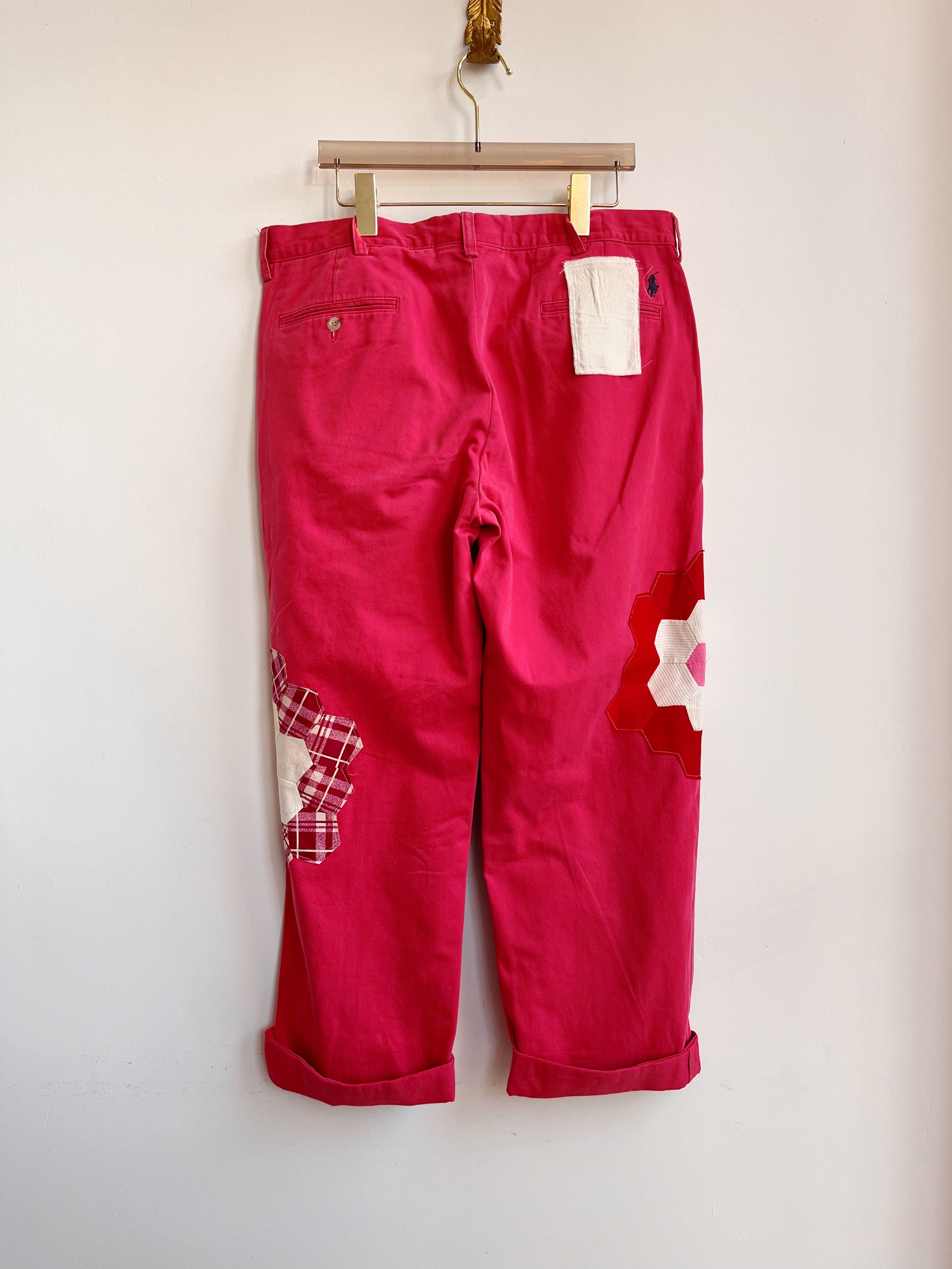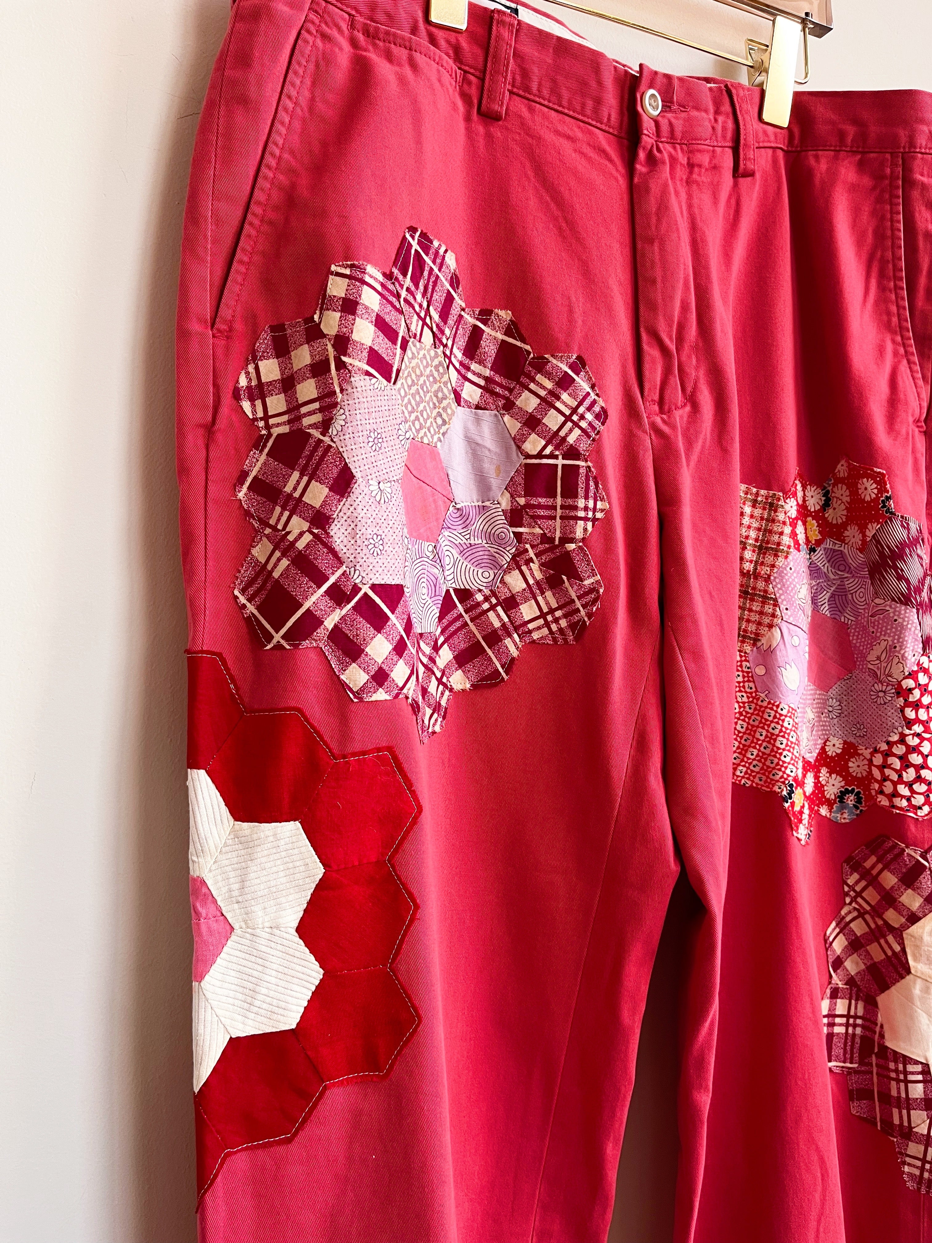 Grandmother’s Garden Quilt Block Applique Red Chinos (Reworked)