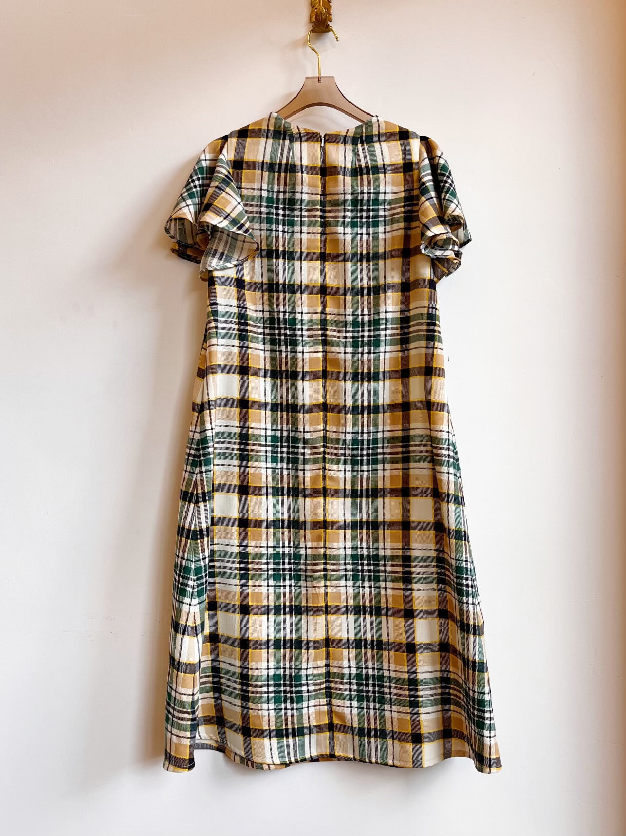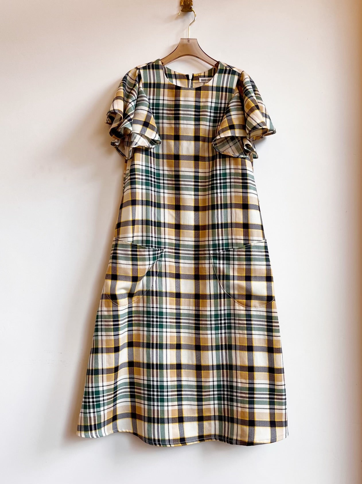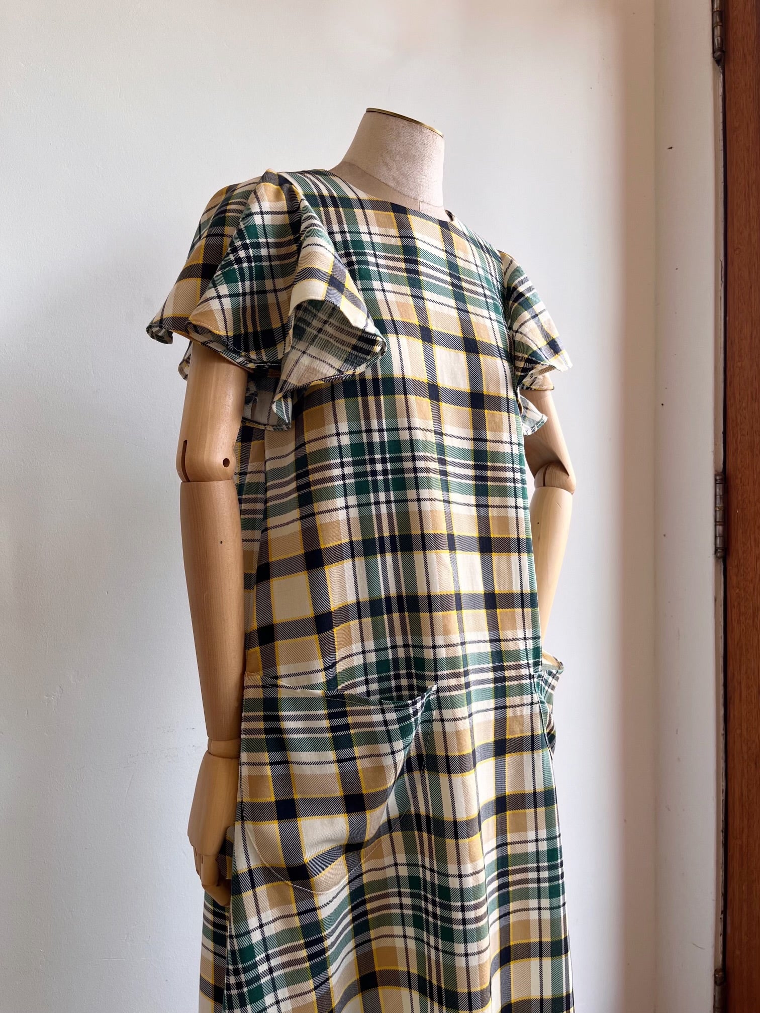Green, Tan, Yellow, Cream, and Black Plaid Chore Dress with Flutter Sleeve