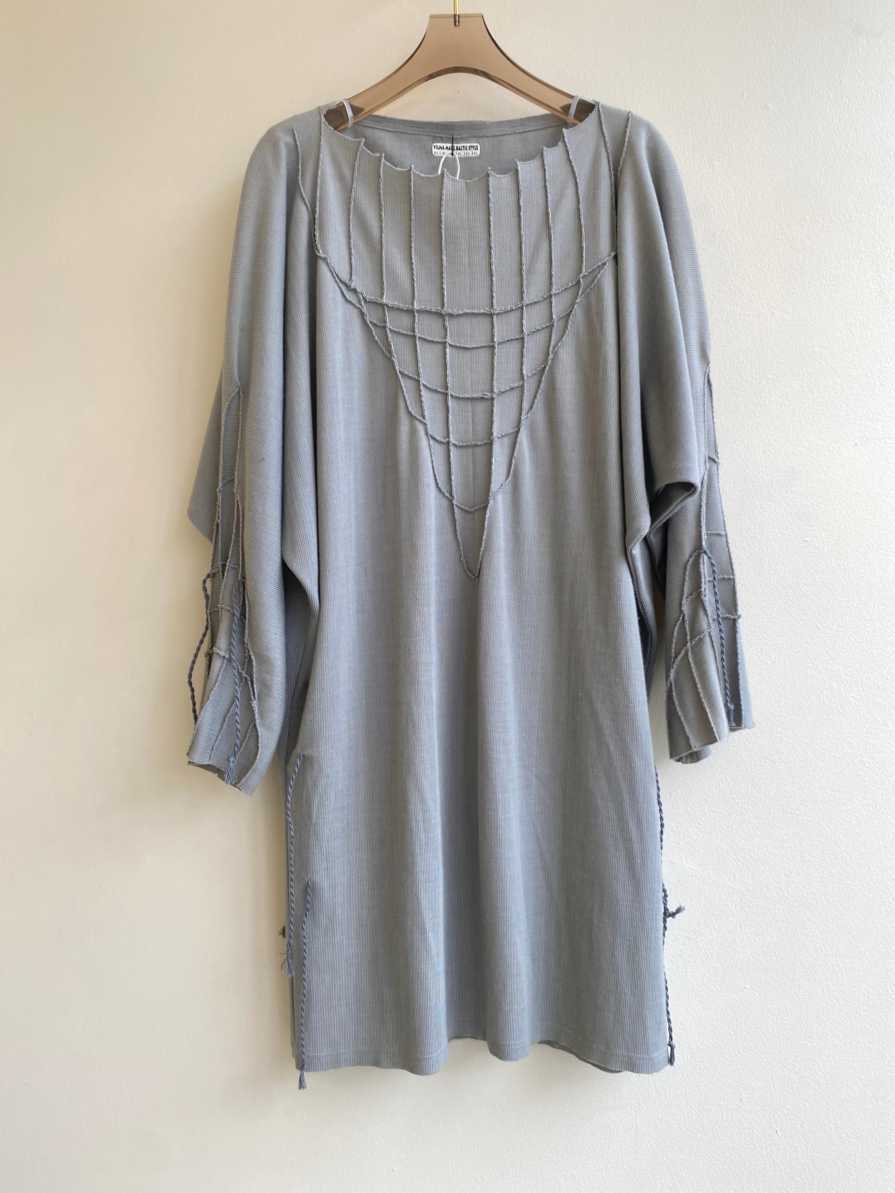 Expertly crafted by designer Vilma Mare, this Grey Dolman Dress offers a unique, handmade touch to your wardrobe. The adjustable sleeve and dress length, along with its 95% viscose fabric, provide both style and comfort. Elevate your look with this individual hand-stitched piece.