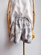 Our unisex MXH Town Shorts are the quintessential easygoing garment, designed and sewn right here in our Catskill atelier. The triple-channel elastic waistband looks polished and lies flat, while being as comfortable as pajamas. And the side-seam pockets keep the silhouette clean, so you can dress them up or down, wear them in the city, on the beach, or anywhere in between. This pair was sewn from an amazing textile: A deadstock slate-grey and off-white woven glen plaid, overprinted with a white tropical motif!