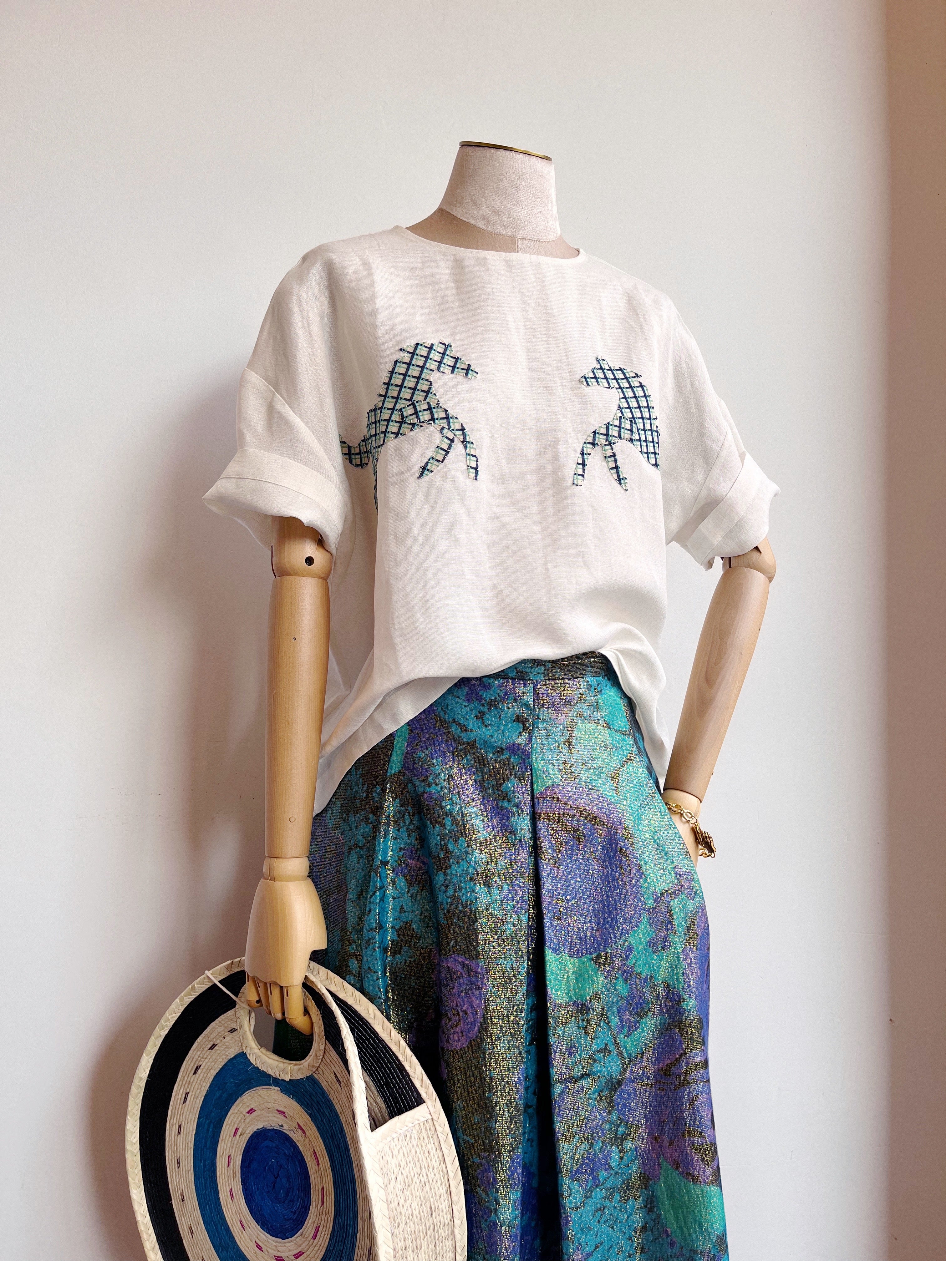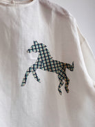An easygoing, oversized, woven cotton tee that hits at mid-hip, with a pair of hand-appliquéd ponies on the chest in blue-green plaid. Features a relaxed drop shoulder and keyhole opening at the center back.
