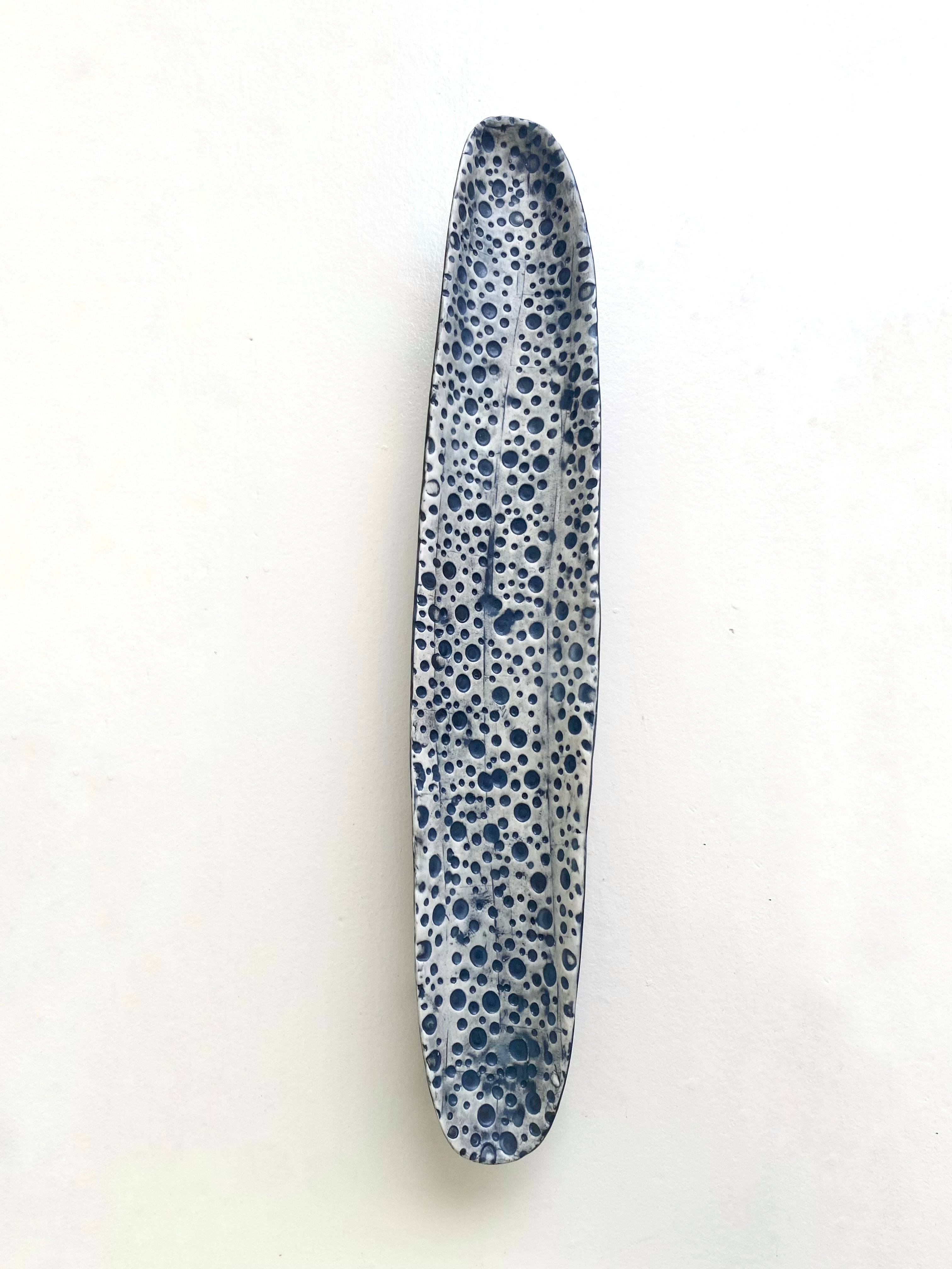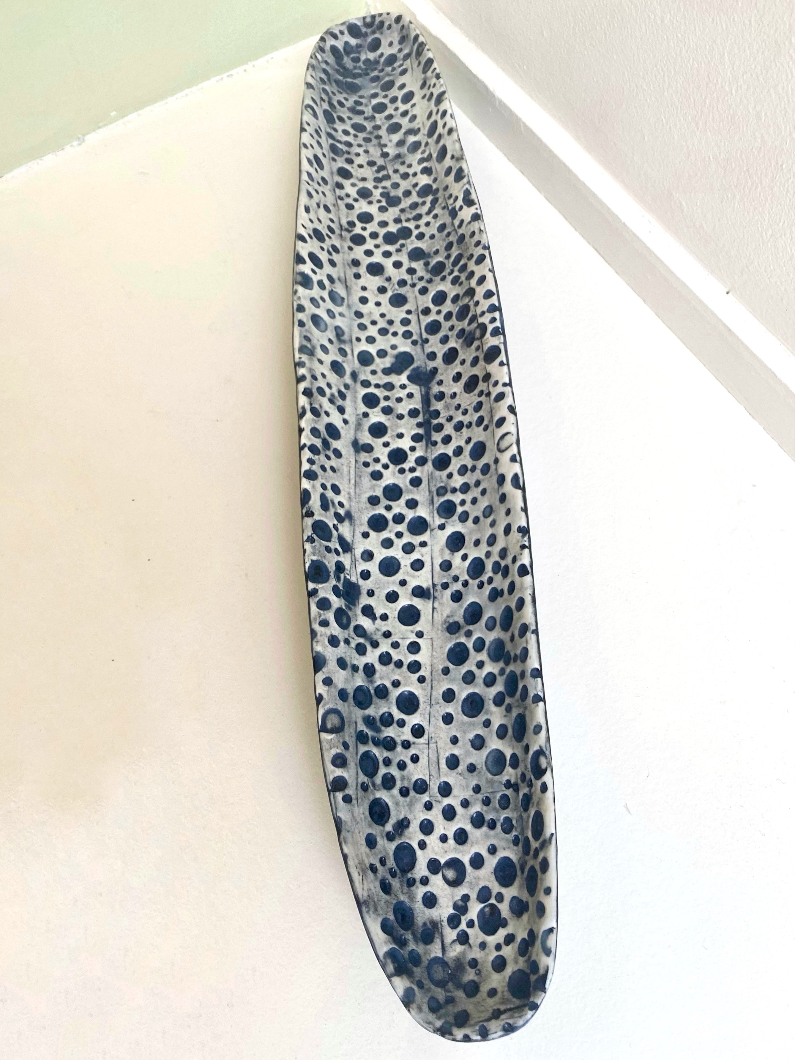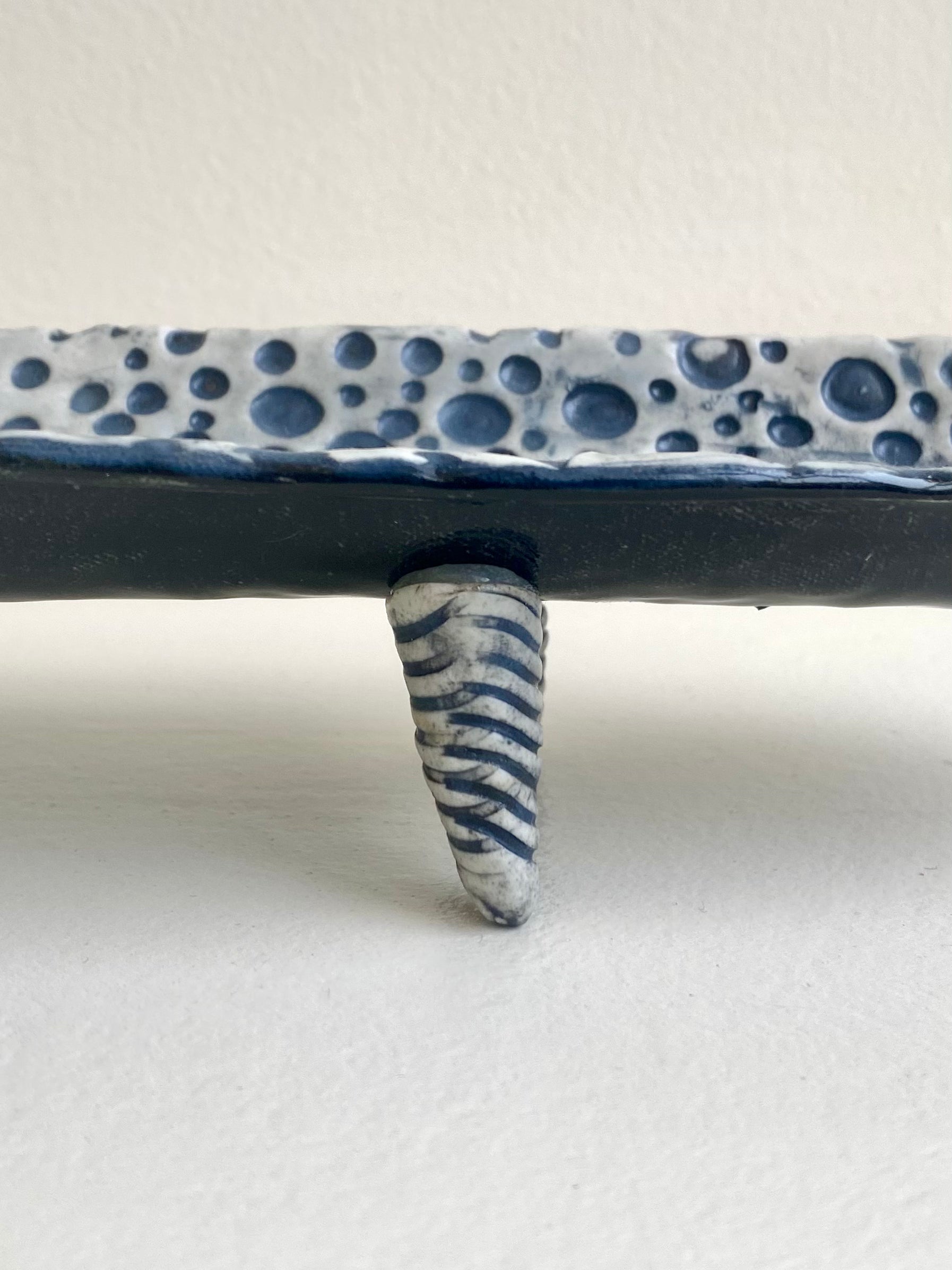 Add a touch of whimsy to your table or credenza with this hand crafte, unique one of a kind decorative spotted tray. Hand-carved by Laura Ann Jacobs Ceramics this piece has quirky legs to hold it off of a table that is placed upon. Made in Hudson, New York, this women-owned business brings charm and personality to your home.