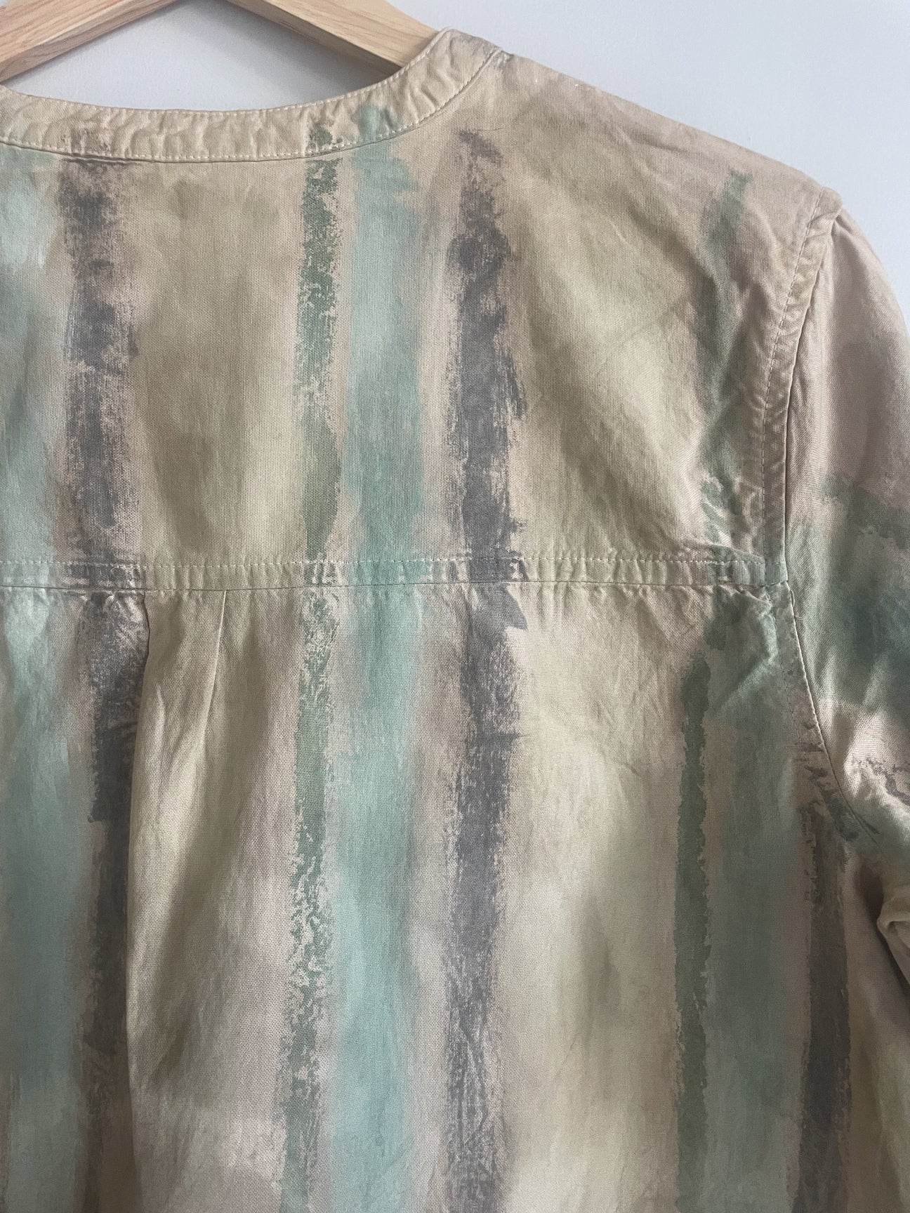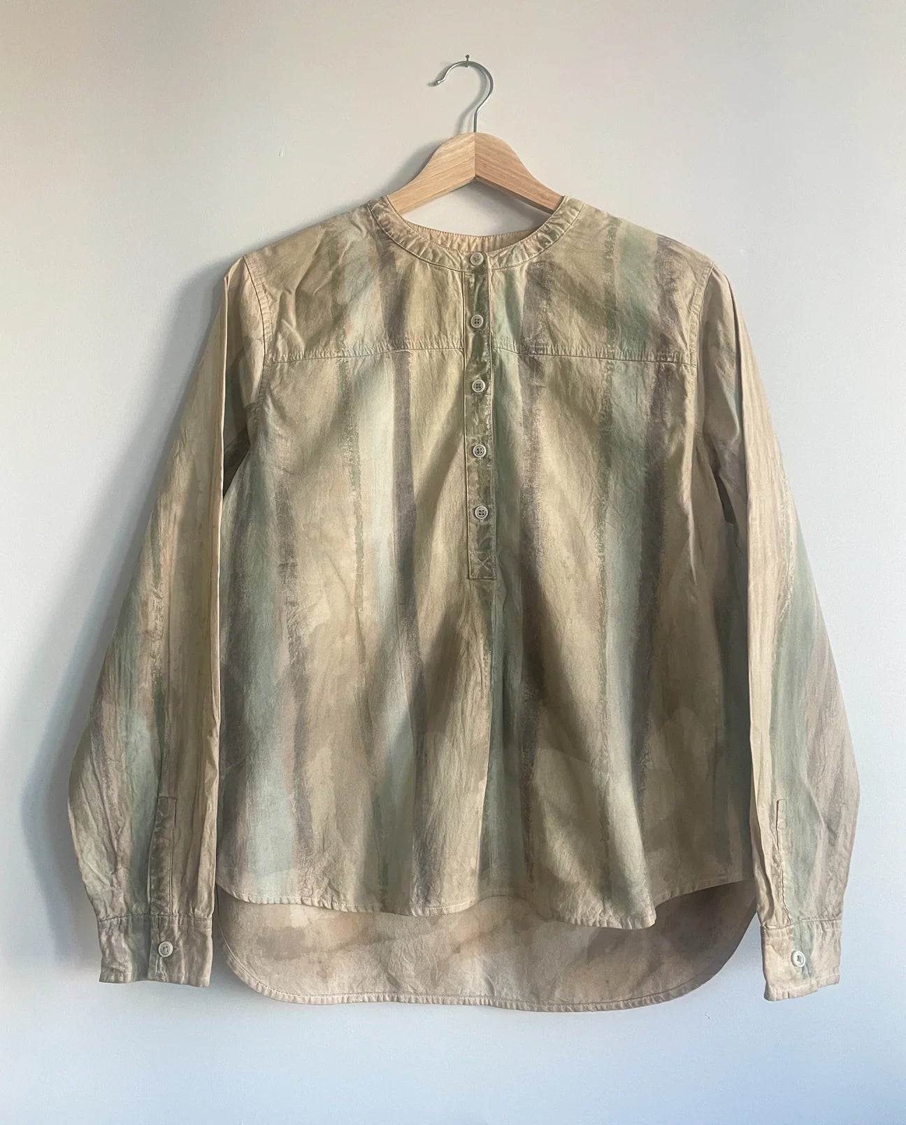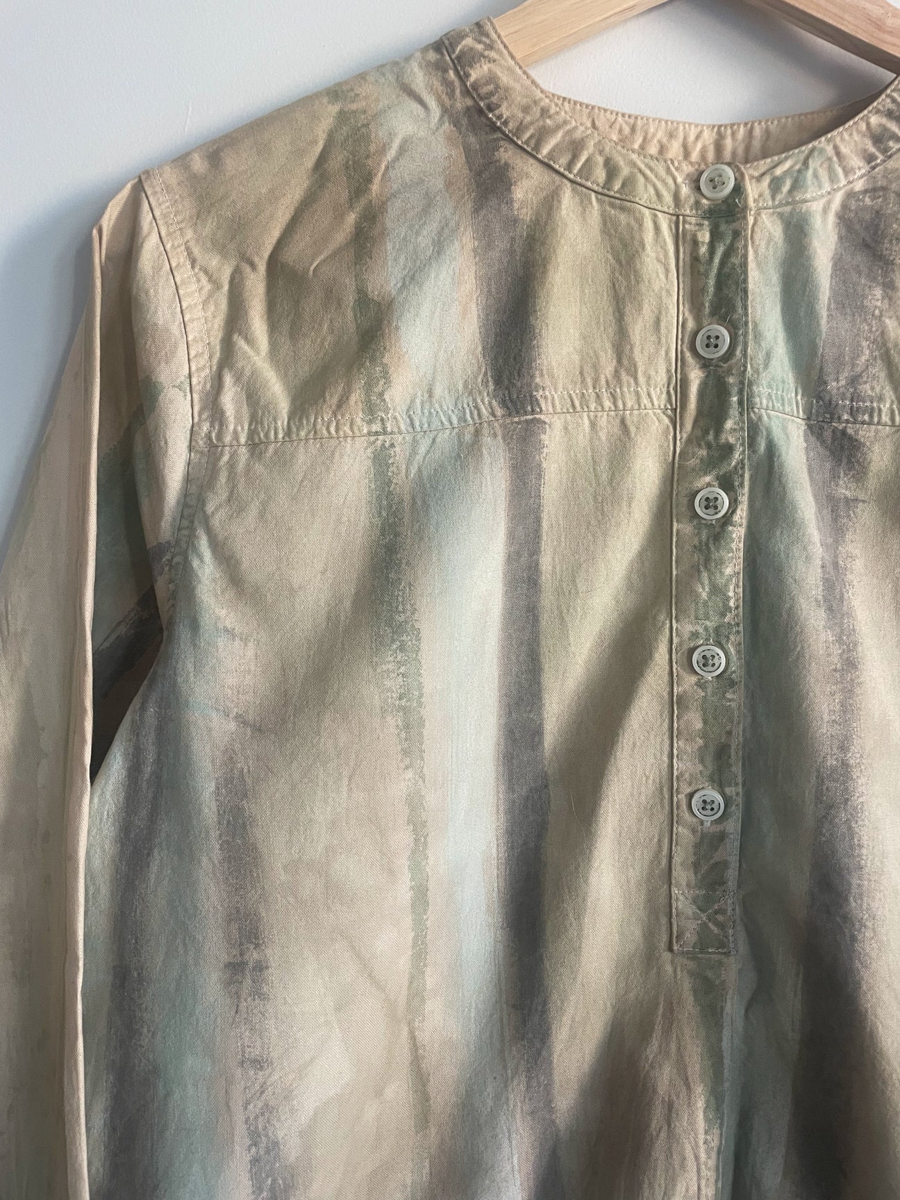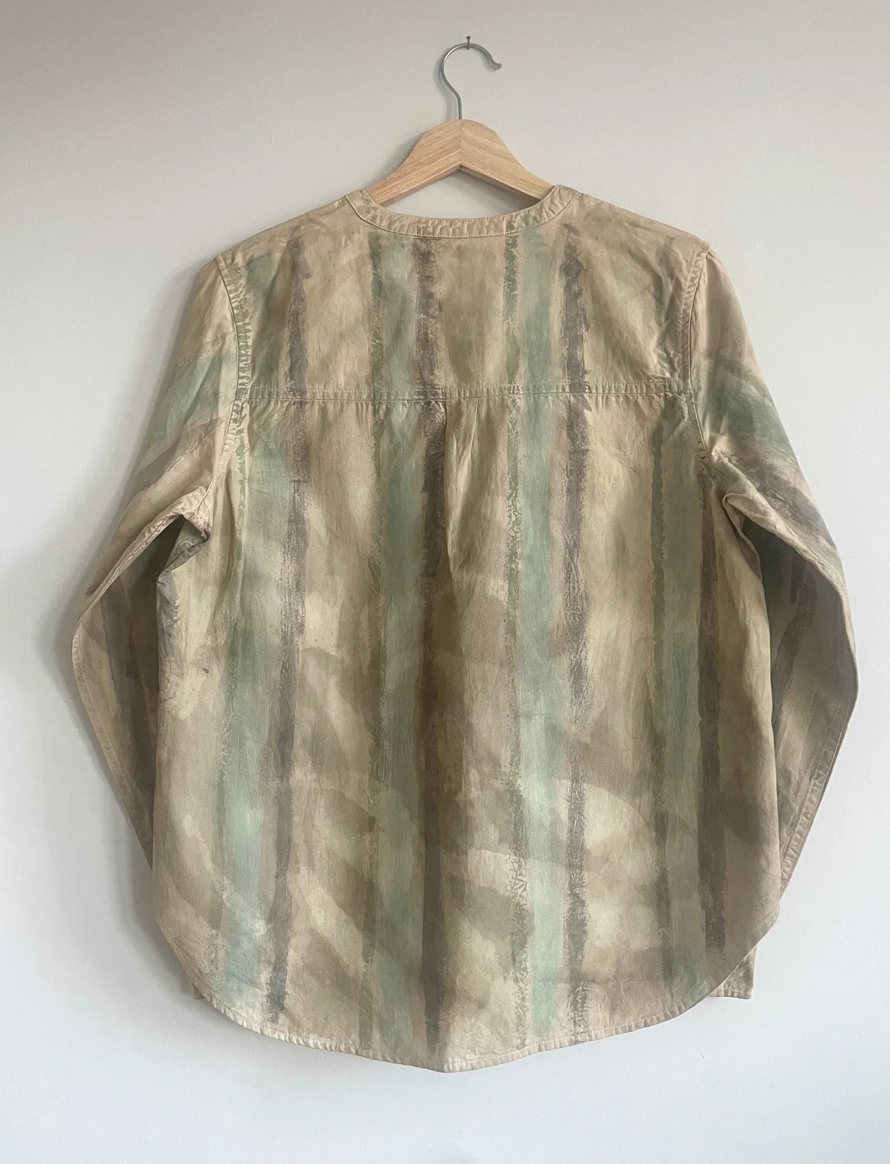 * This upcycled cotton three quarter button up is hand dyed with an exhausted eucalyptus bath, which gives it an earthy base. Then hand-painted using natural earth pigments in a one-of-a-kind leaf motif.