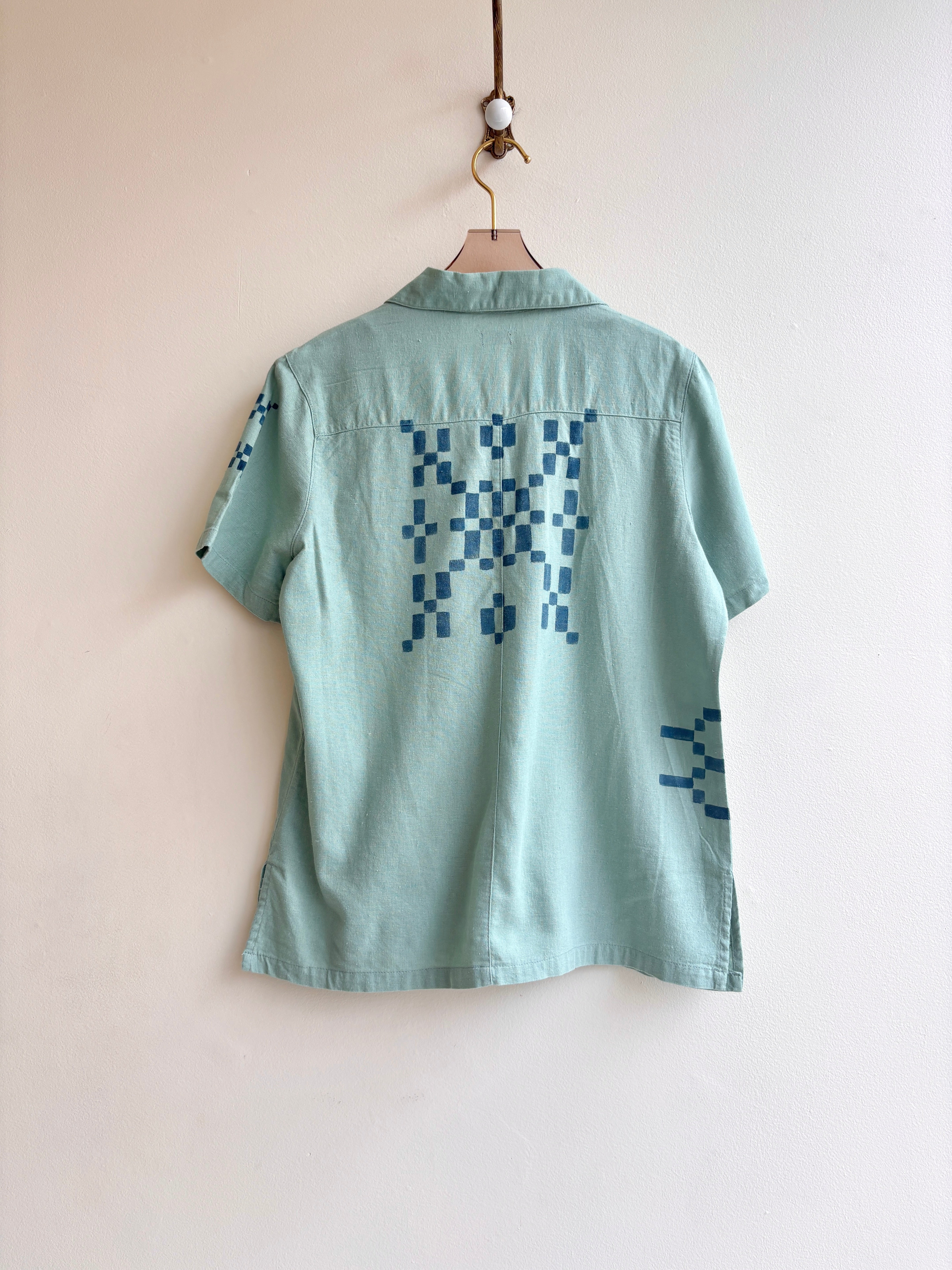 Hand Painted Sea Foam Woven Checker Motif Short Sleeve Top (Reworked)