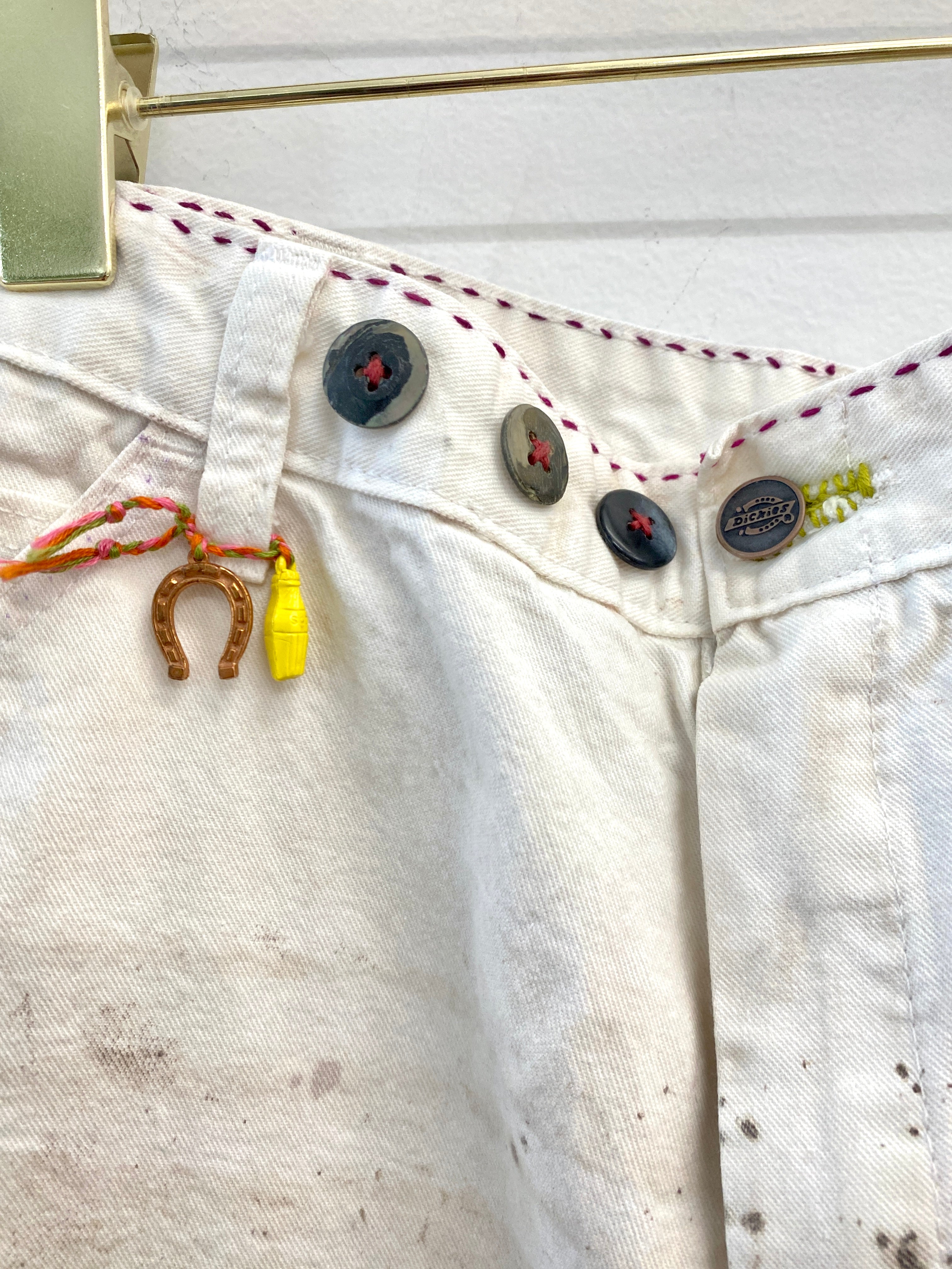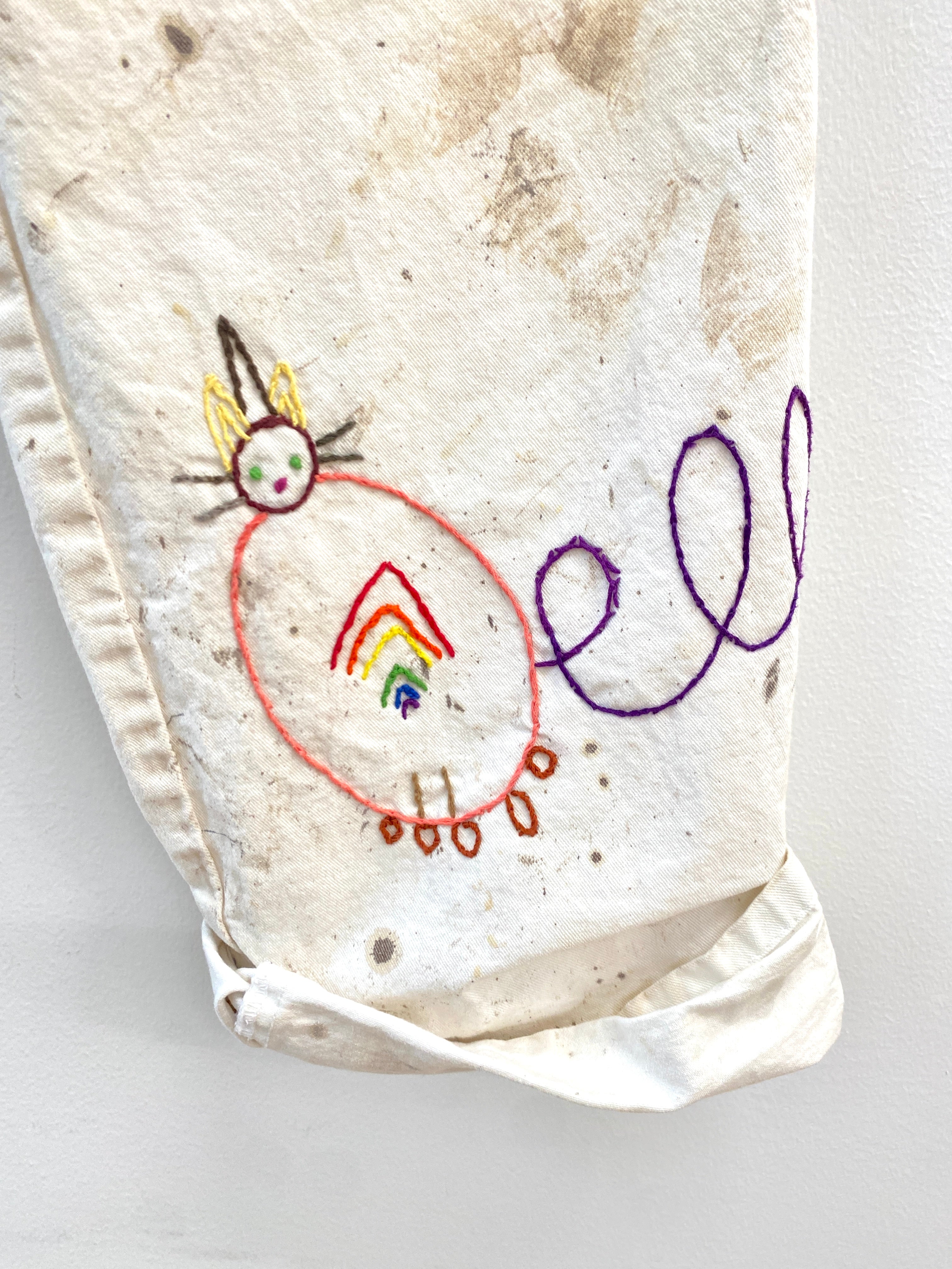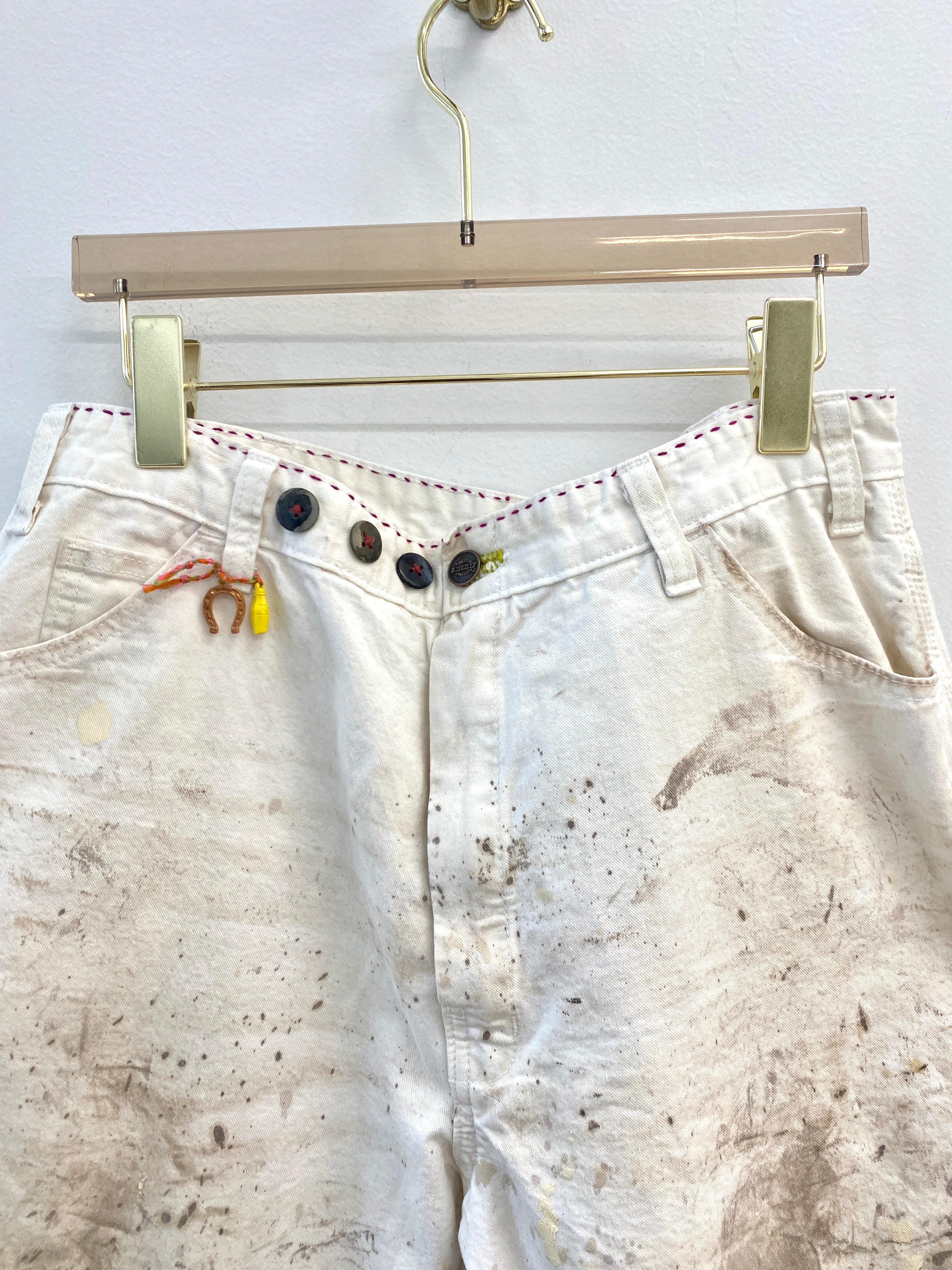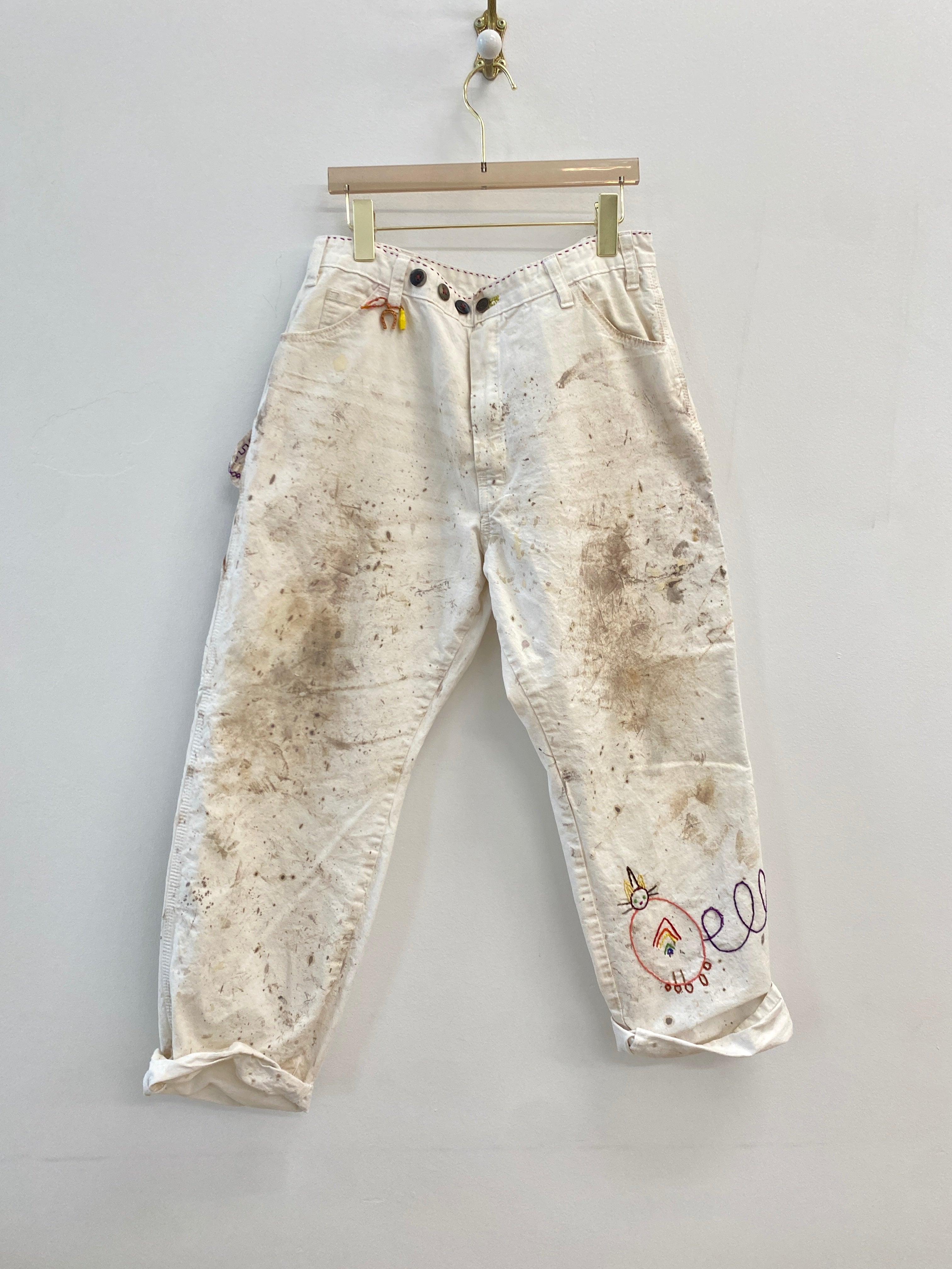 Gender-neutral, hand-embellished painters’ pants with multiple buttons for adjustable fit.