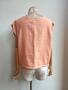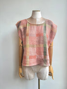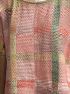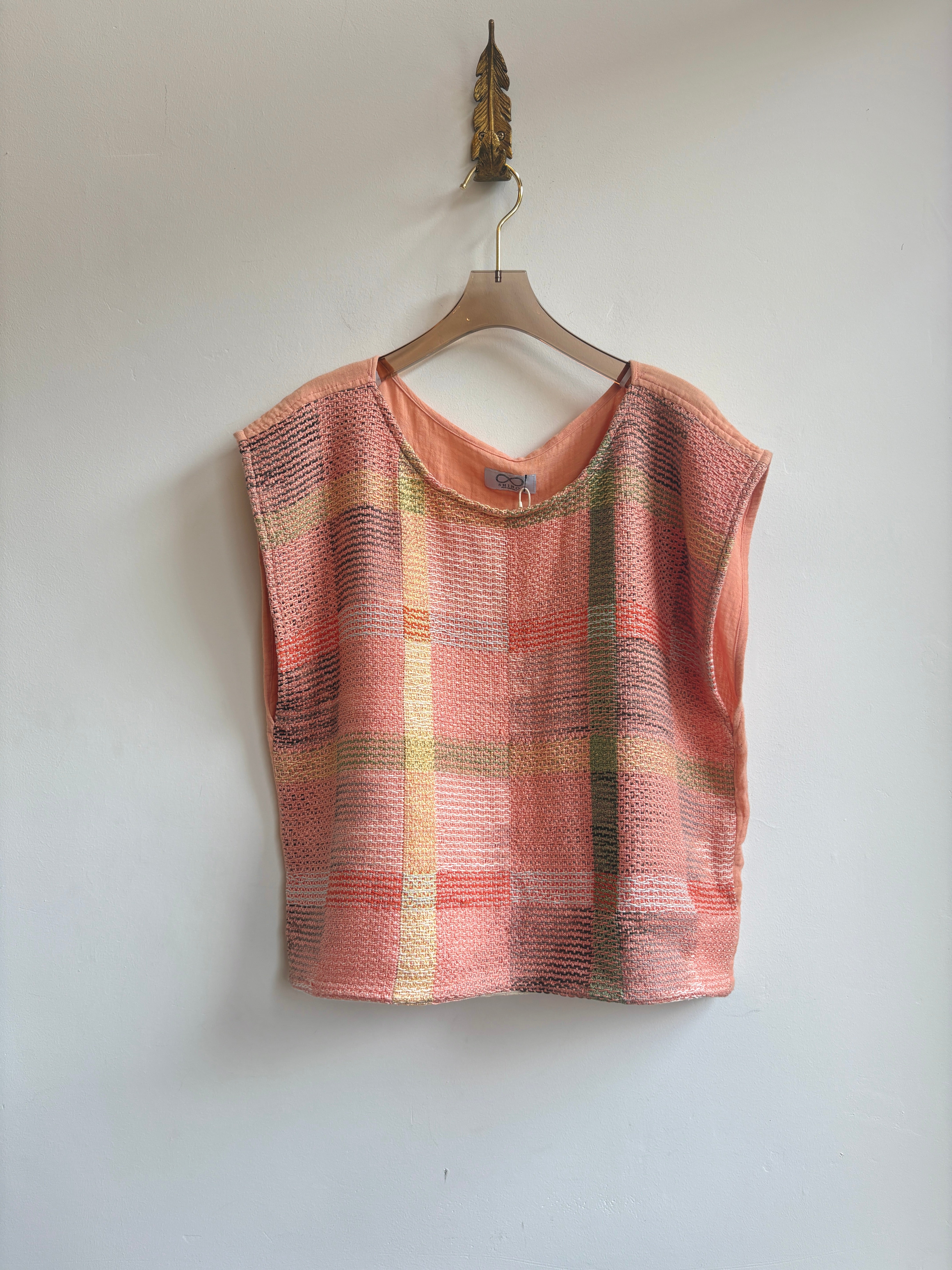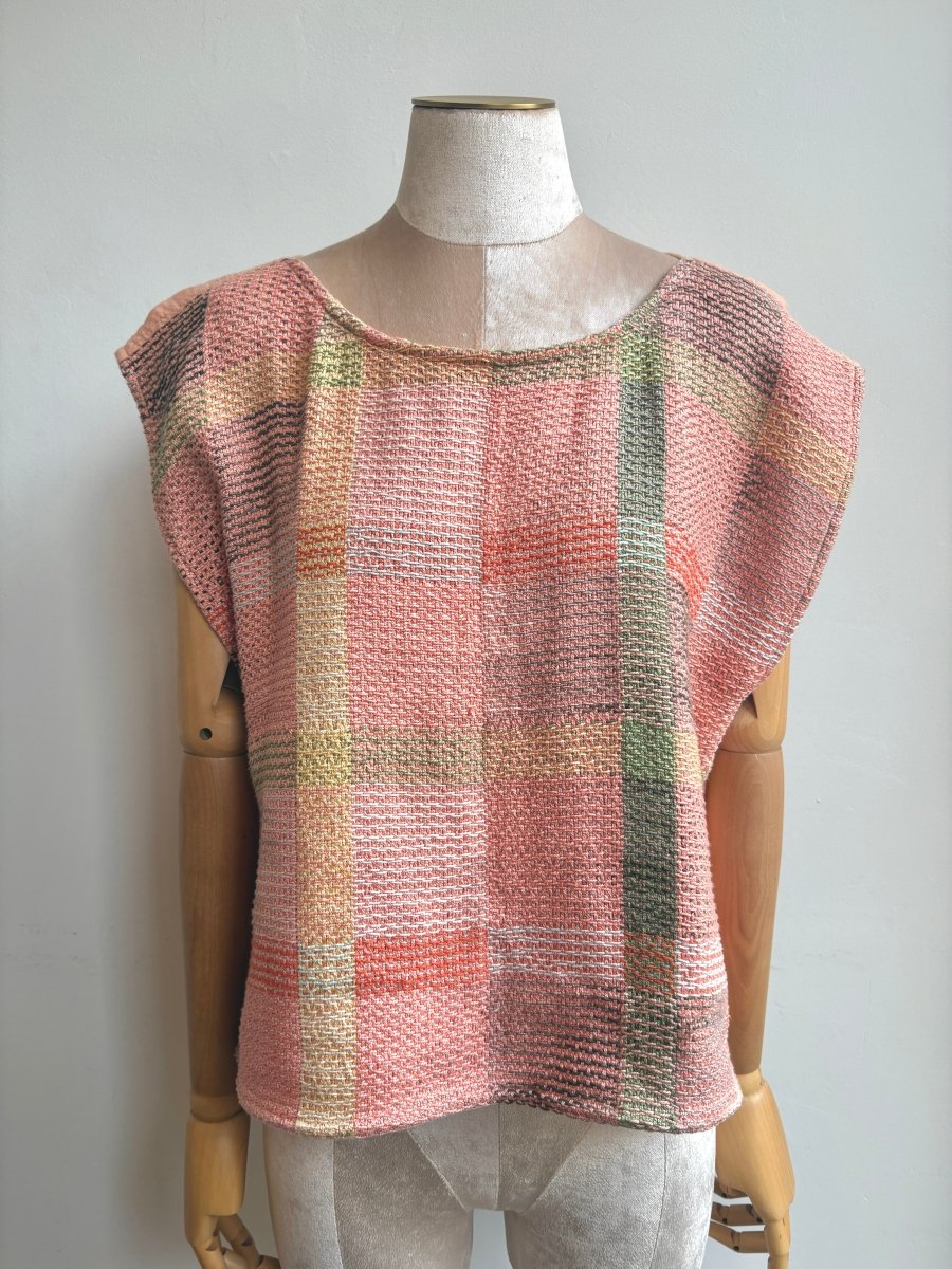 - Box top with handwoven front in shades of coral, green, and tan with a blush lightweight back